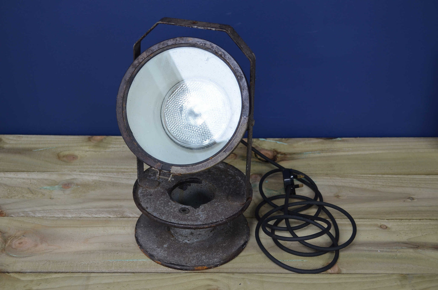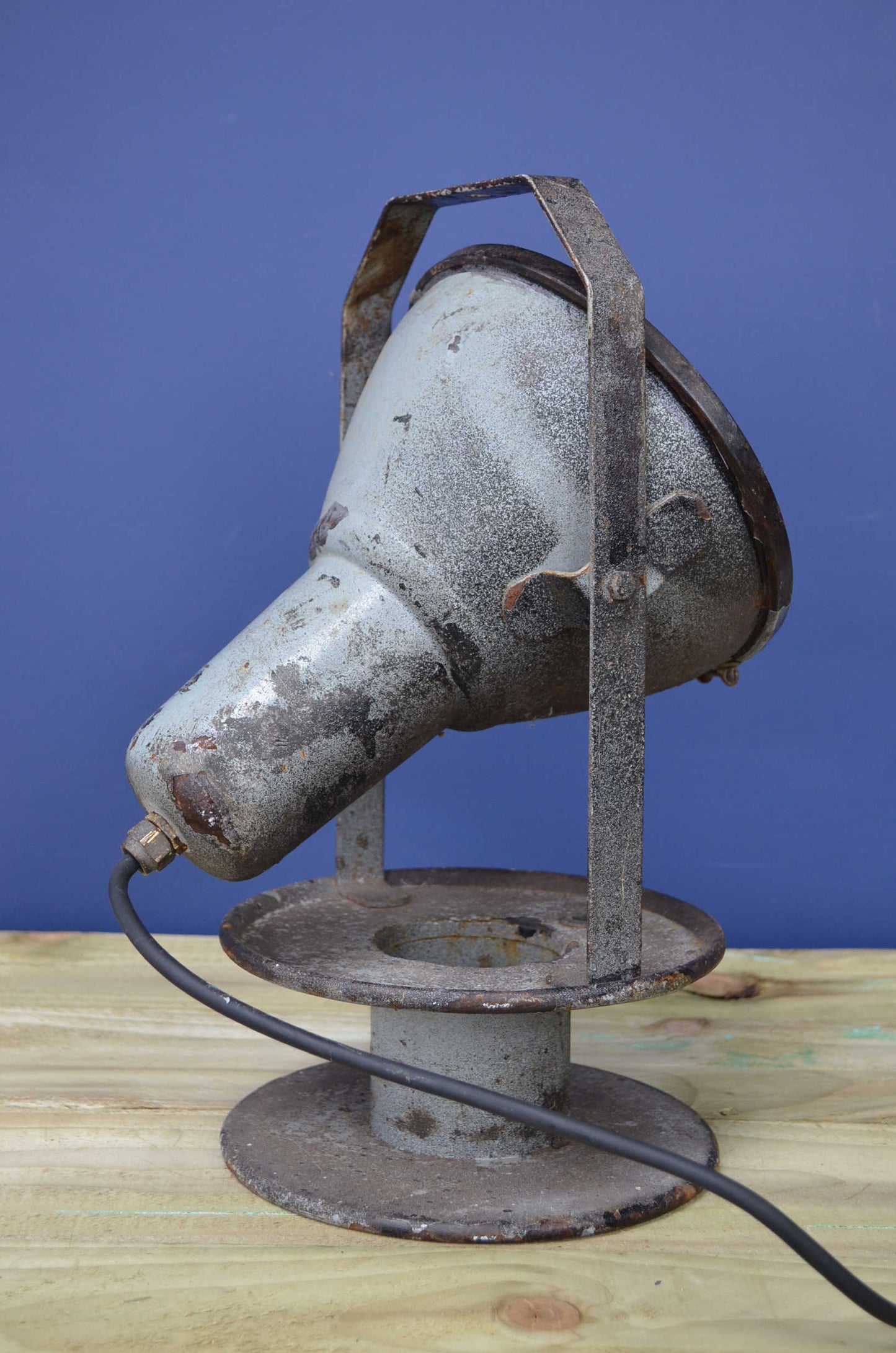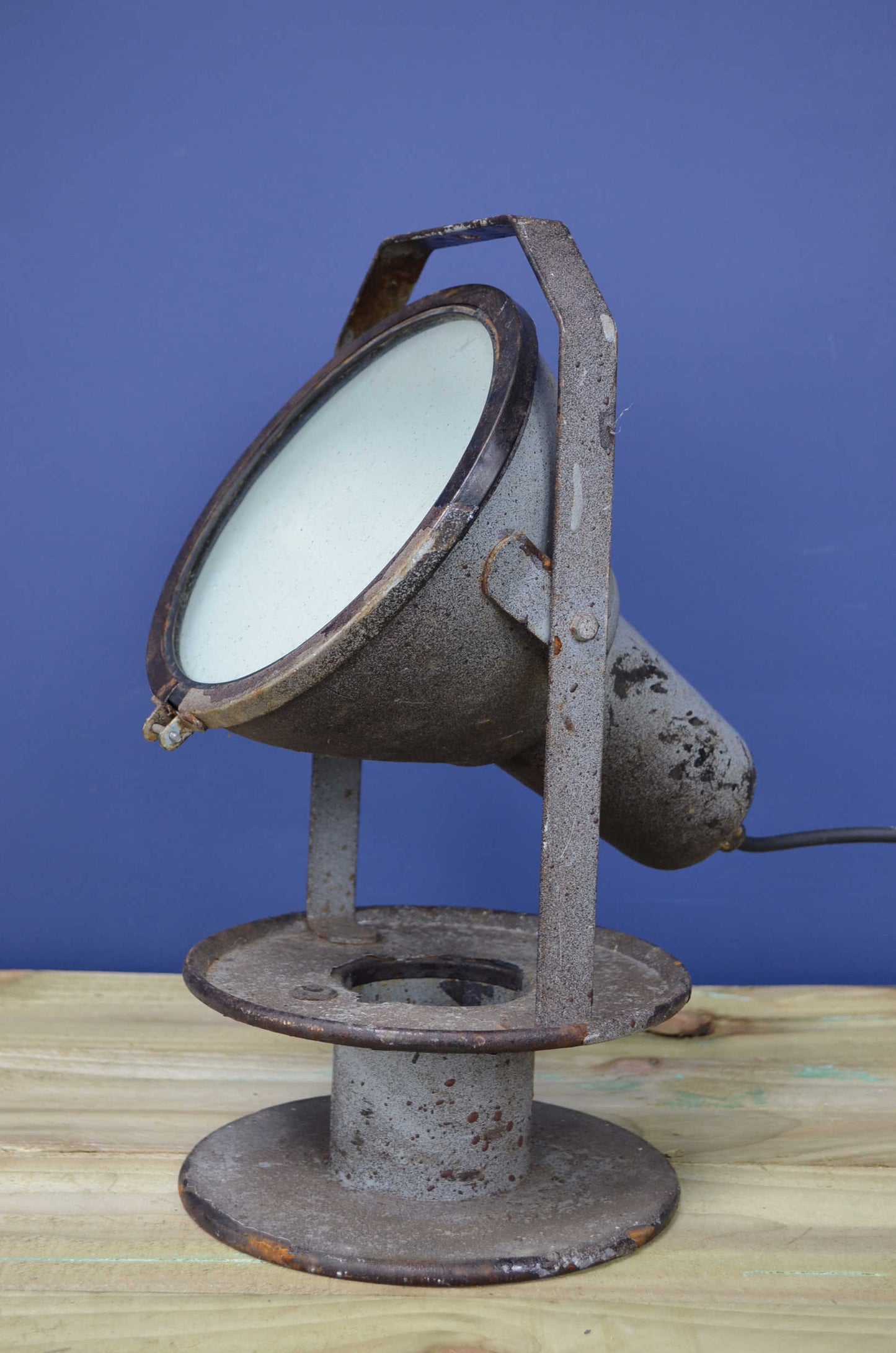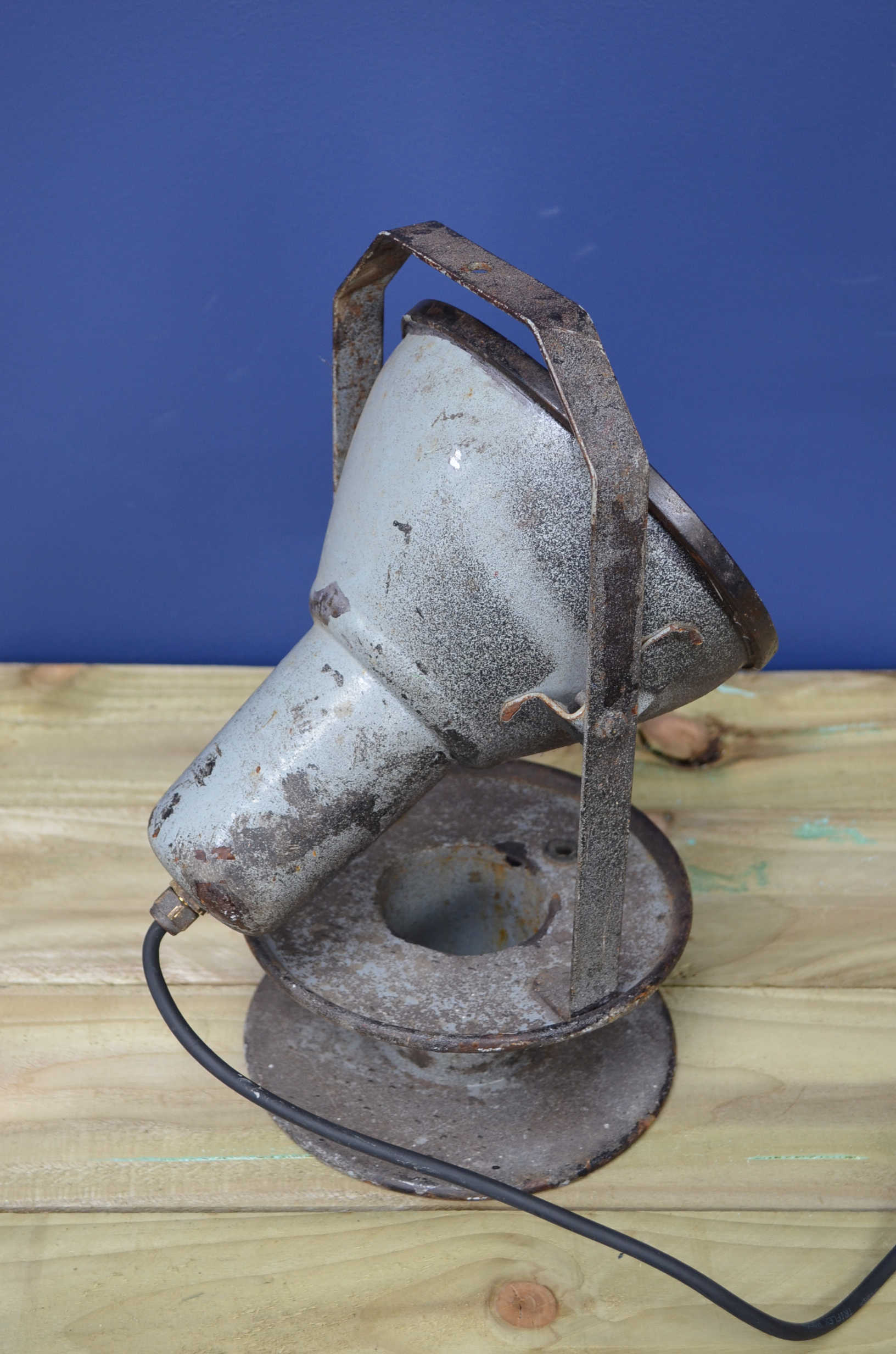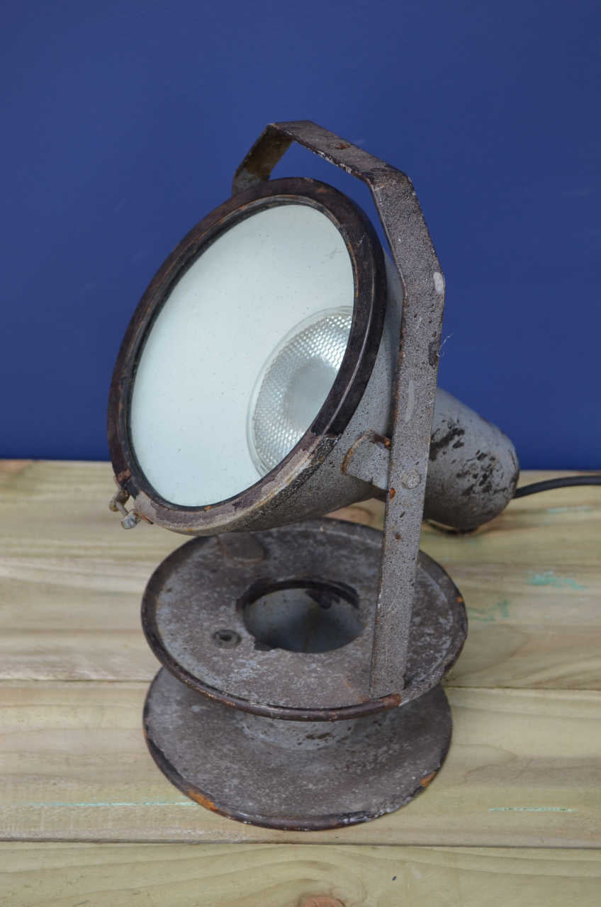 Heavy industrial search/spotlight. Constructed from a cast metal casing raised on an adjustable strap handle and cast metal base. Covered in paint spots from its past life, loads of character and un-messed with by us.
