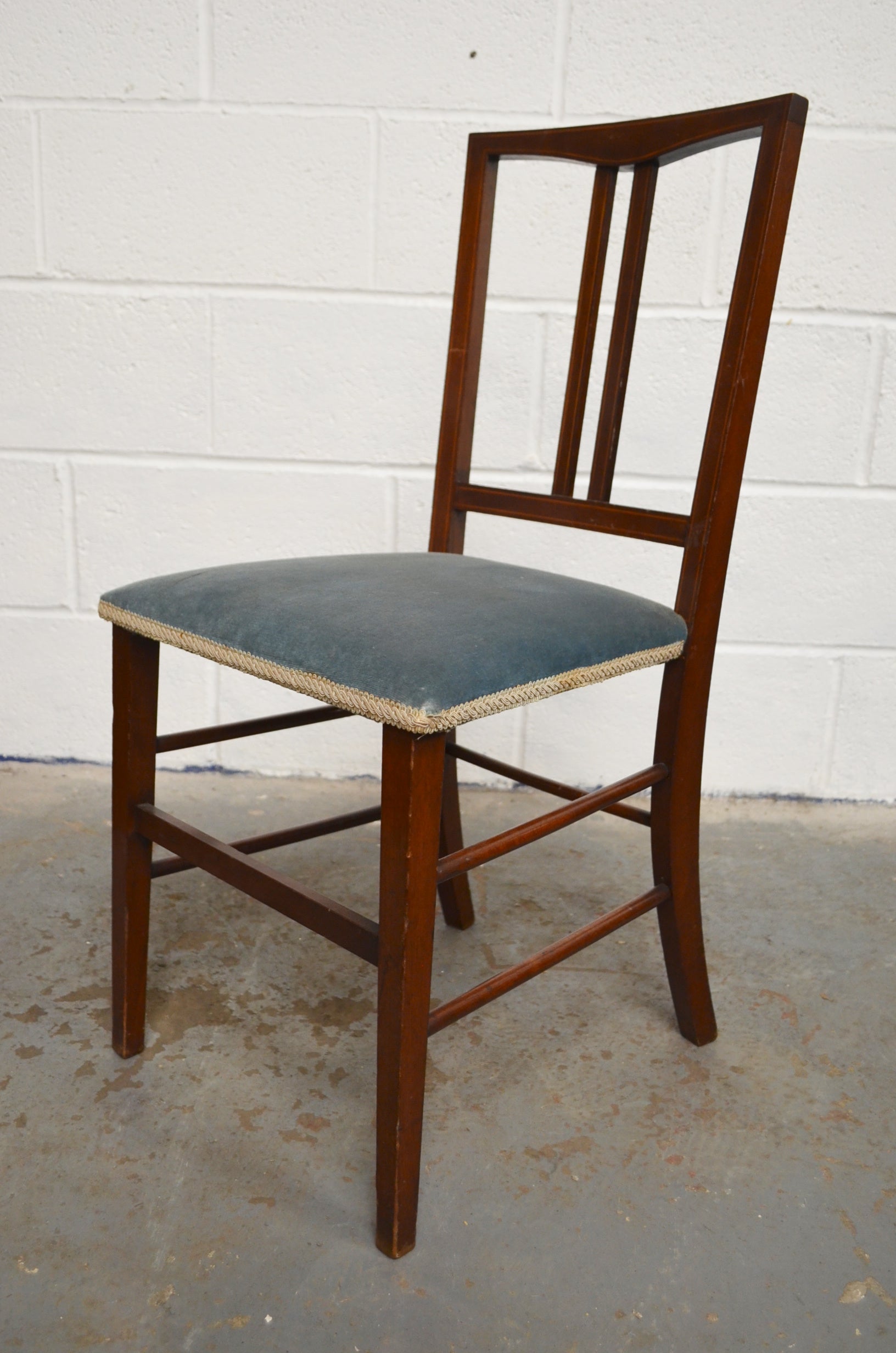 A almost pair of Edwardian mahogany dining chairs with stick backs and string inlaid detail, over upholstered seats with trim, raised on square tapered supports.