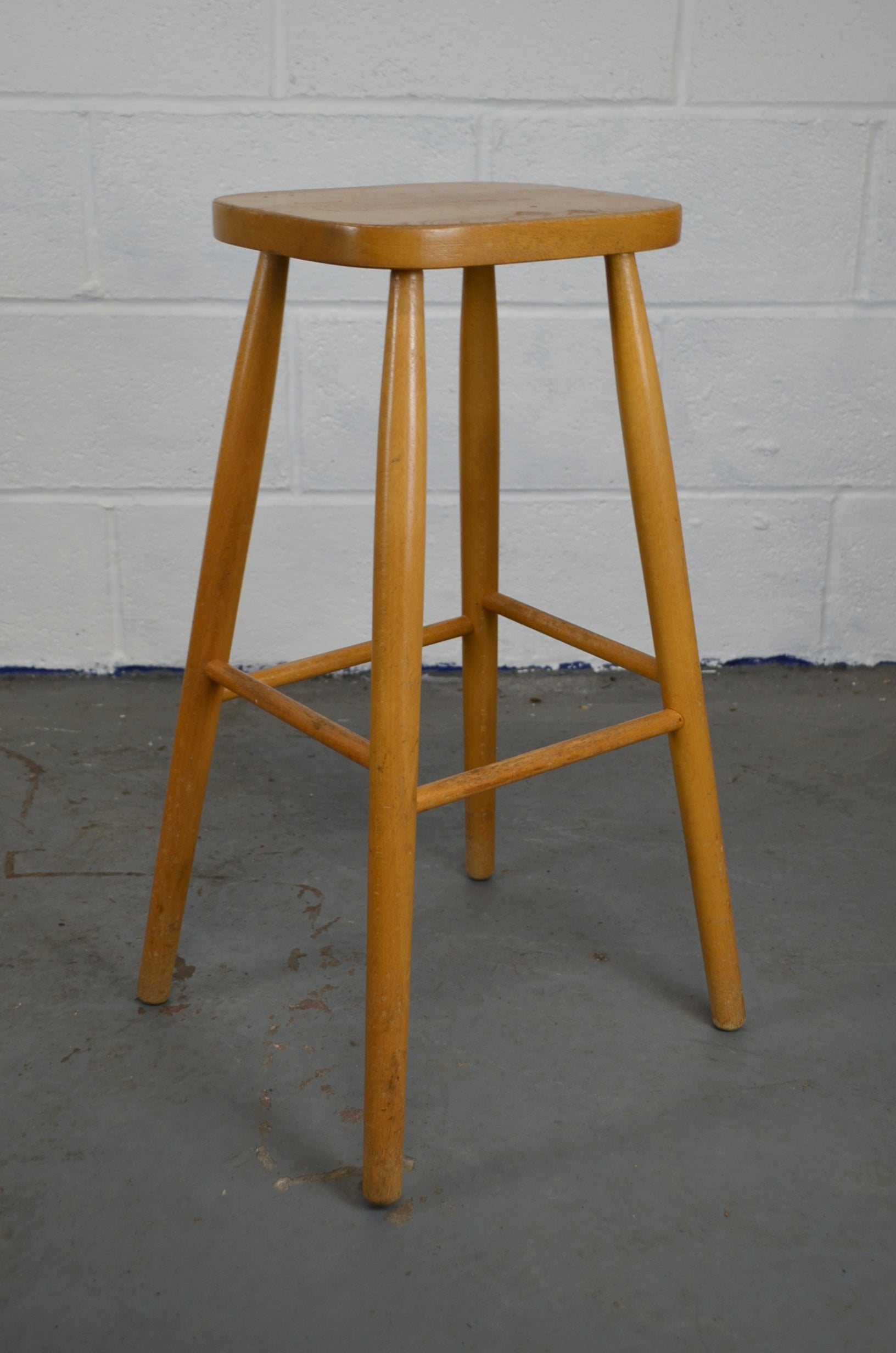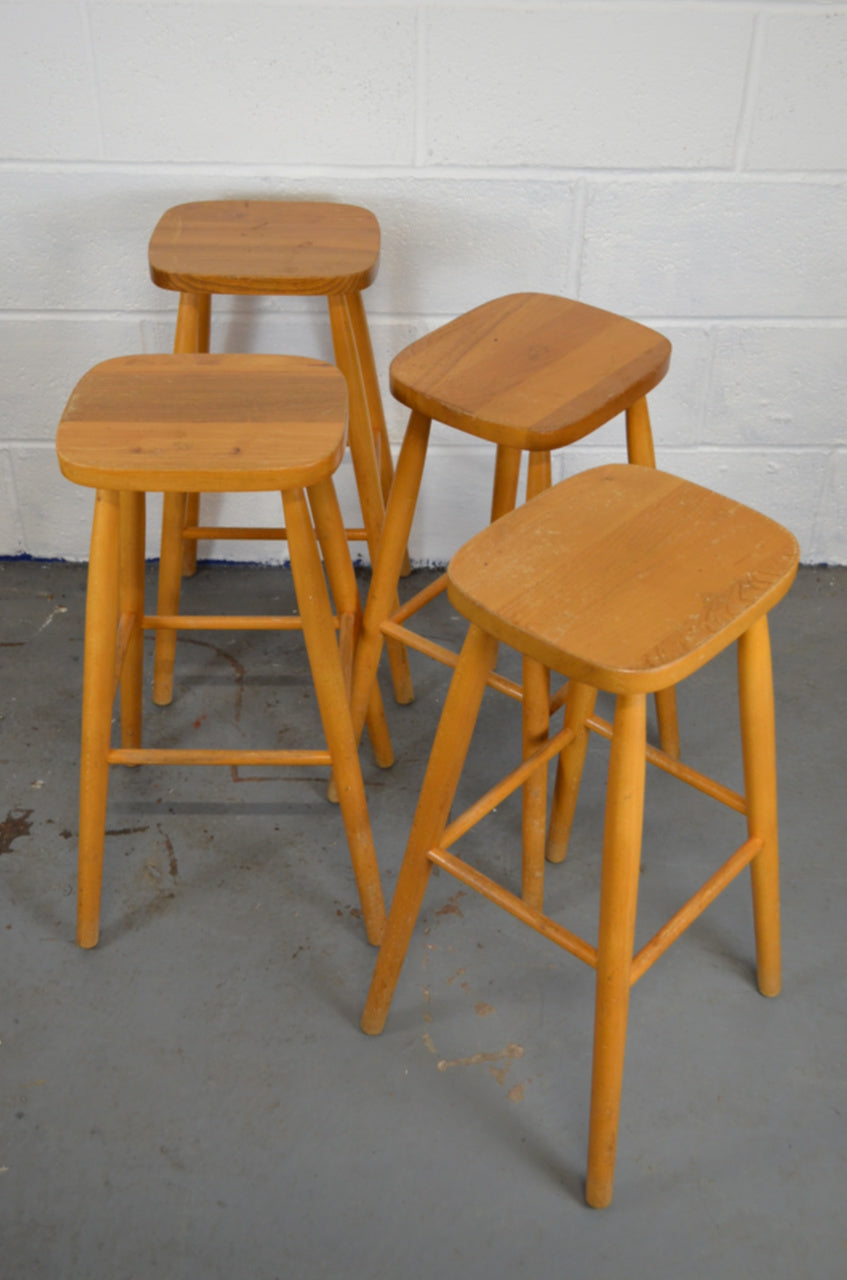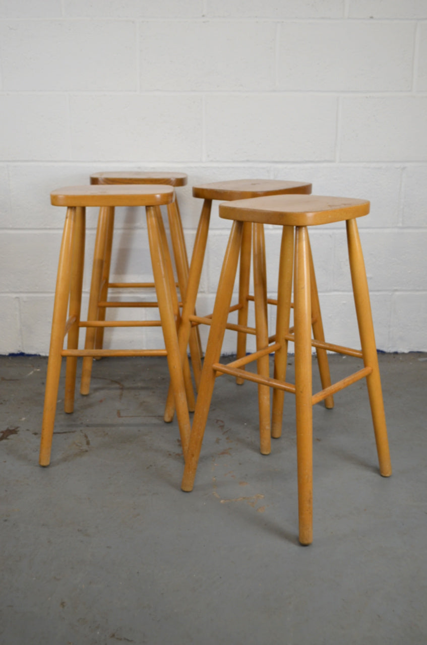 A set of four retro vintage wooden bar/kitchen stools with shaped seats on turned legs and stretchers.