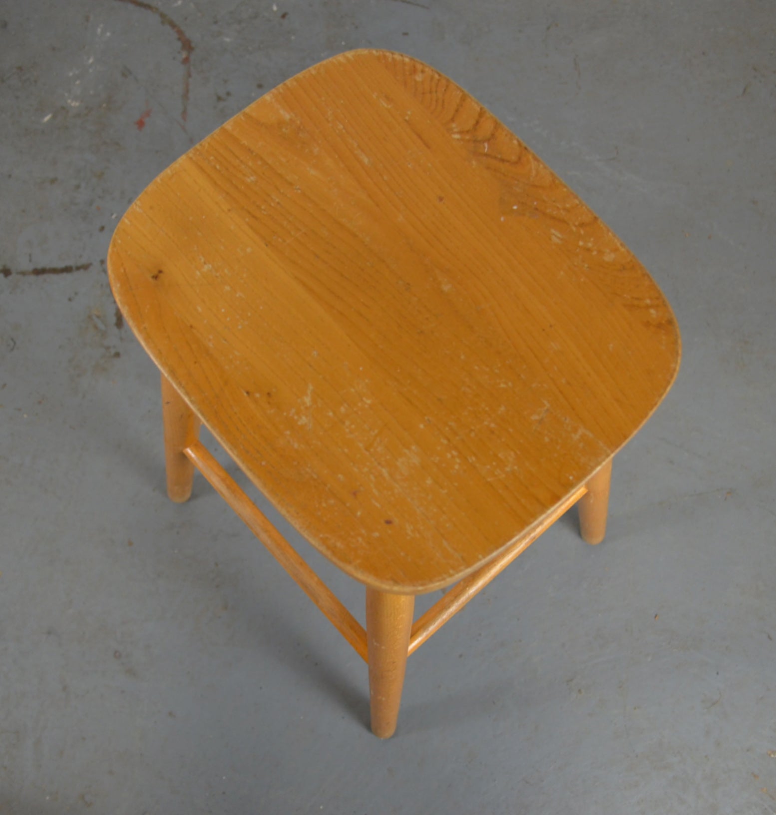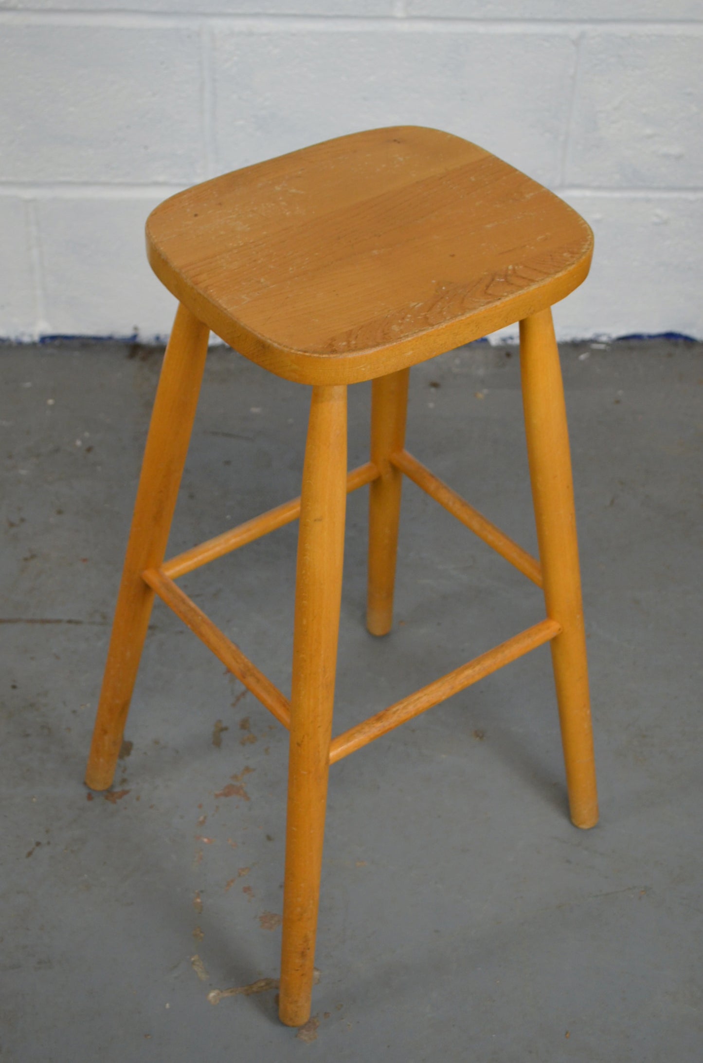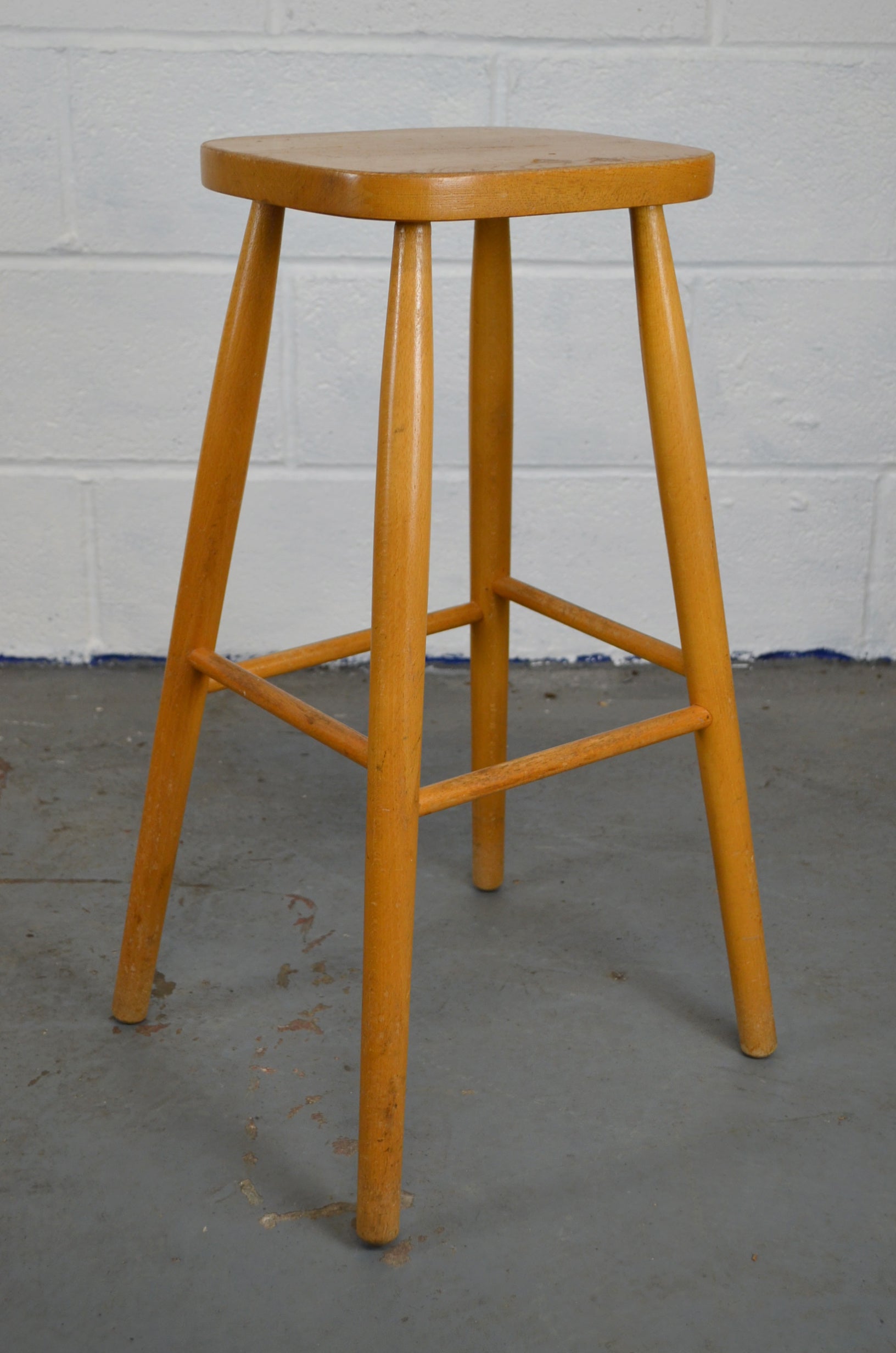 A set of four retro vintage wooden bar/kitchen stools with shaped seats on turned legs and stretchers.