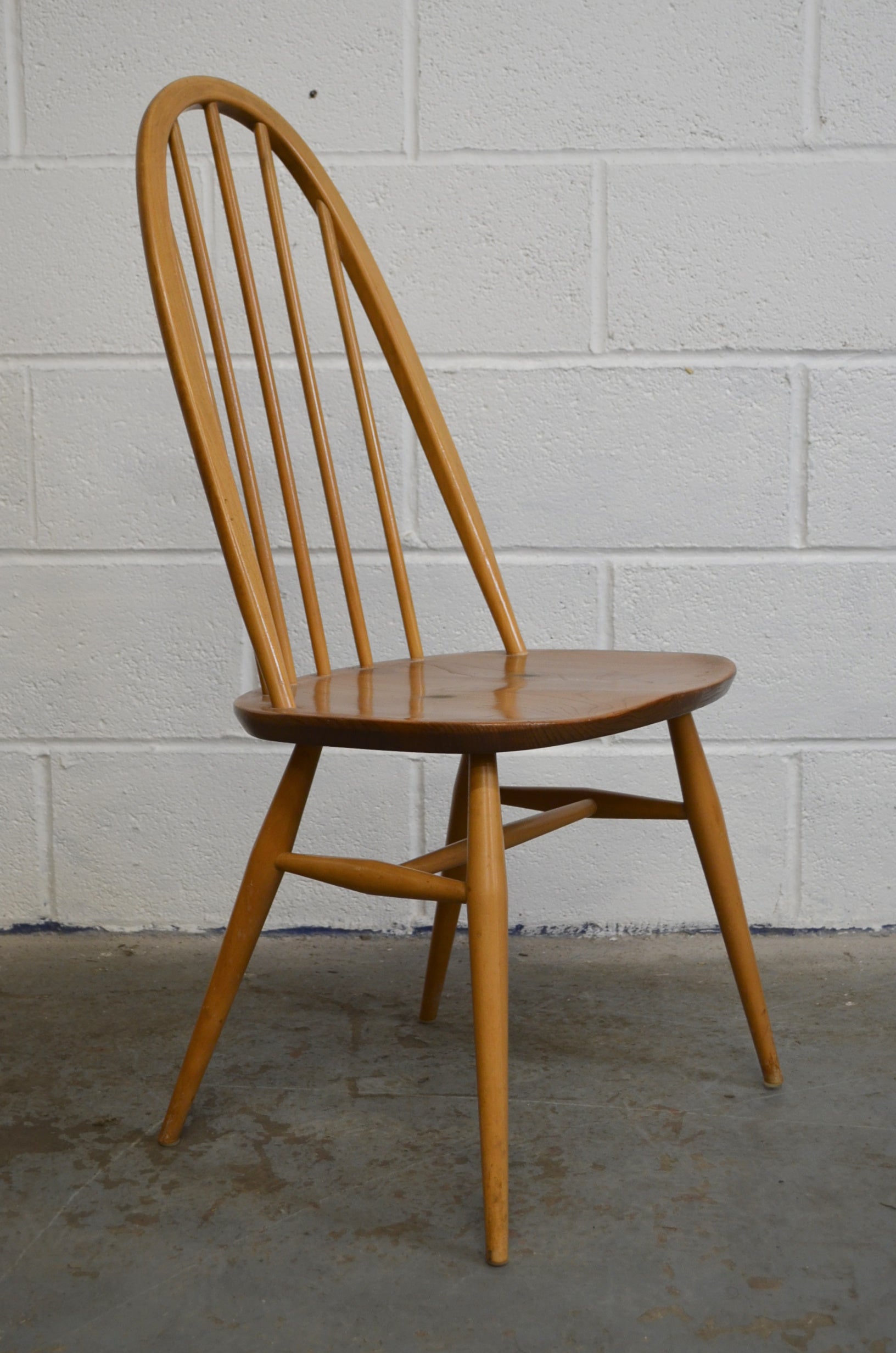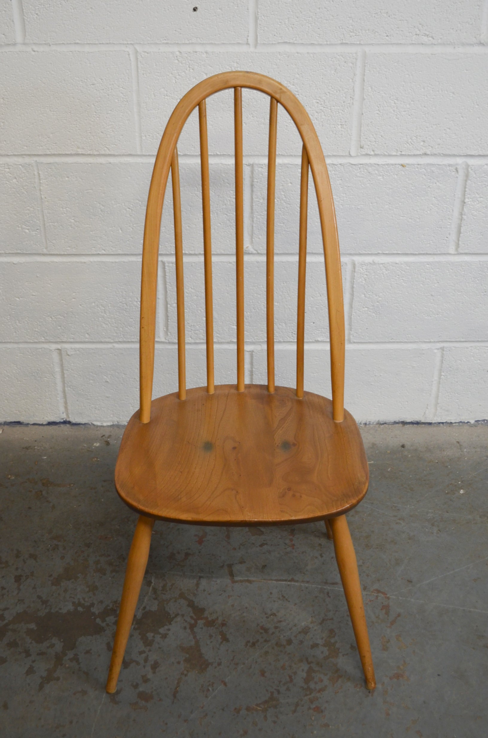 A set of four vintage mid 20th century beech and elm Quaker dining chairs. Each having hoop backs with spindles raised over tapering splayed supports.
