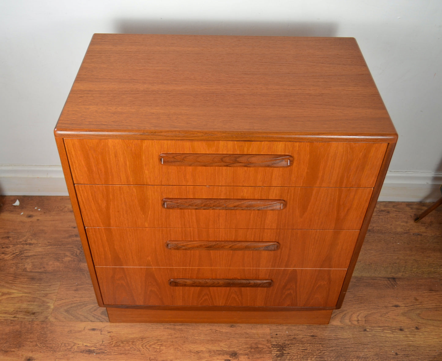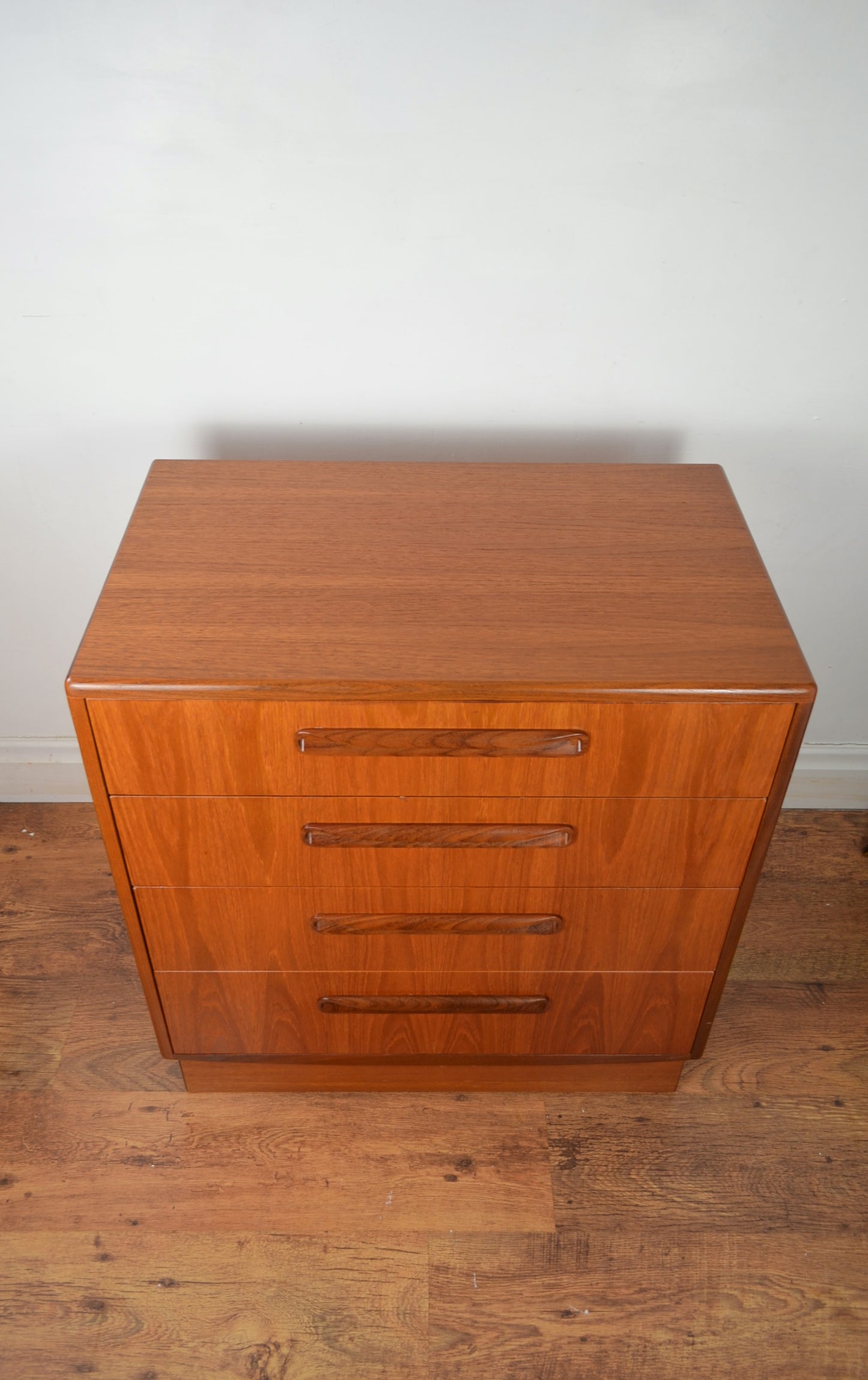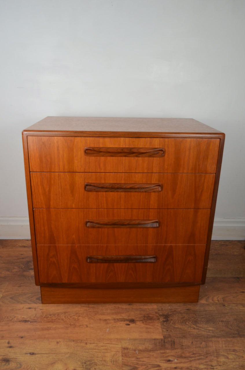 A mid century teak four drawer G-Plan 'Fresco' chest of drawers. Benefiting from iconic handles and a fantastic grain the runs across the front.