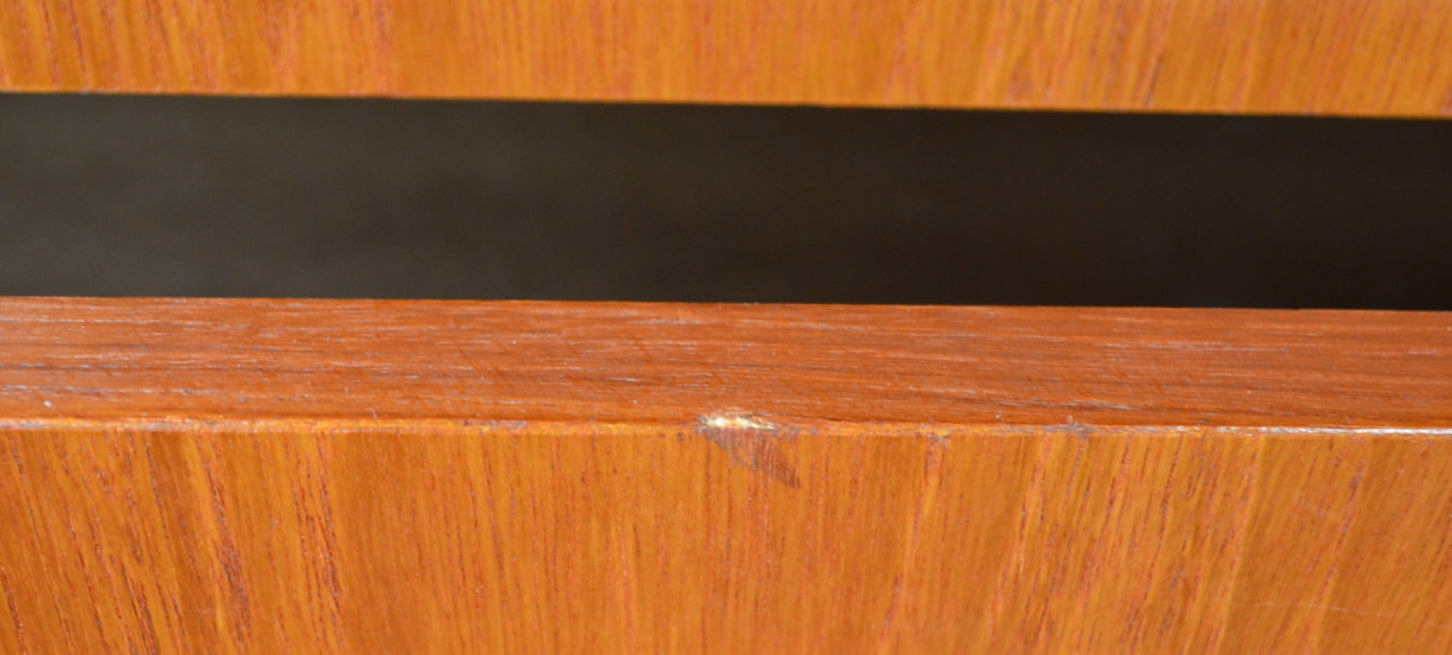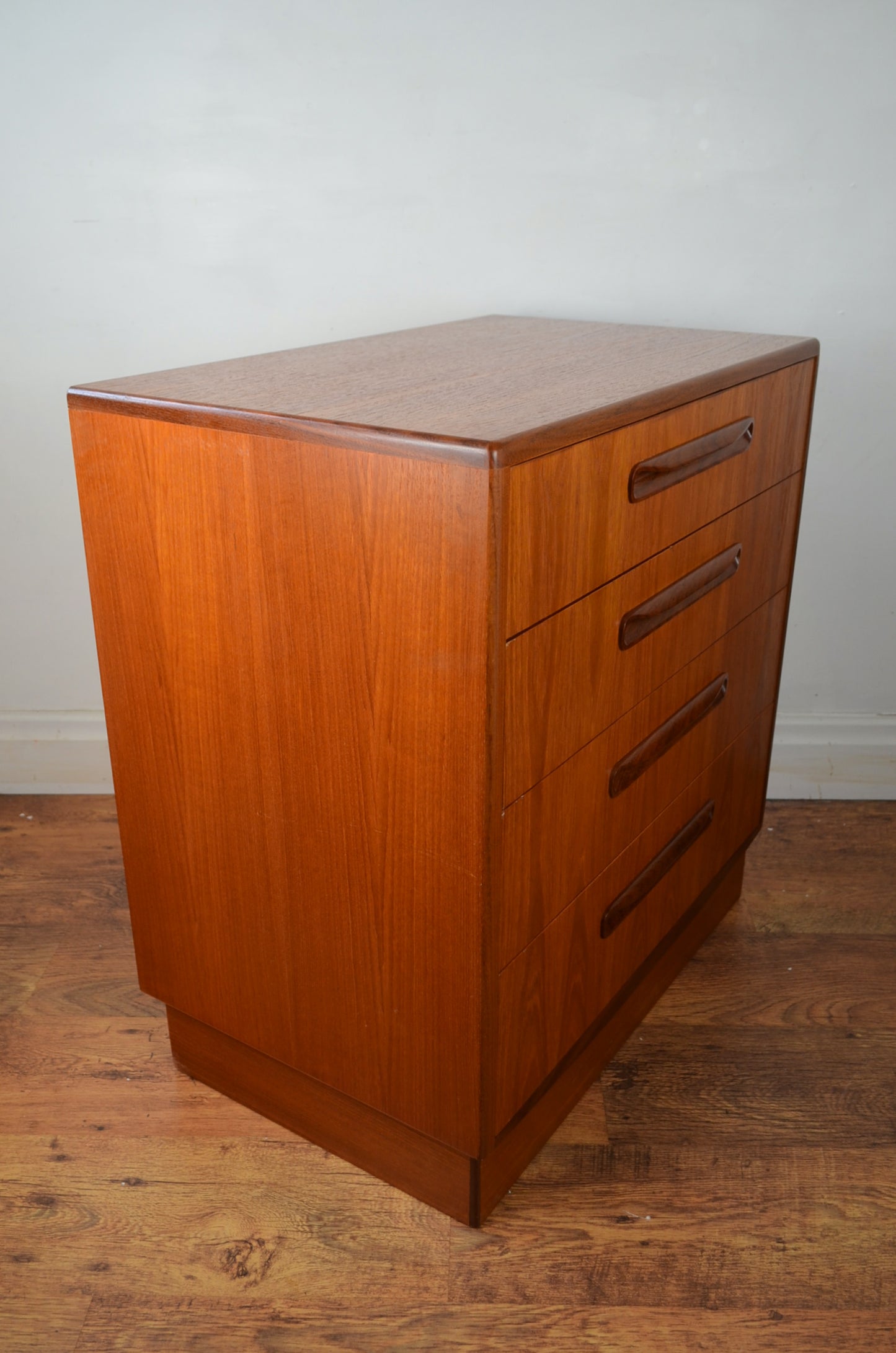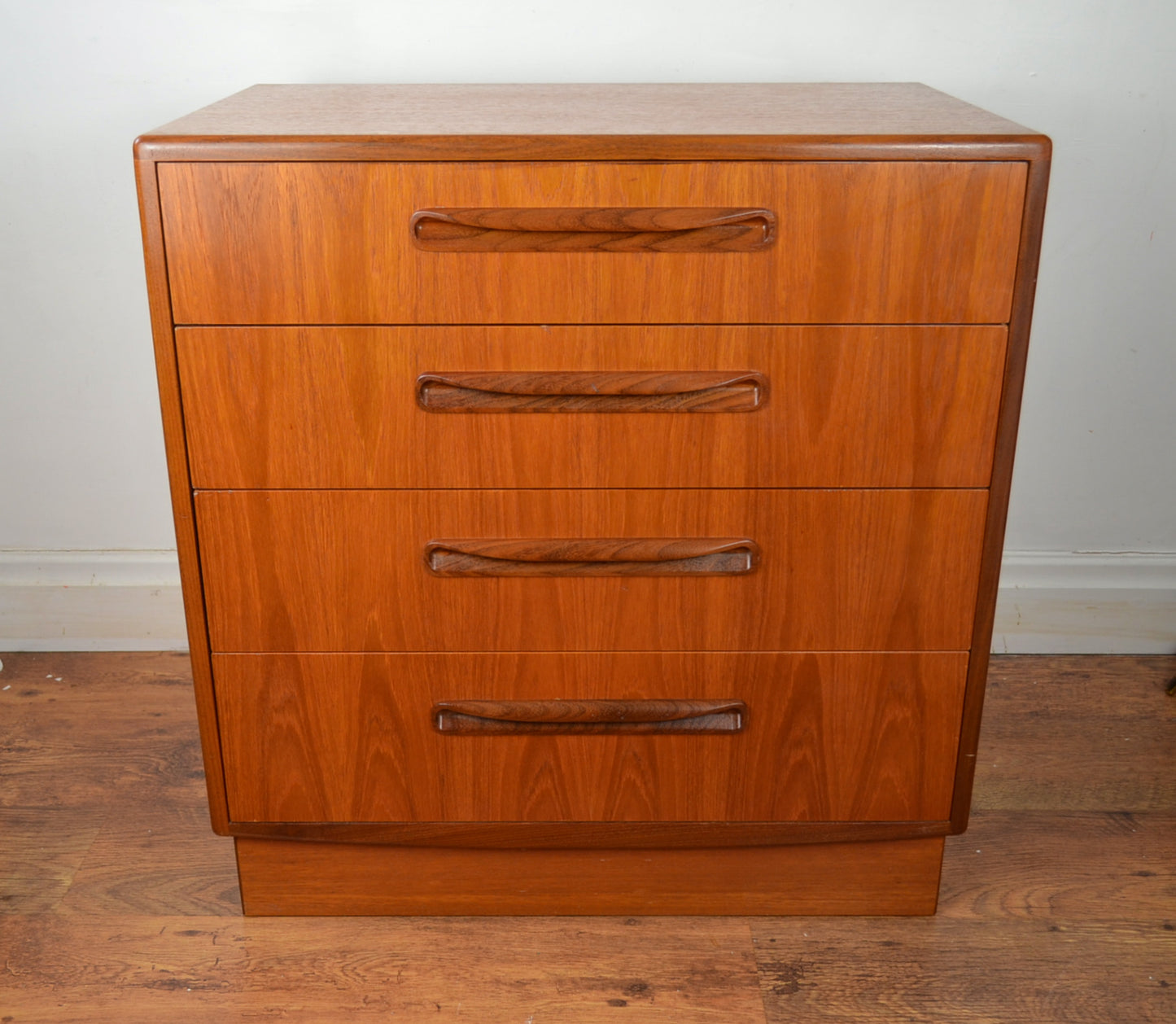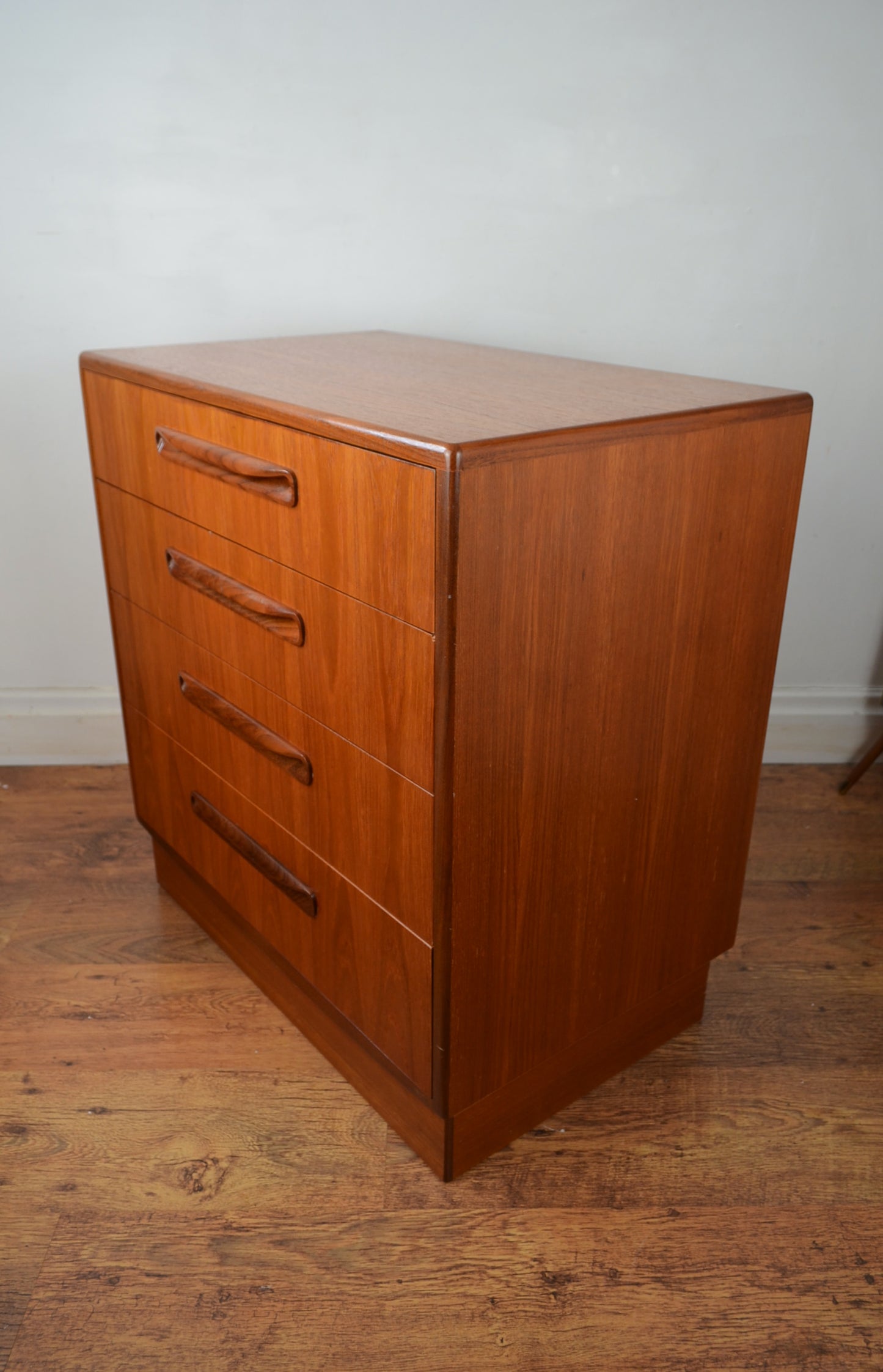 A mid century teak four drawer G-Plan 'Fresco' chest of drawers. Benefiting from iconic handles and a fantastic grain the runs across the front.