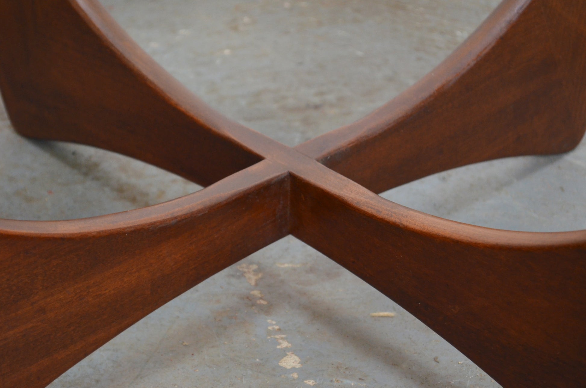 A Victor B. Wilkins - G-plan Furniture - Astro - A 1960's vintage teak wood atomic coffee / centre table with the circular shaped inset glass raised on the shaped cross-legged supports.