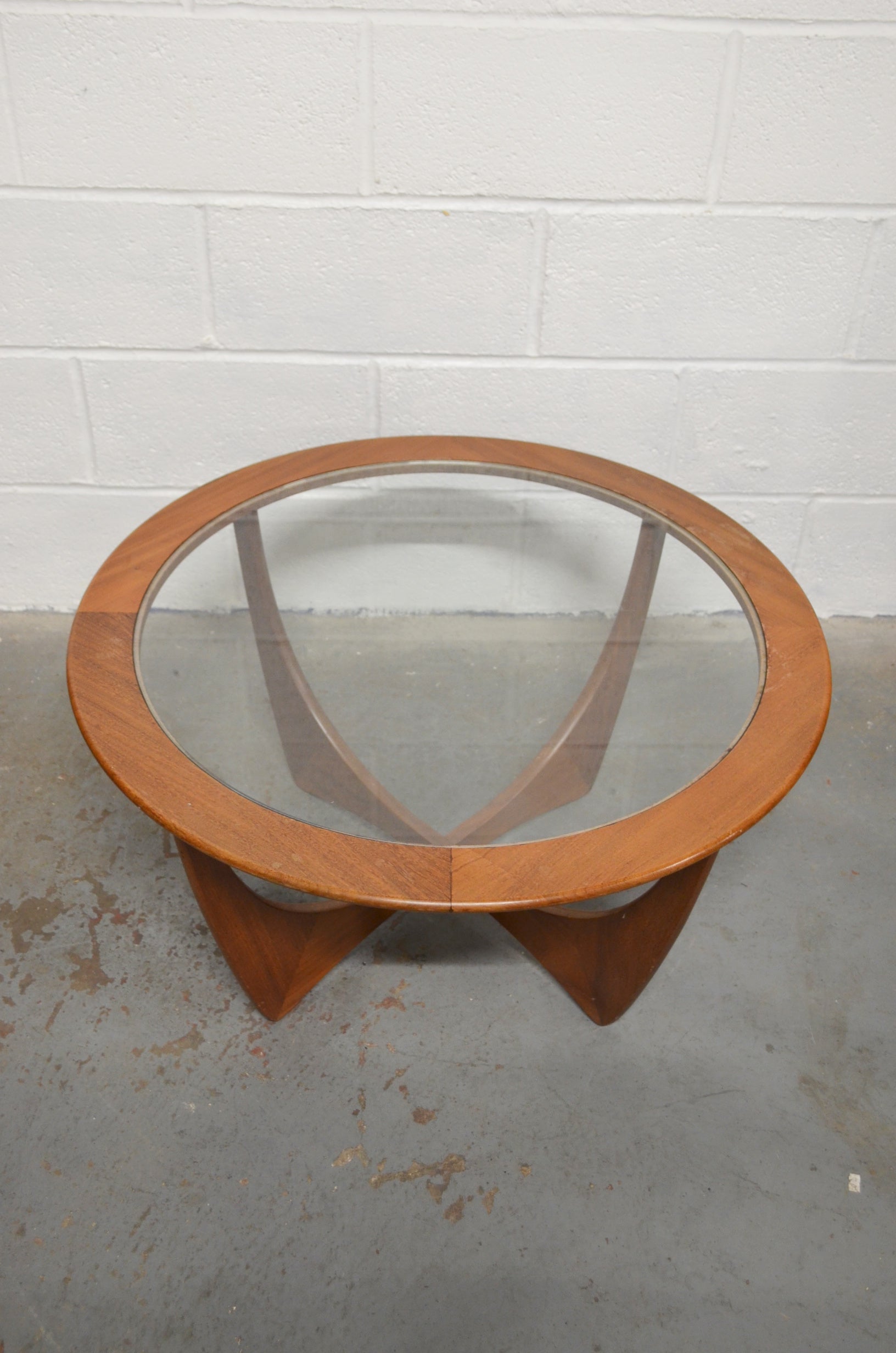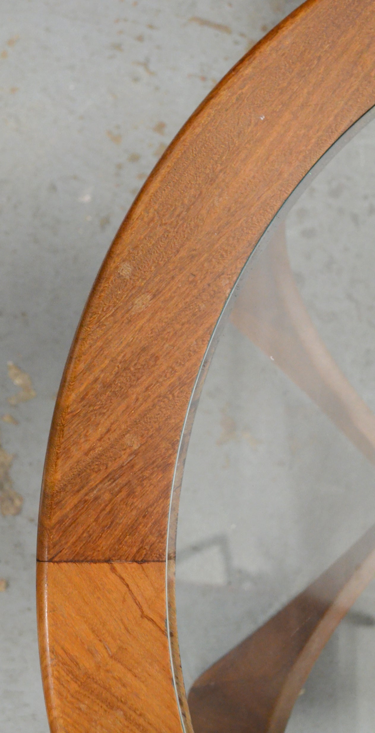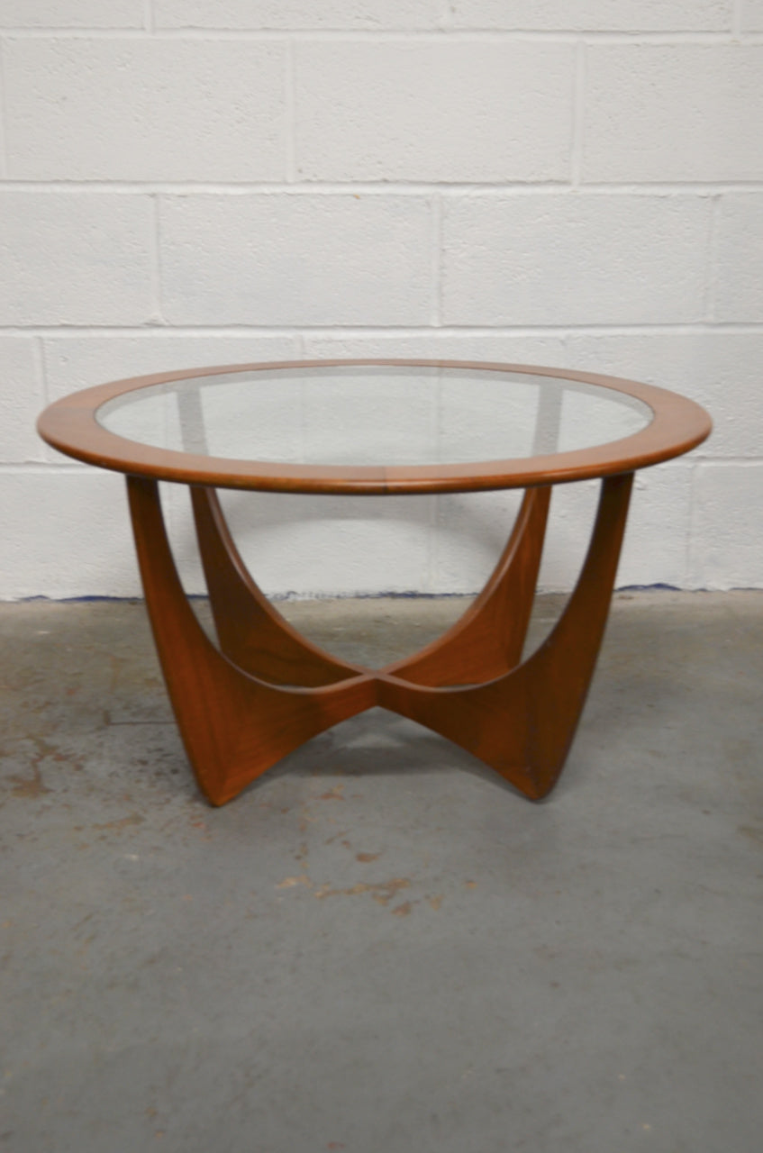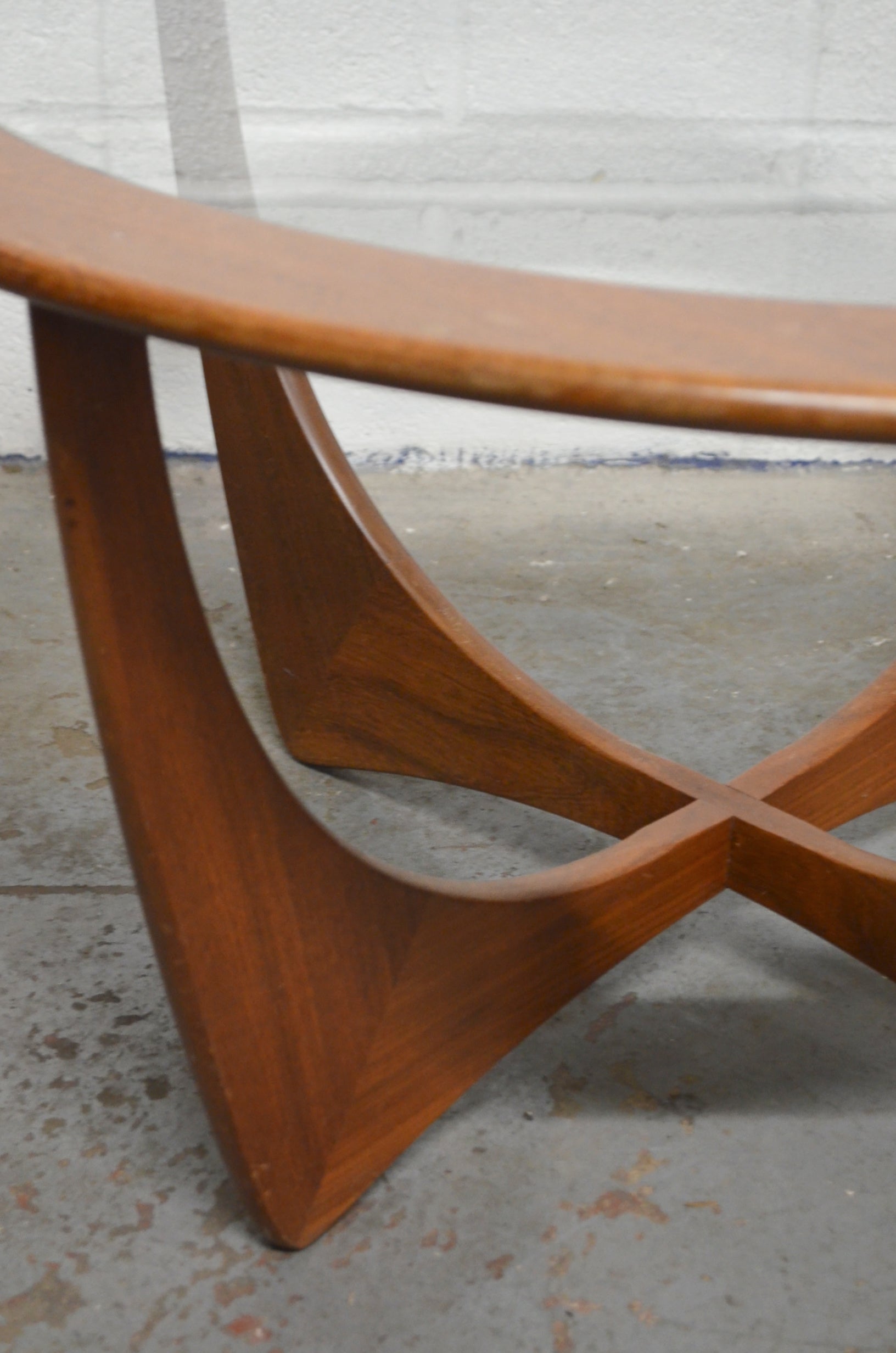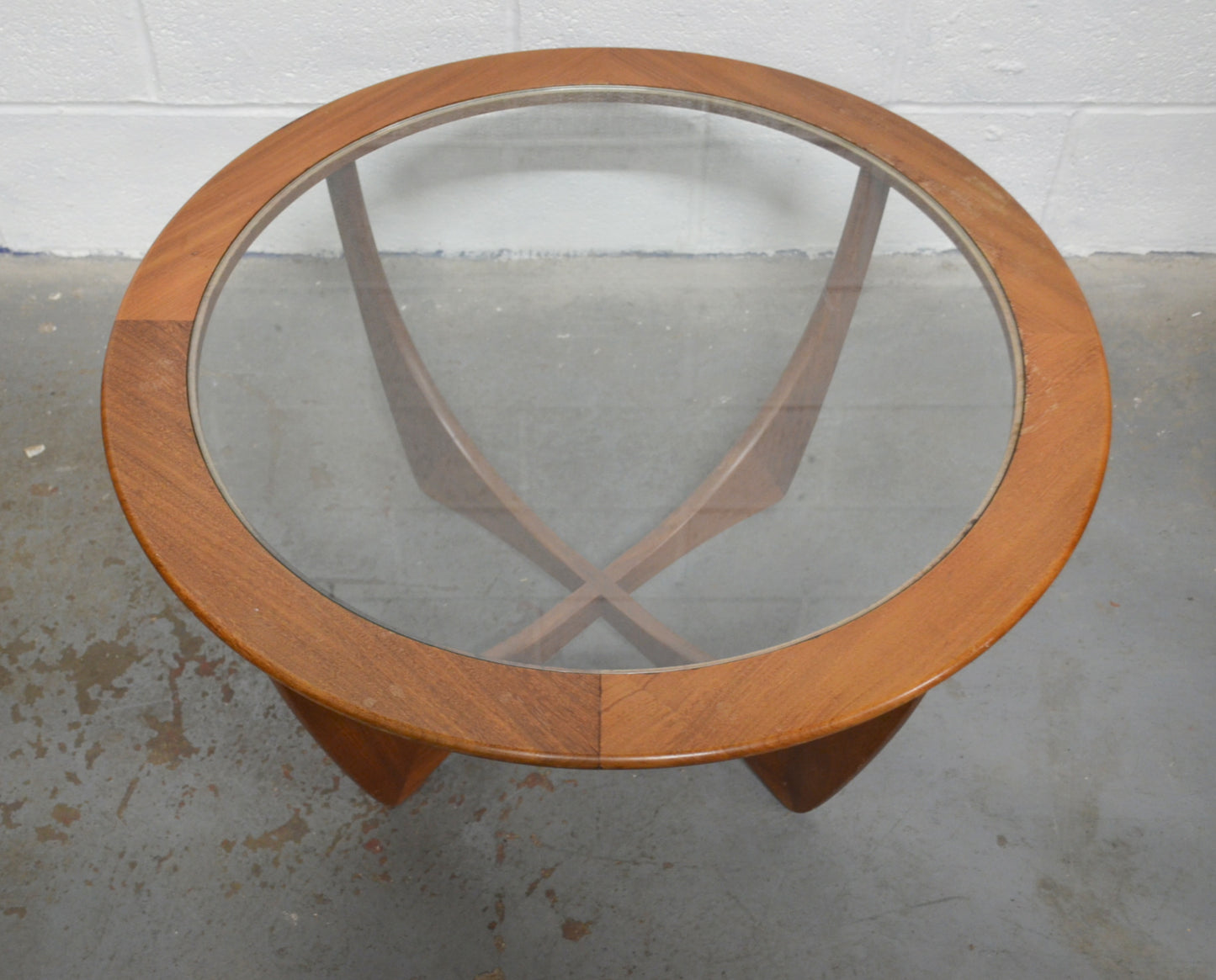 A Victor B. Wilkins - G-plan Furniture - Astro - A 1960's vintage teak wood atomic coffee / centre table with the circular shaped inset glass raised on the shaped cross-legged supports.