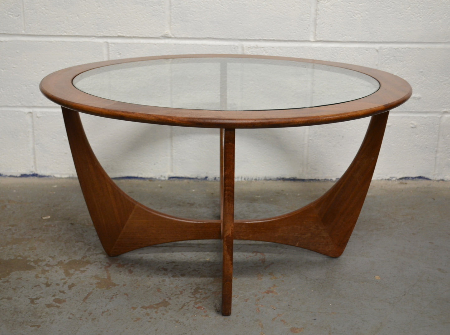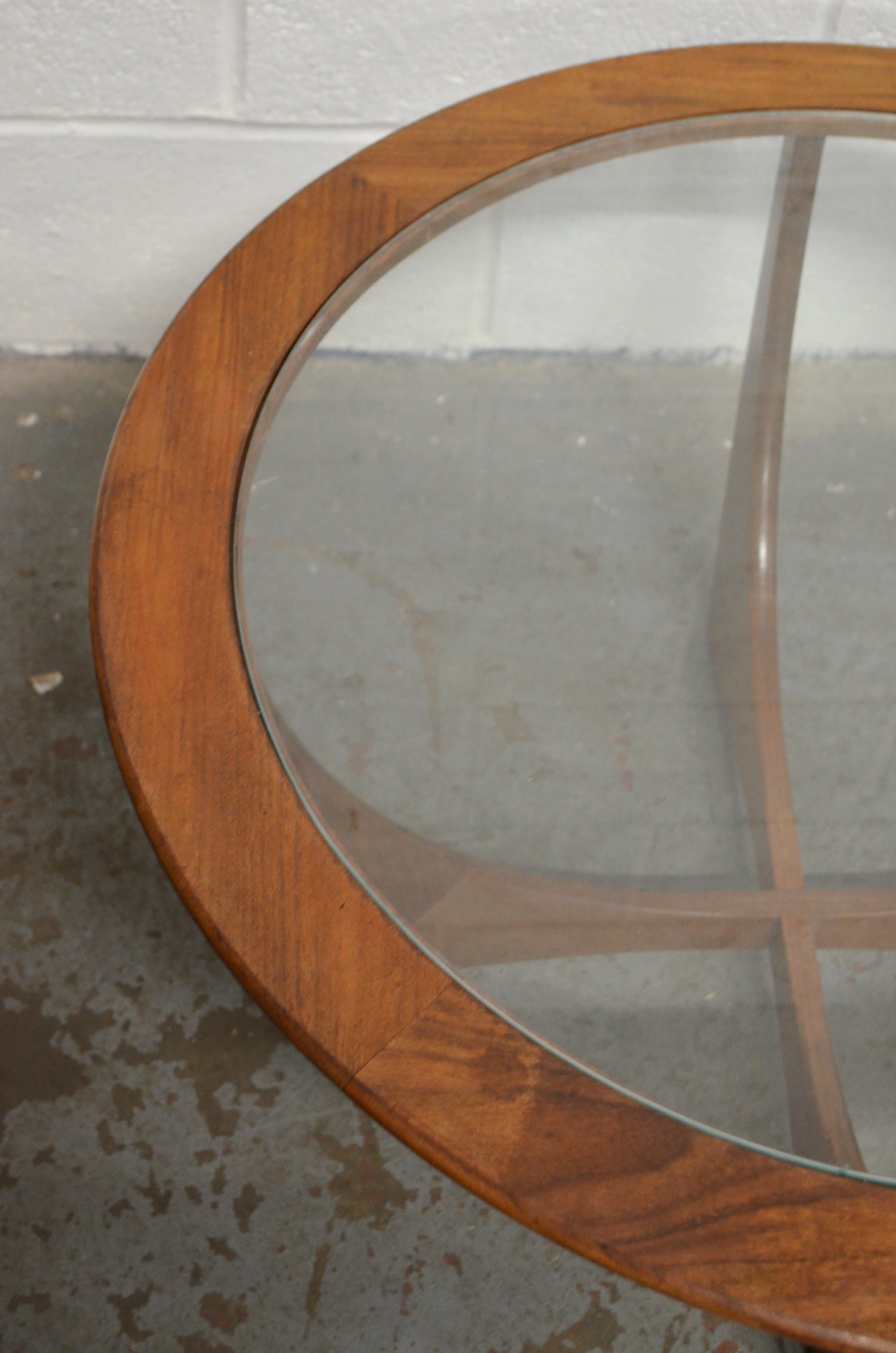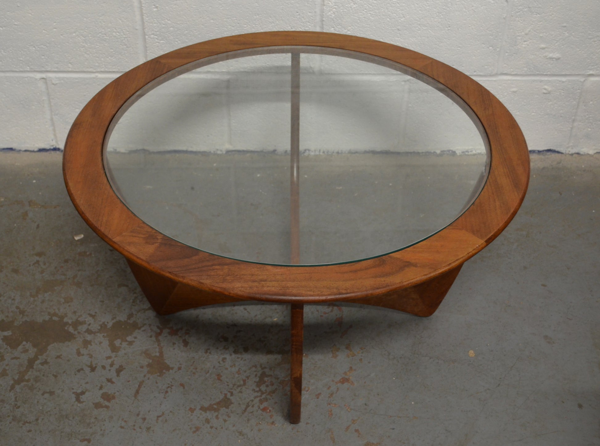 A Victor B. Wilkins - G-plan Furniture - Astro - A 1960's vintage teak wood atomic coffee / centre table with the circular shaped inset glass raised on the shaped cross-legged supports.