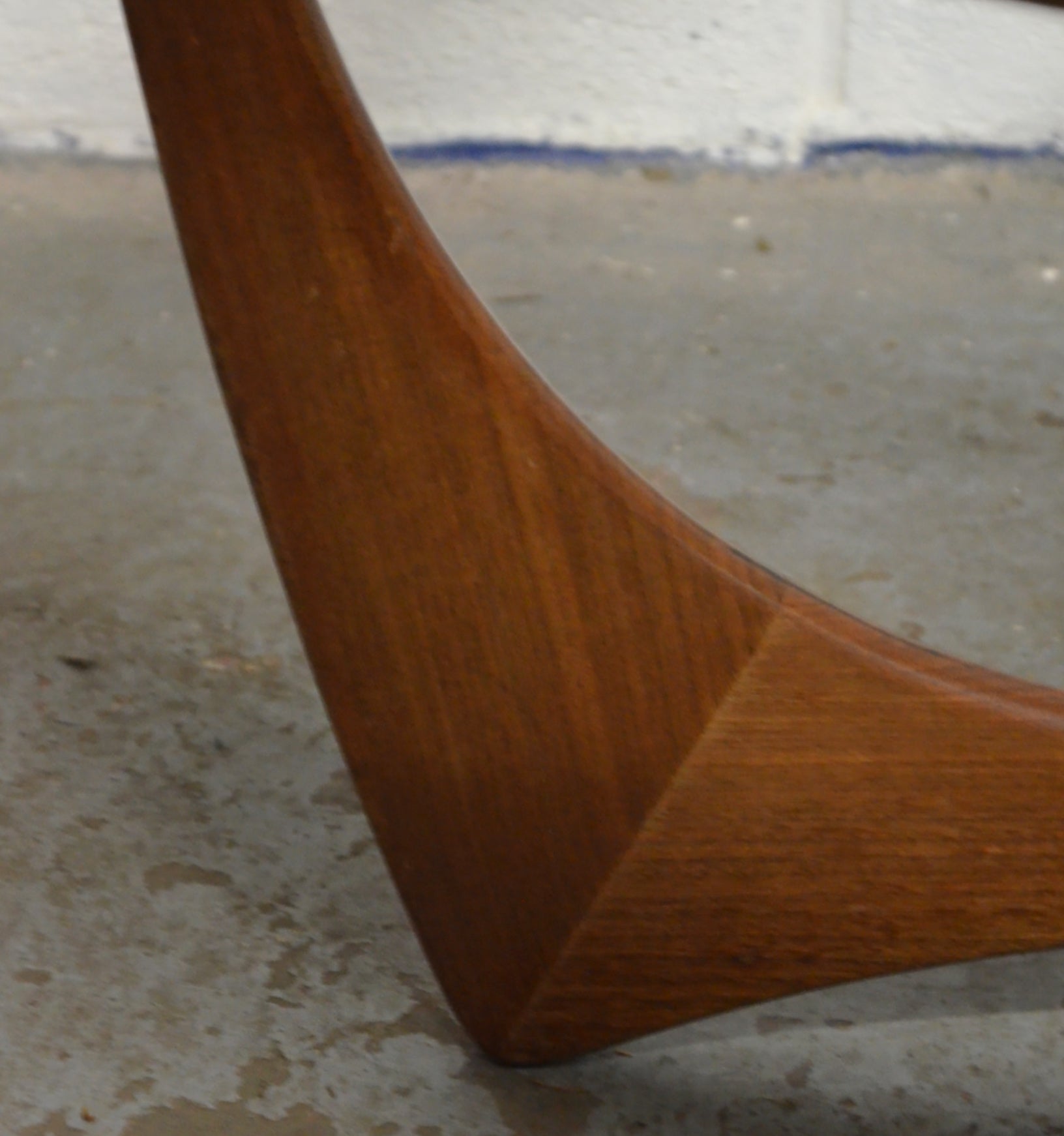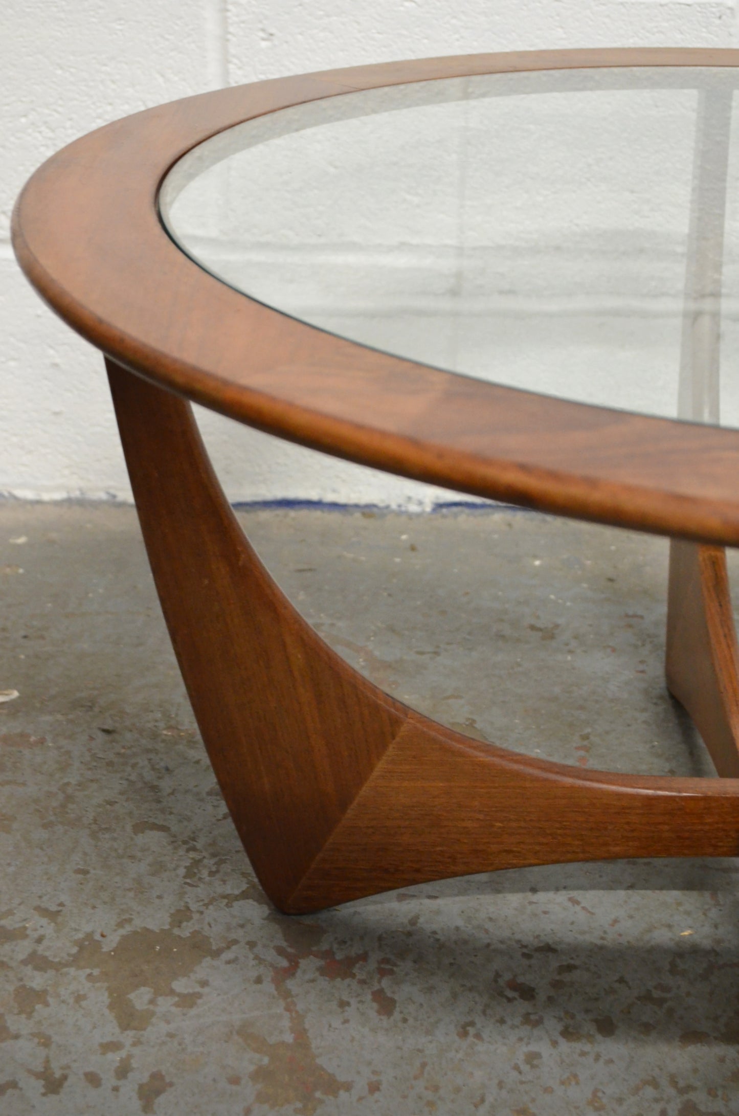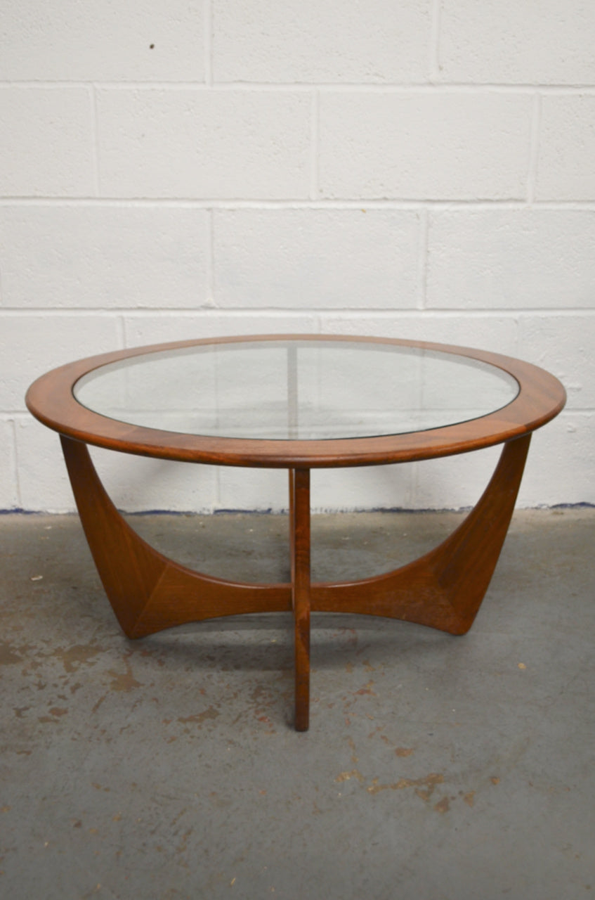 A Victor B. Wilkins - G-plan Furniture - Astro - A 1960's vintage teak wood atomic coffee / centre table with the circular shaped inset glass raised on the shaped cross-legged supports.