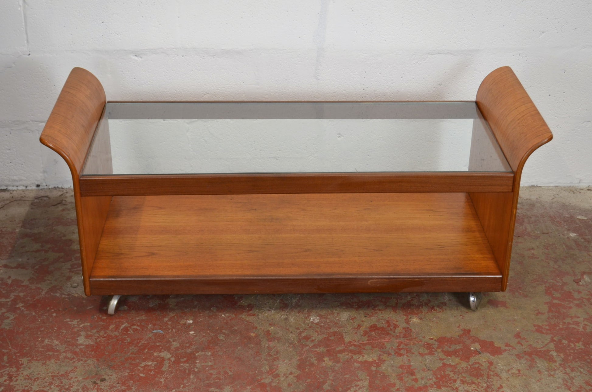 A mid-century Tulip coffee table by Victor Wilkins for G Plan. Beautiful design with the flowing lines to bentwood wings, magazine rack to the base and glass top. Raised on casters making it easy to move around when needed.