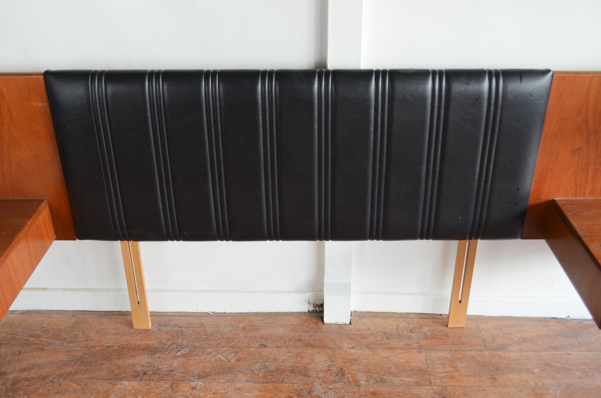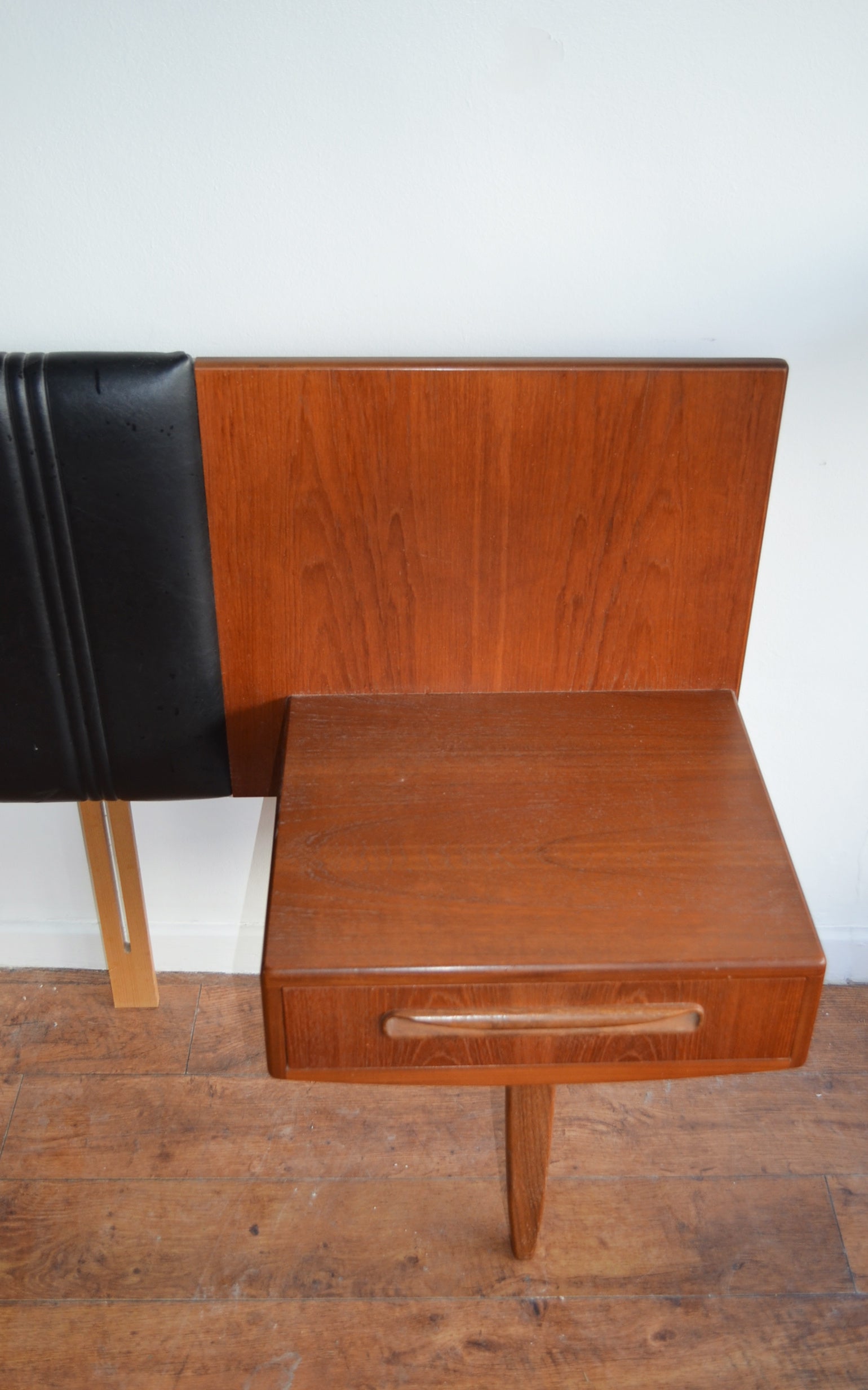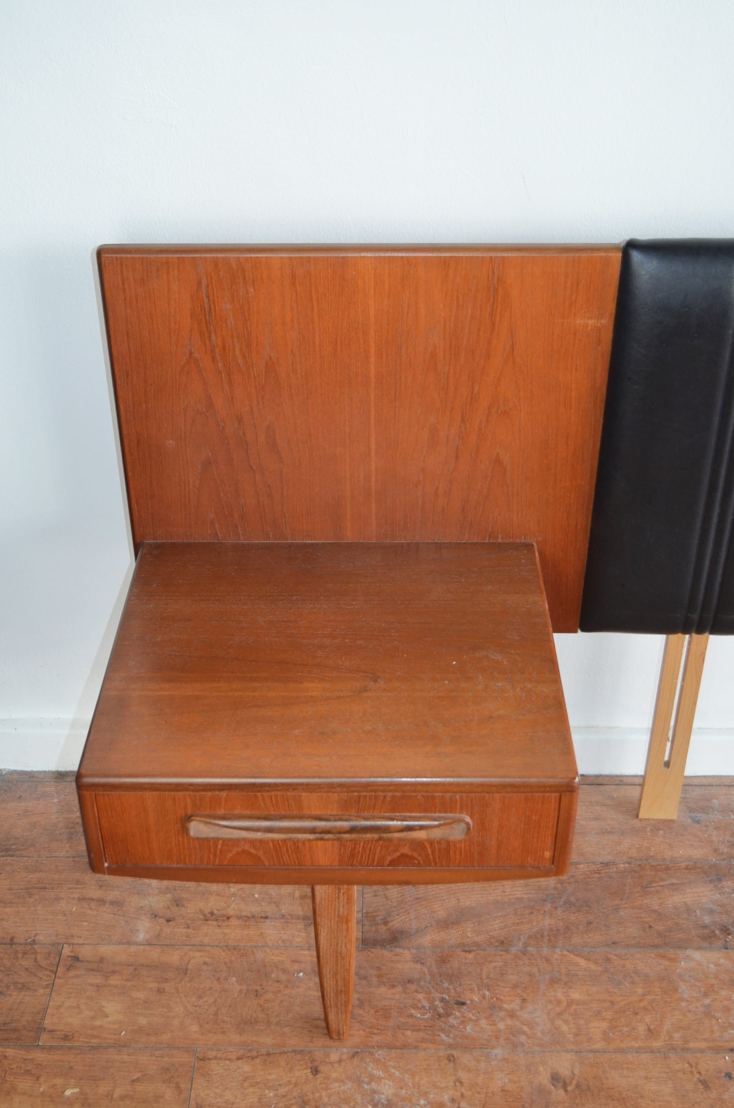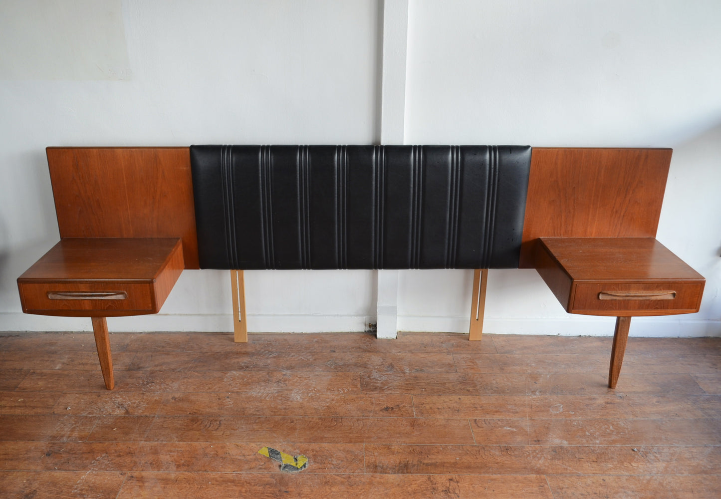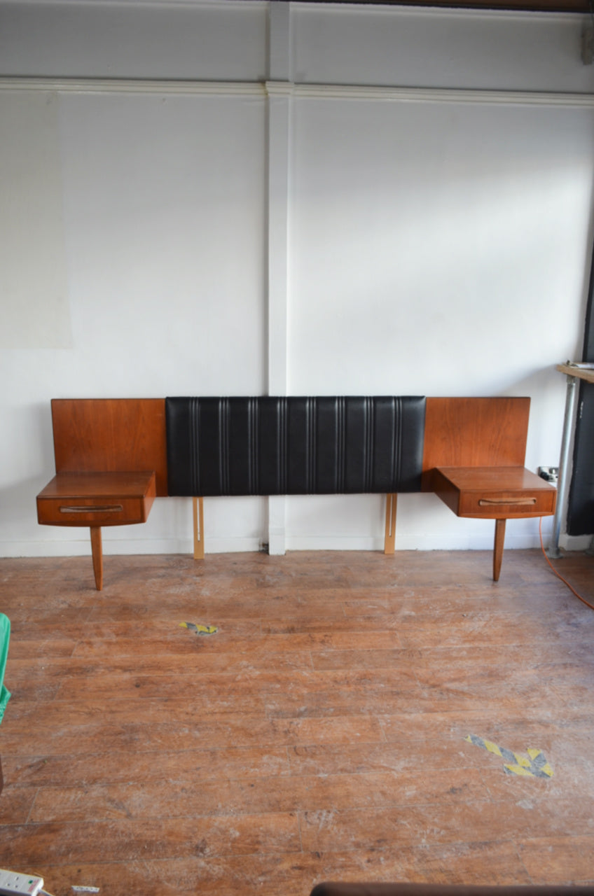 A vintage mid century G plan Fresco teak and vinyl headboard with floating bedside tables due to a single tapered leg support, designed by V B Wilkins.