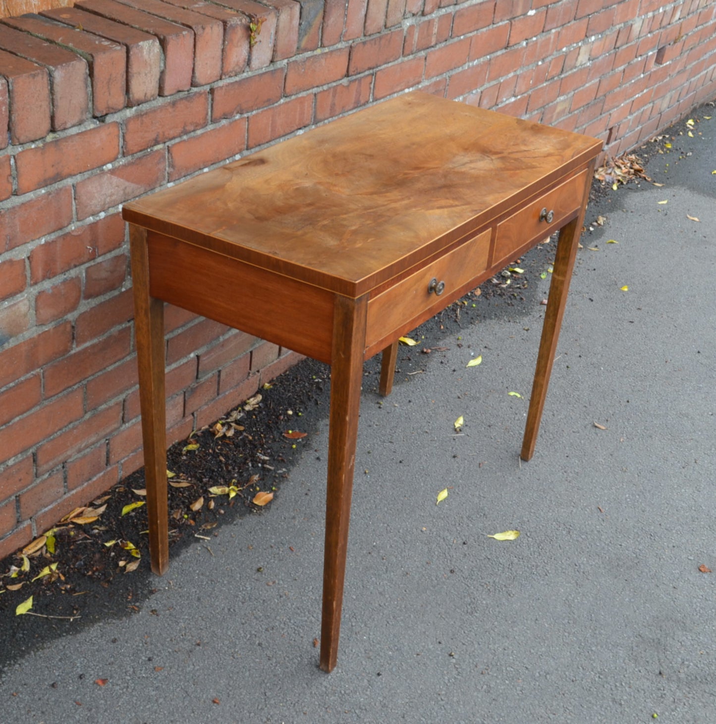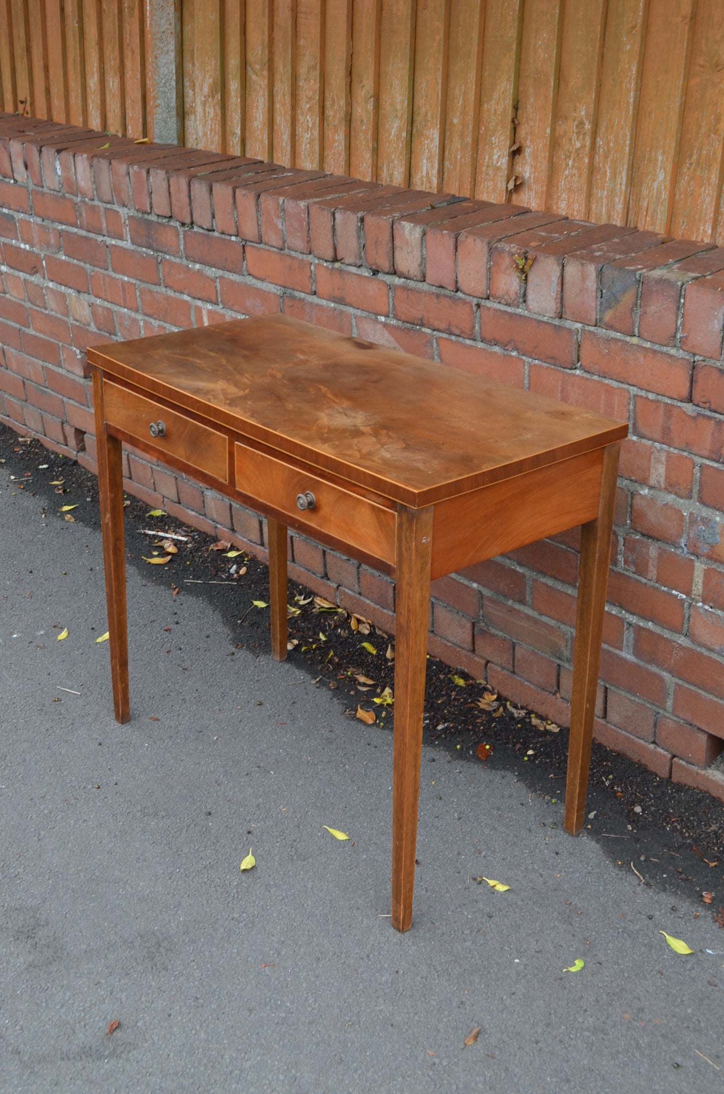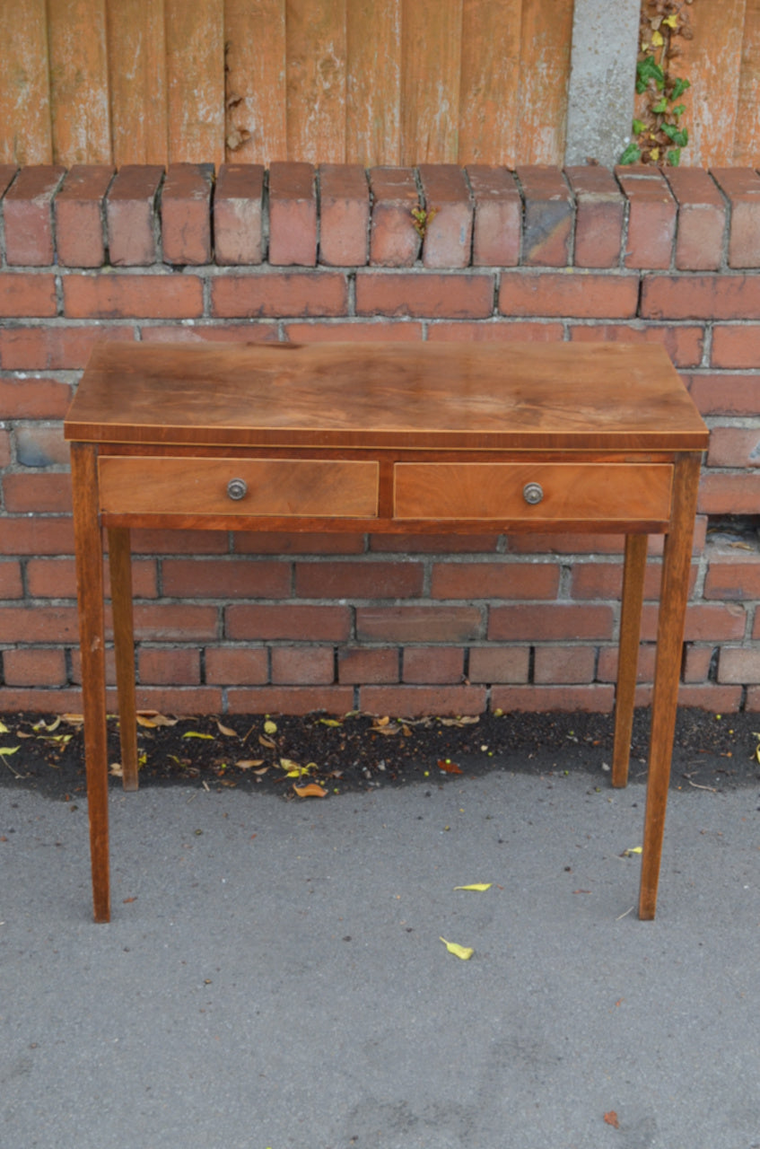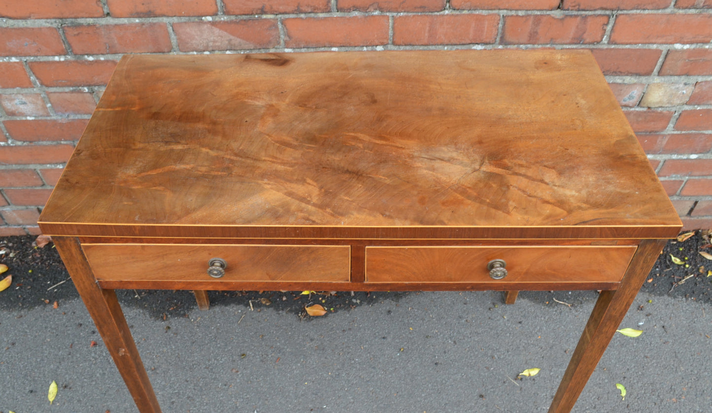 A 19th century writing/hall table Georgian mahogany and boxwood strung side table, two frieze drawers. Benefits from a great patina, and details as well as original handles.