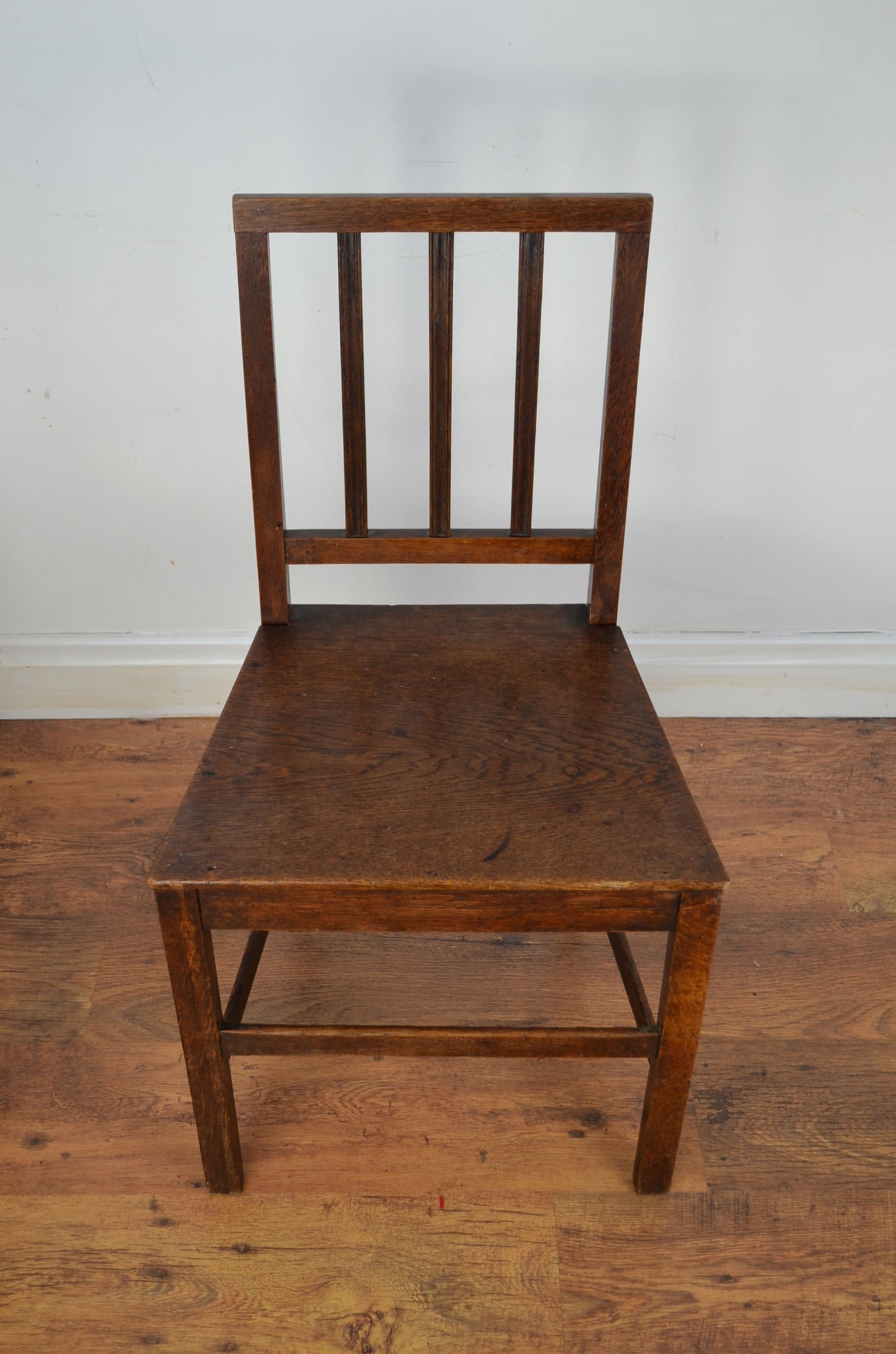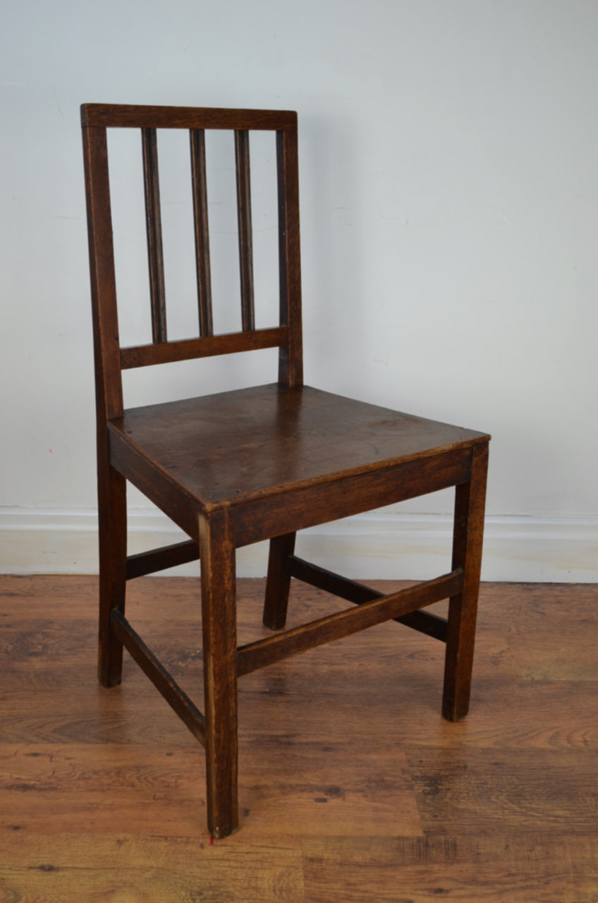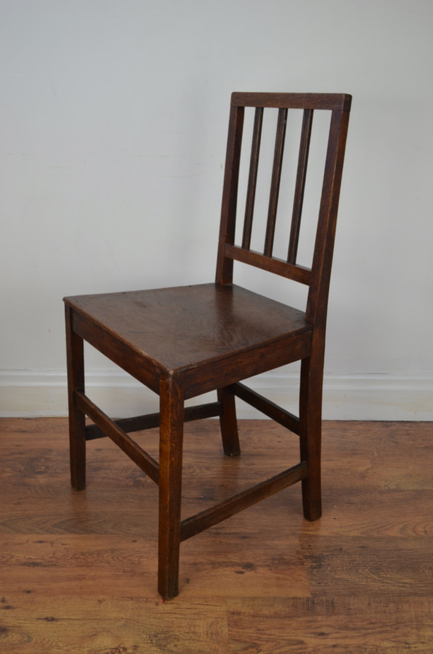 Welsh antique oak country house dining chair. Bar backrests with really good detail to centre on tapered legs and stretcher supports.