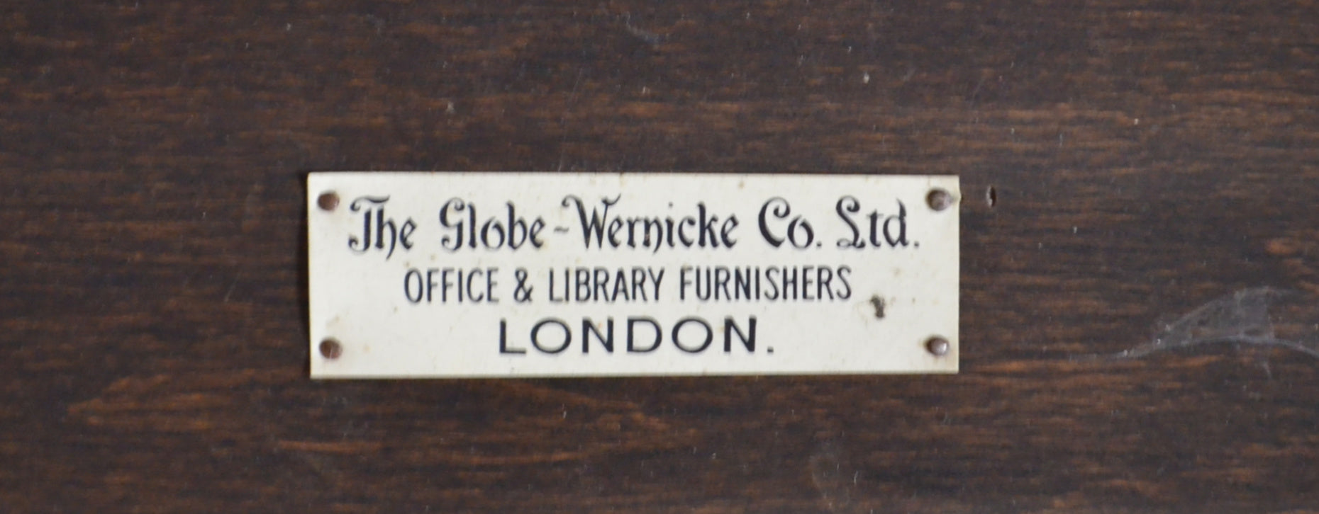 A circa 1920s Globe Wernicke five-tier oak sectional barrister bookcase with glazed up and over doors, raised on plinth base with storage. With makers mark.