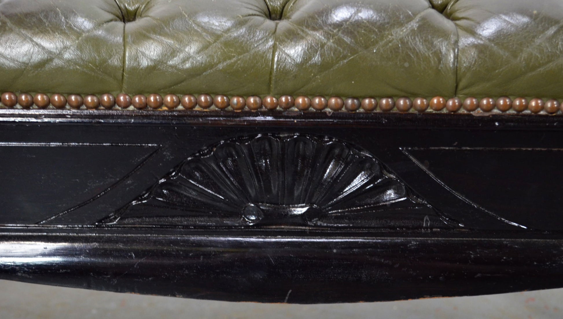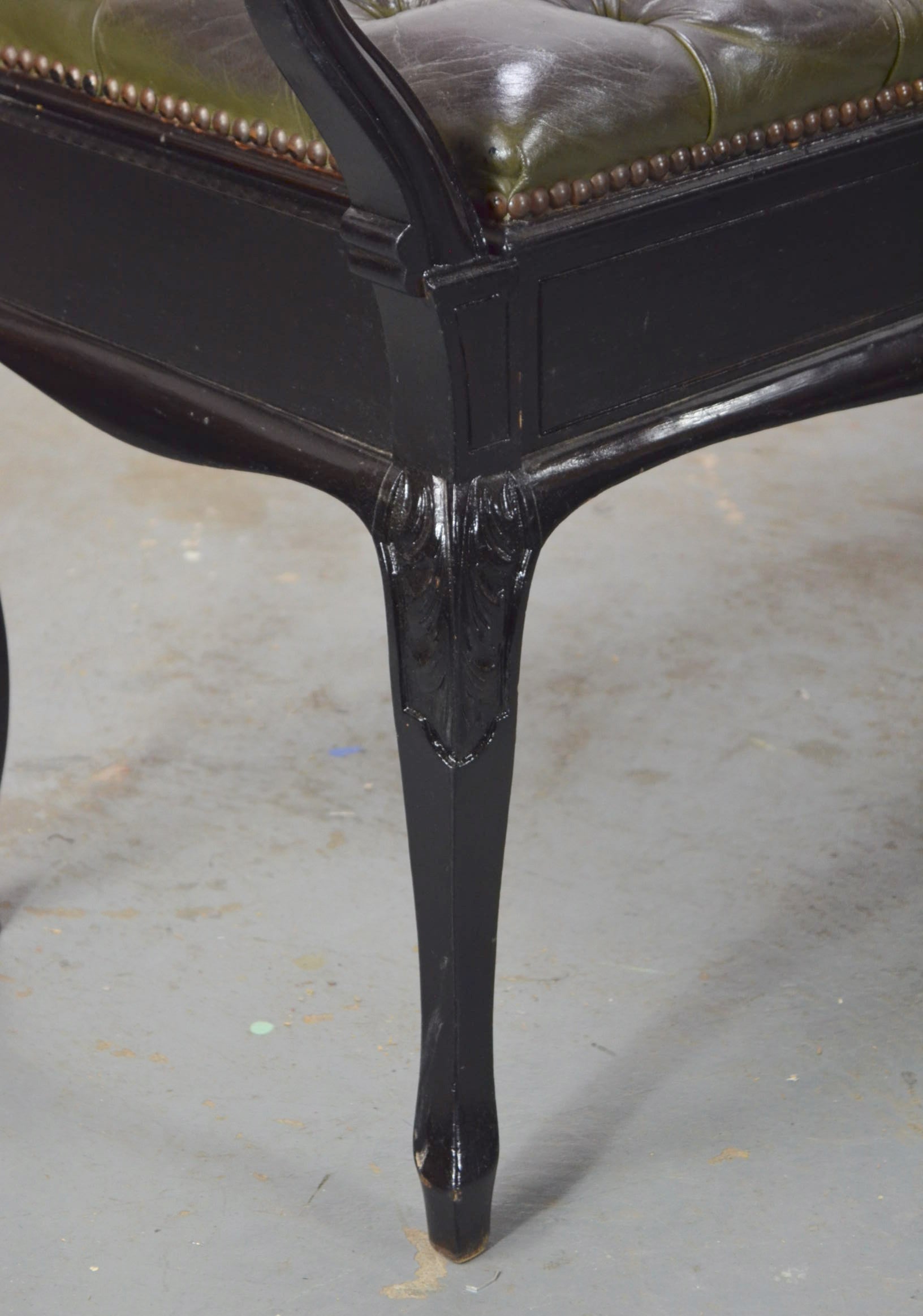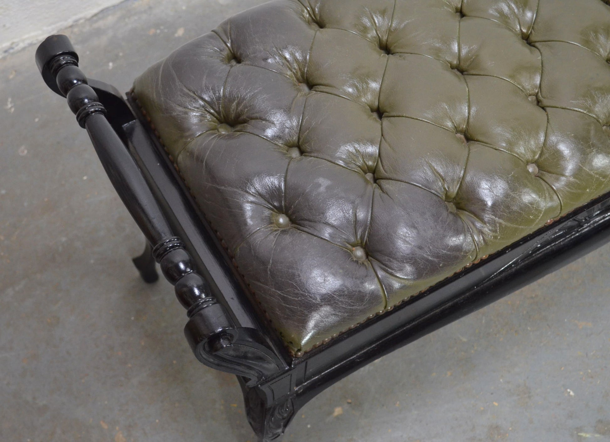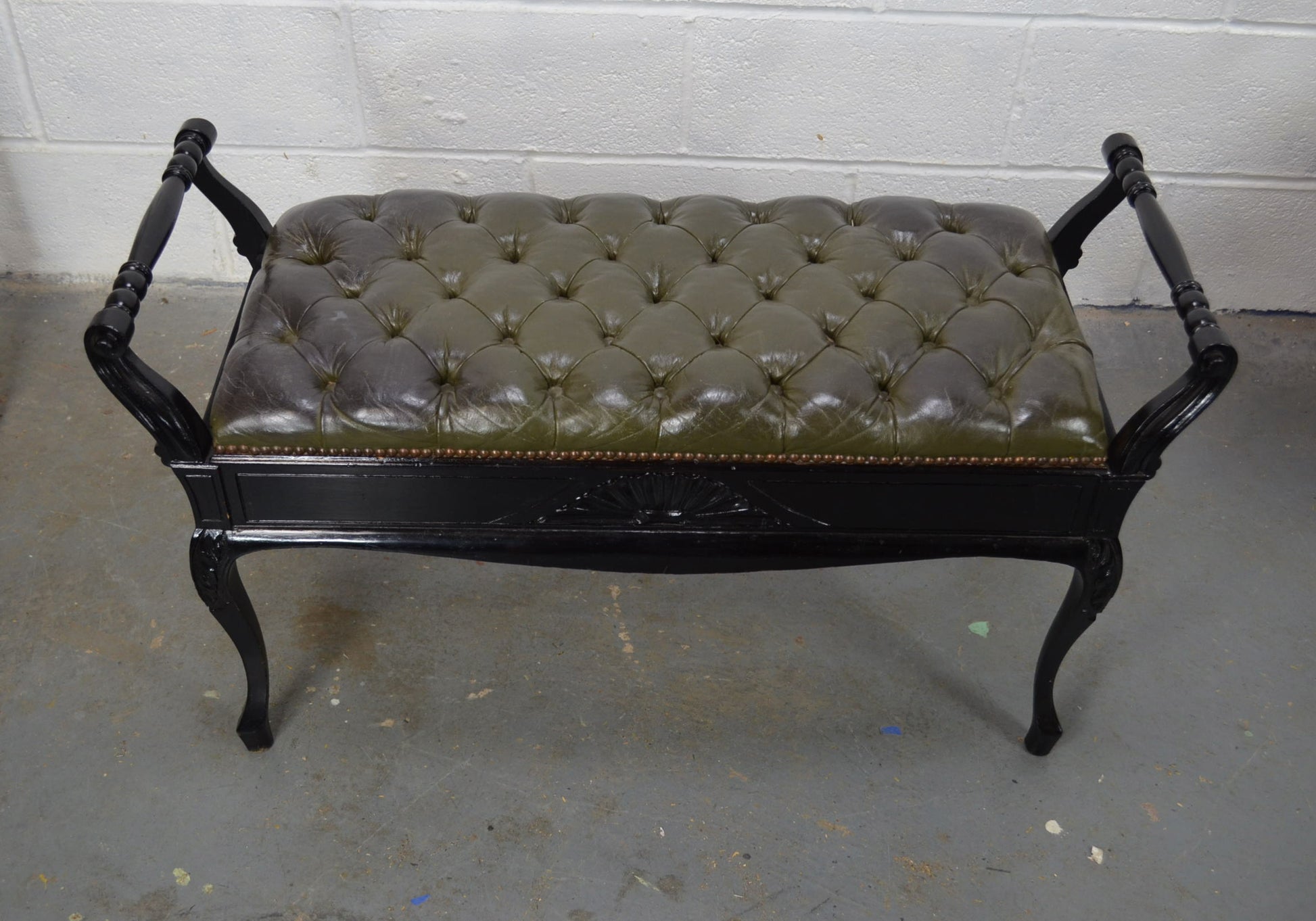 Jas Shoolbred & Co. A late 19th-century Victorian ebonized piano stool or bench. The seat features a green leather button top, accented by turned handles on either side. The hinged seat opens to reveal storage space within. The stool is supported by saber-style legs. Makers label is attached to the underside.