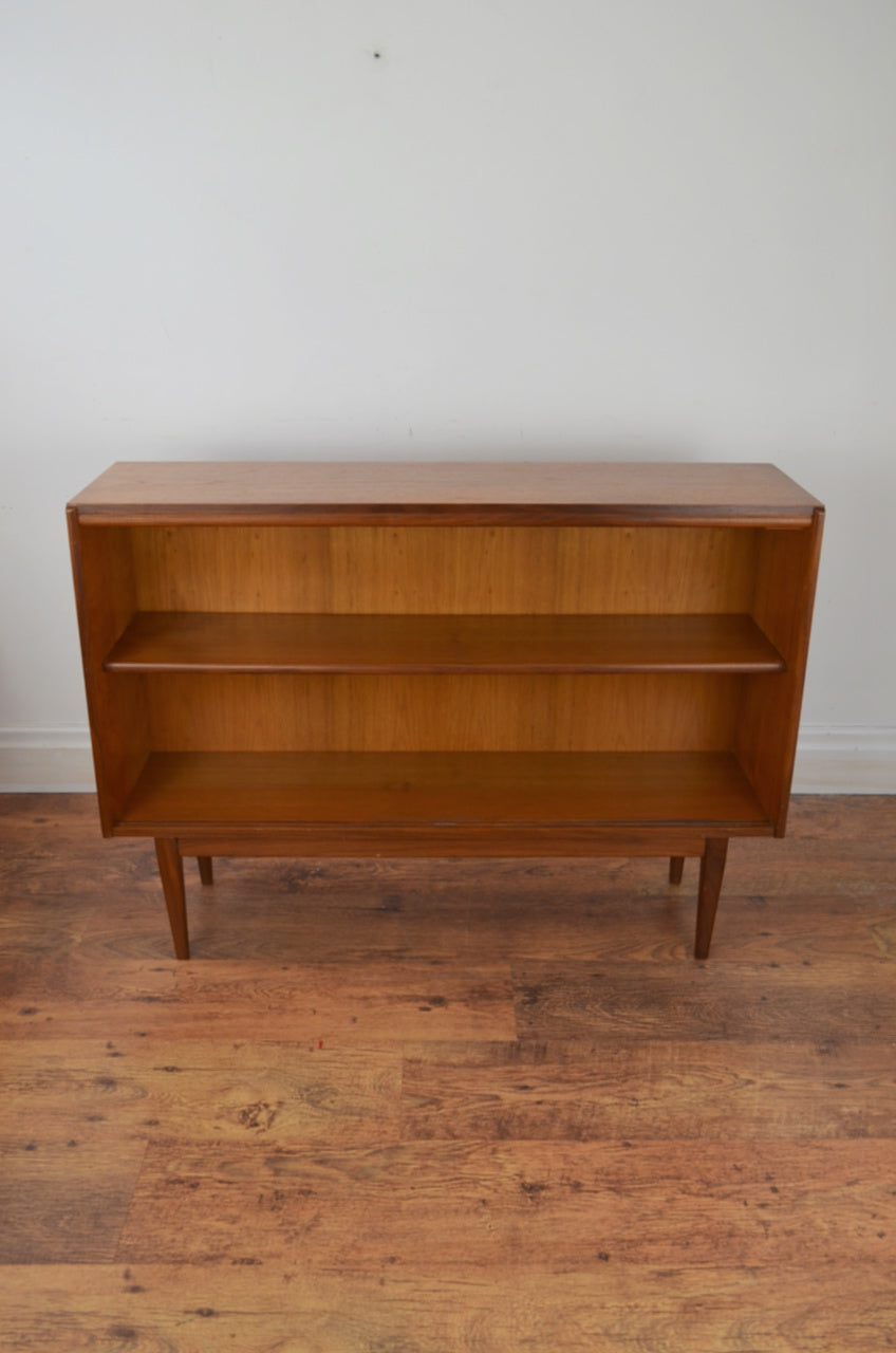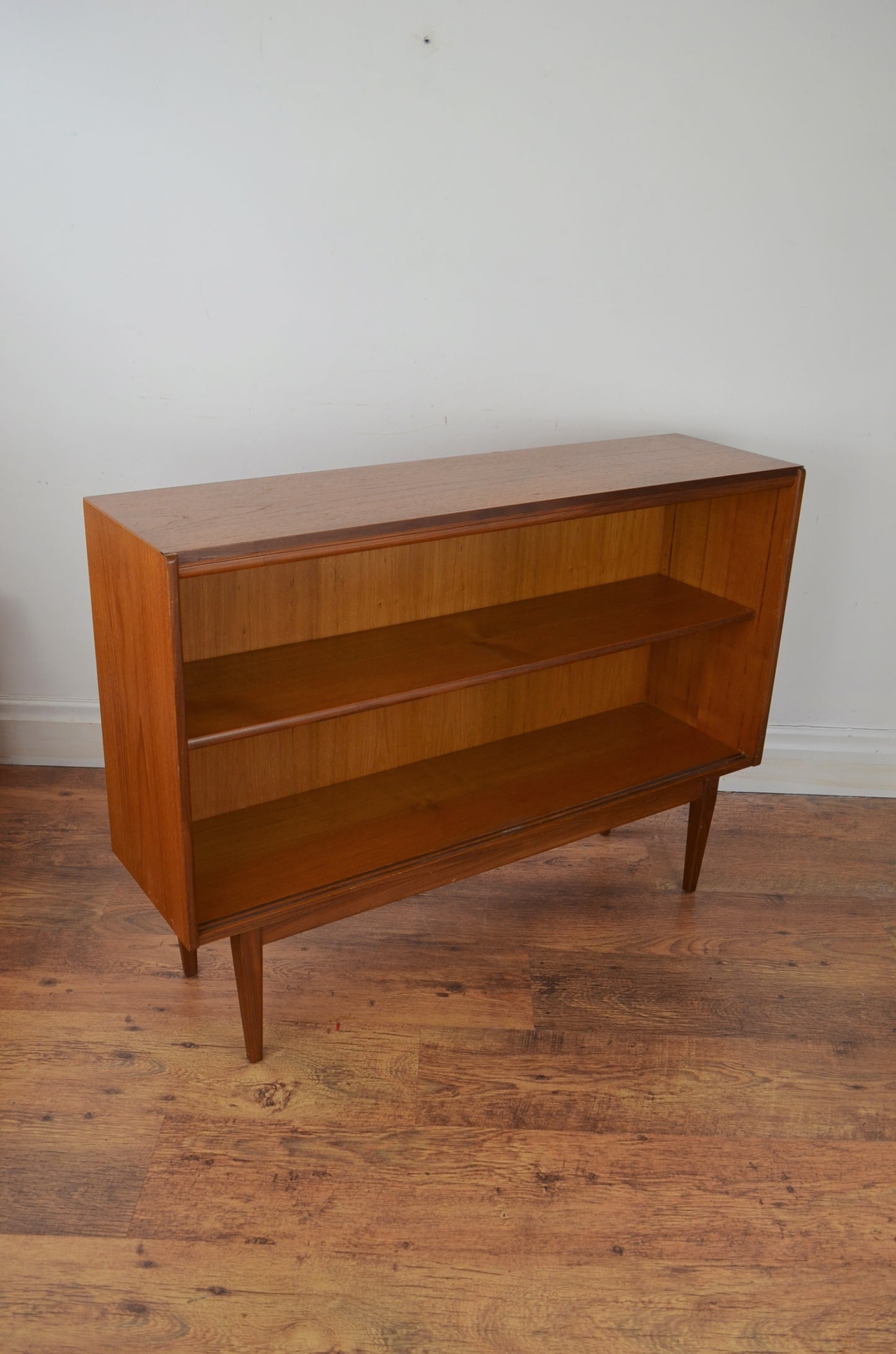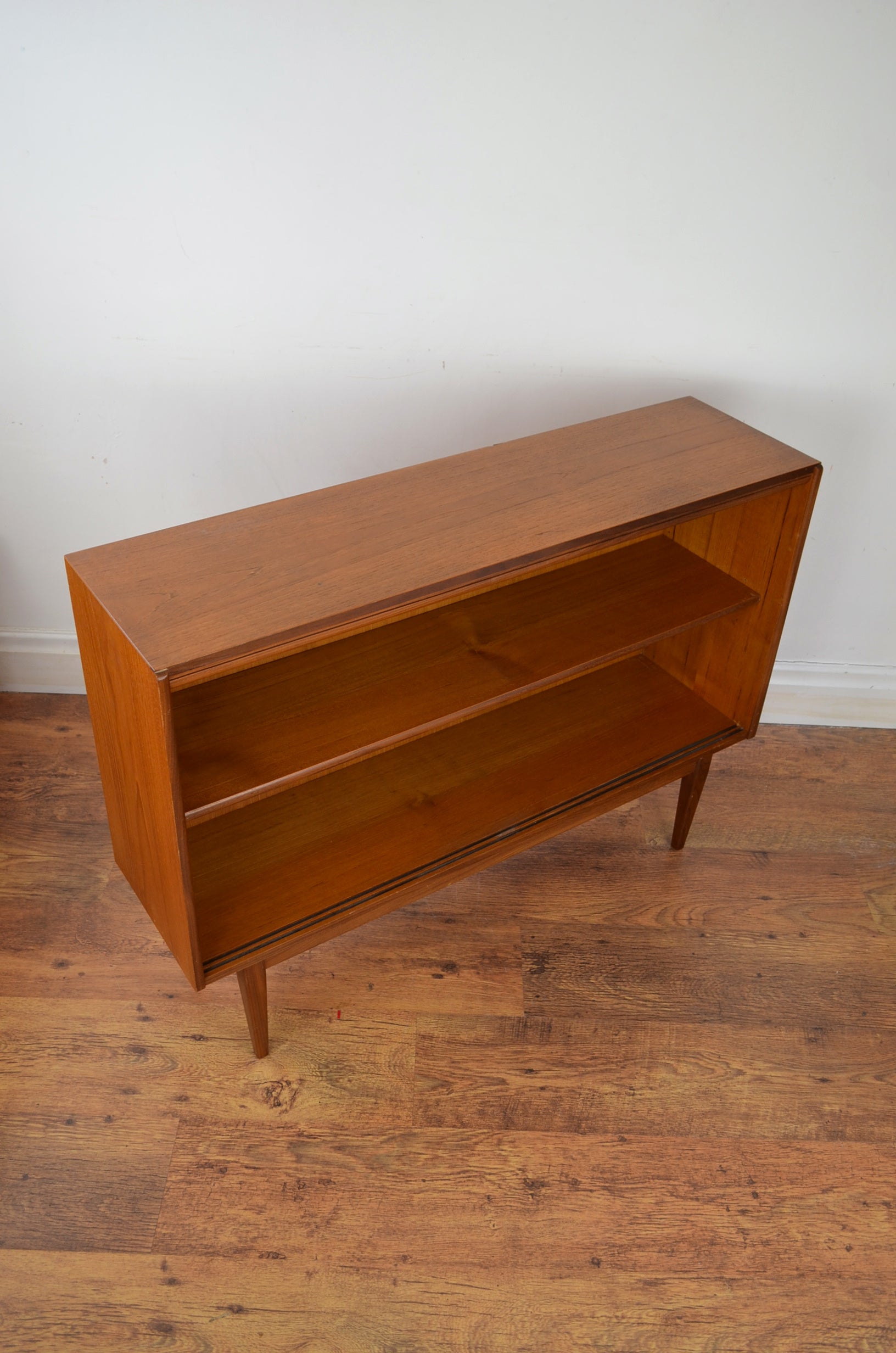 A teak mid century bookcase/cabinet of small proportions, raised on turned legs with brass feet. Would have originally had a glass front which has been lost but represented in the price.