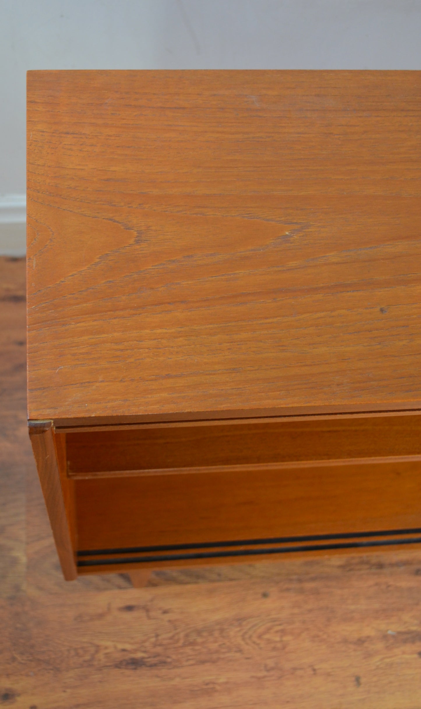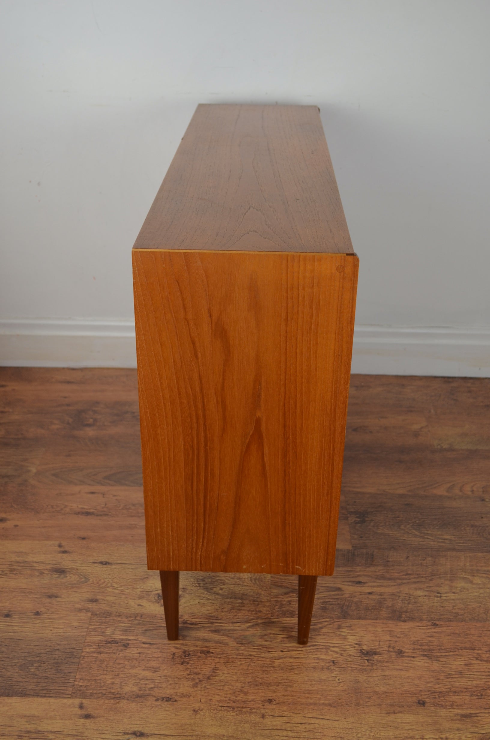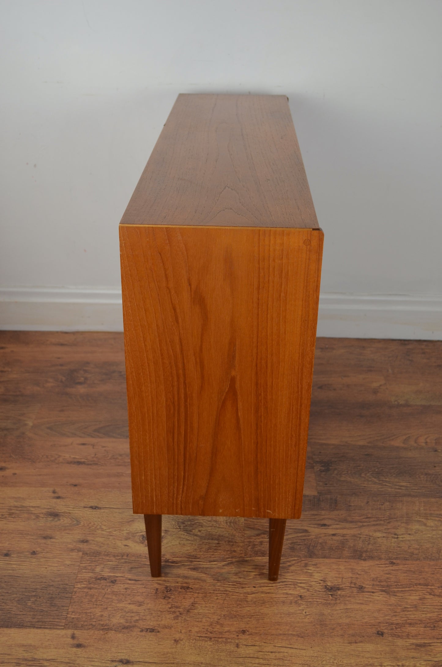 A teak mid century bookcase/cabinet of small proportions, raised on turned legs with brass feet. Would have originally had a glass front which has been lost but represented in the price.