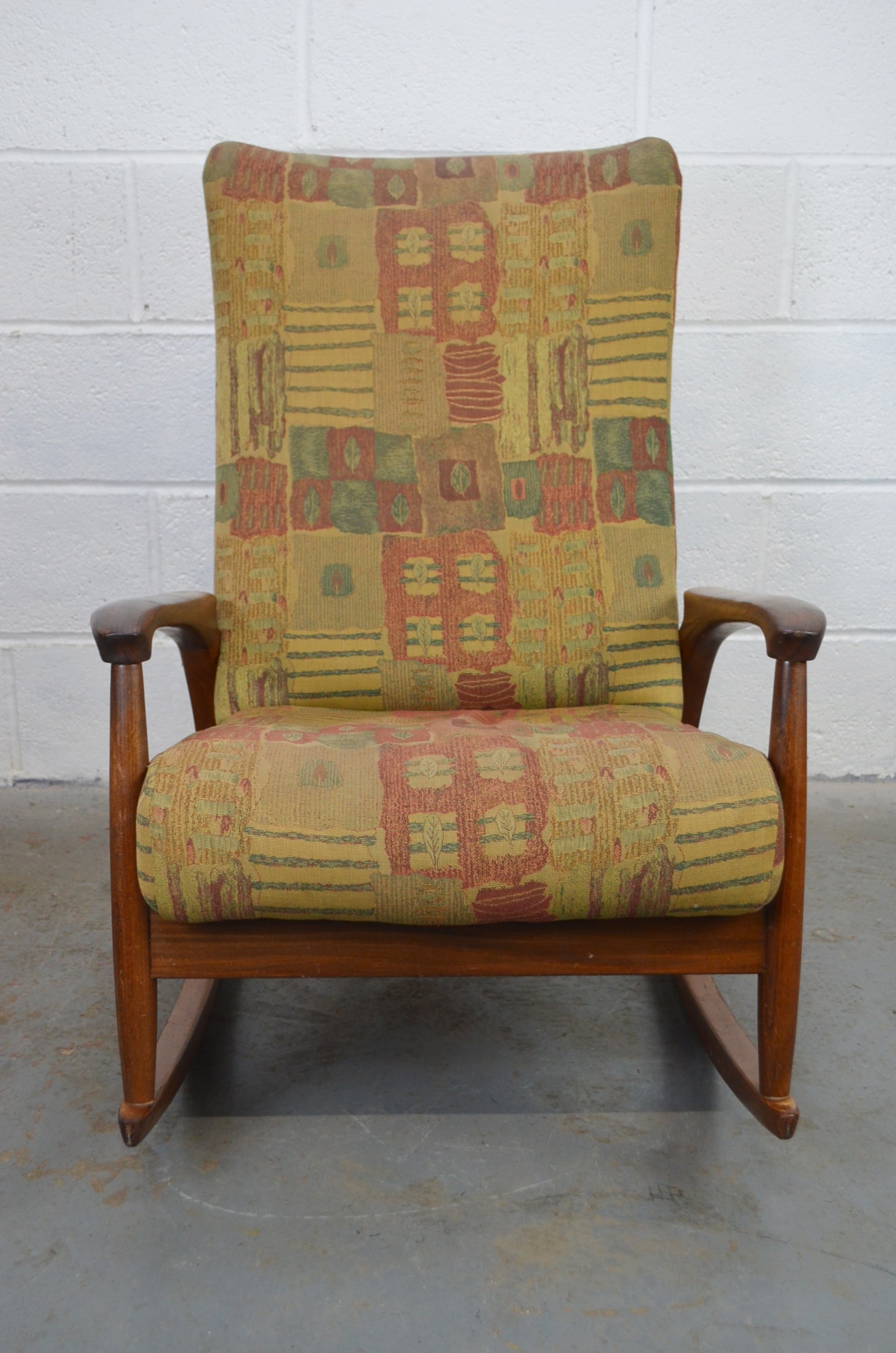 A vintage mid century Danish rocking chair in the manner of Kofod Larsen for G Plan. Fantastic teak wood design with particularly attractive arms and bent side support.