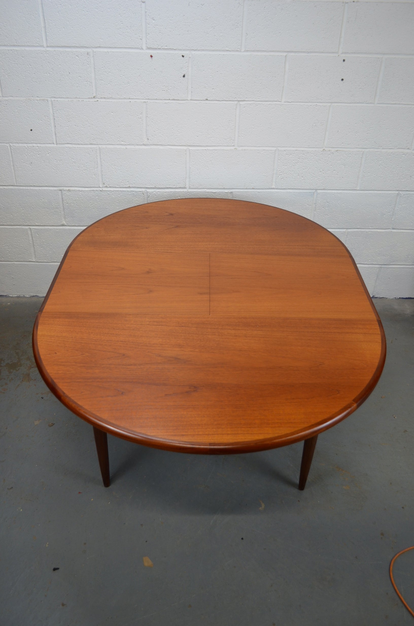 A stylish teak extending Fresco range circular dining table by G Plan. Turned legs with curved edge.
