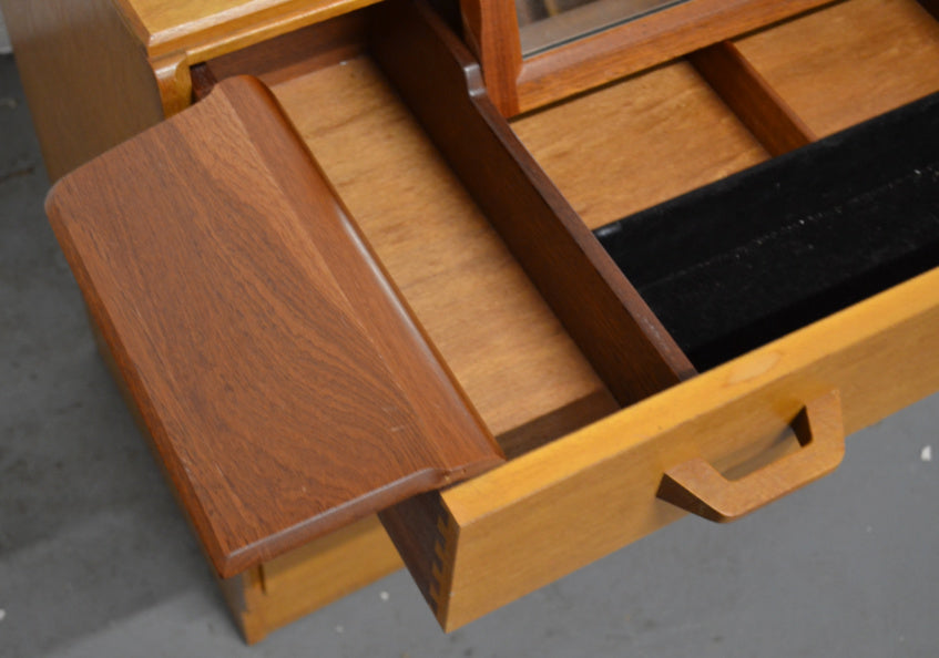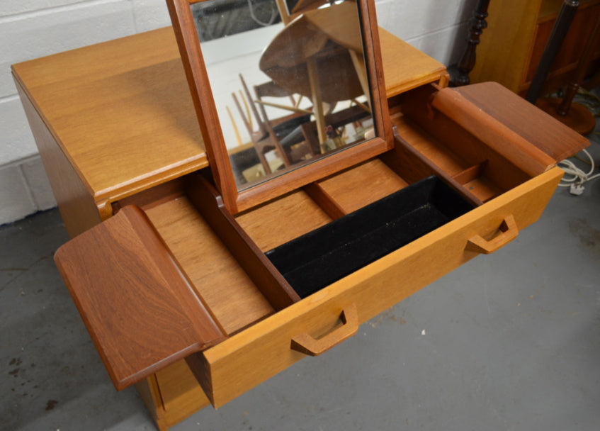Vintage 20th century oak dressing table by E Gomme for G Plan. Consisting of a clever pull out top drawer with vanity storage, fold up mirror and flip side tables atop three storage drawers.