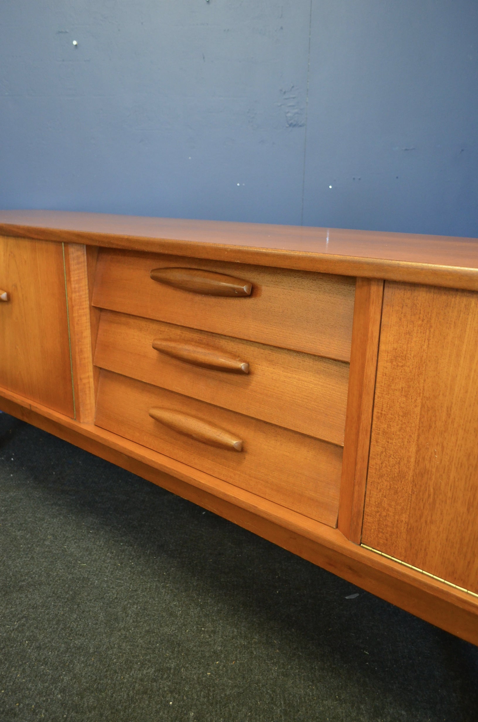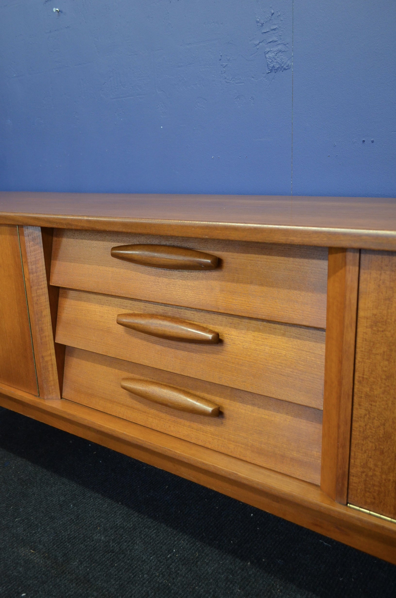 A superb Danish manner teak wood sideboard by Jentique. Raised on teak tapering supports with a series of cupboards one of which a drinks cabinet and those amazing drawers that make the piece.