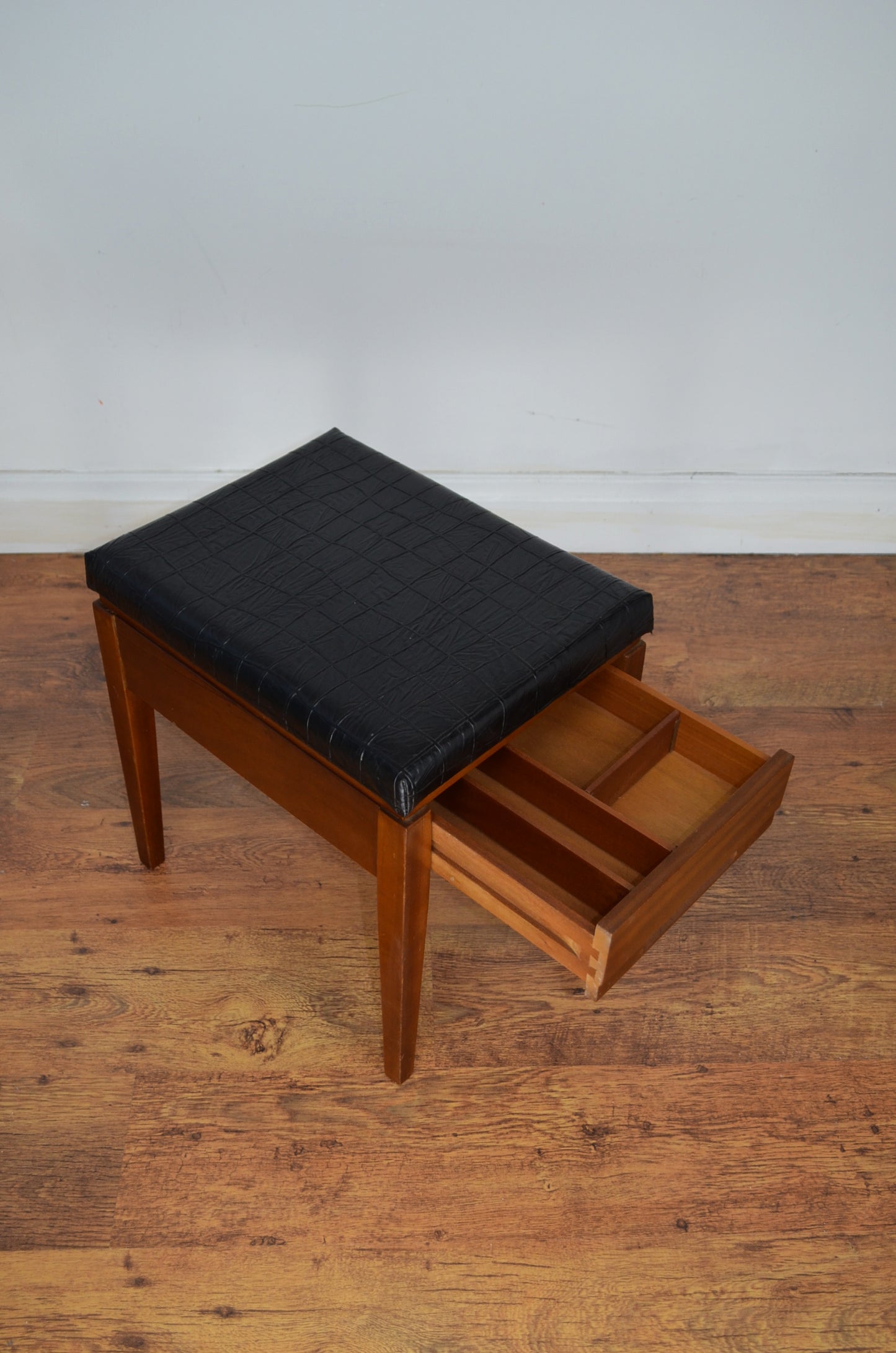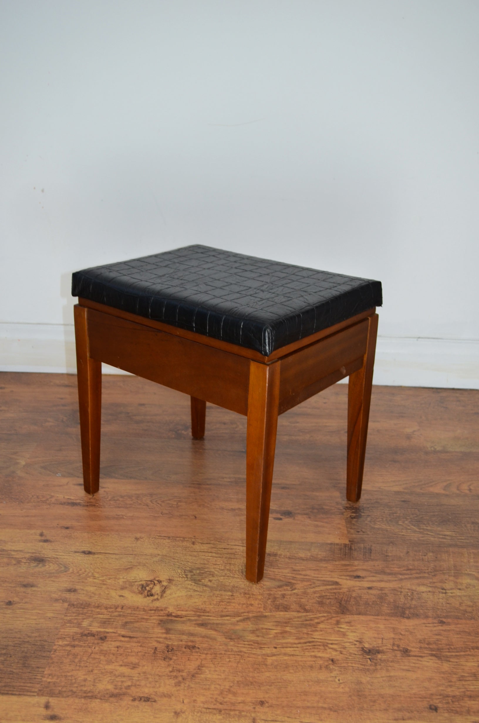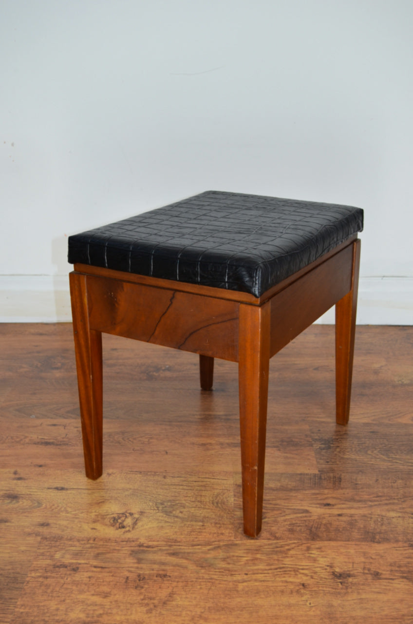 Mid century danish style piano/hobby stool with draw and faux leather. Great look and finish with dove tail joints and in clean vintage condition.