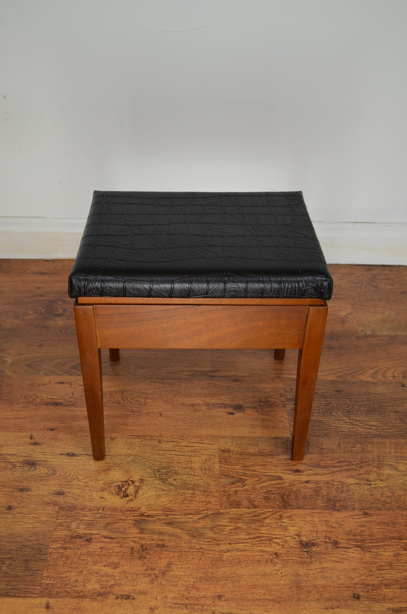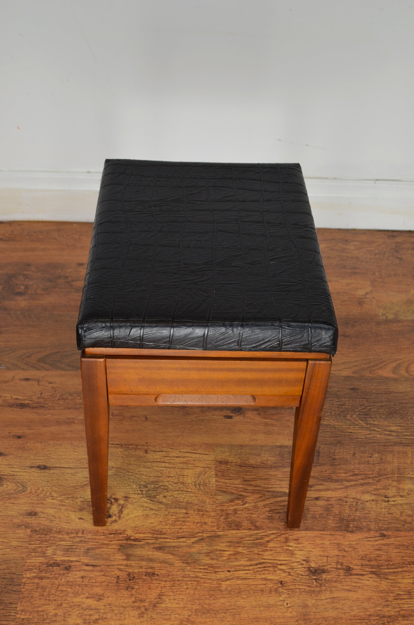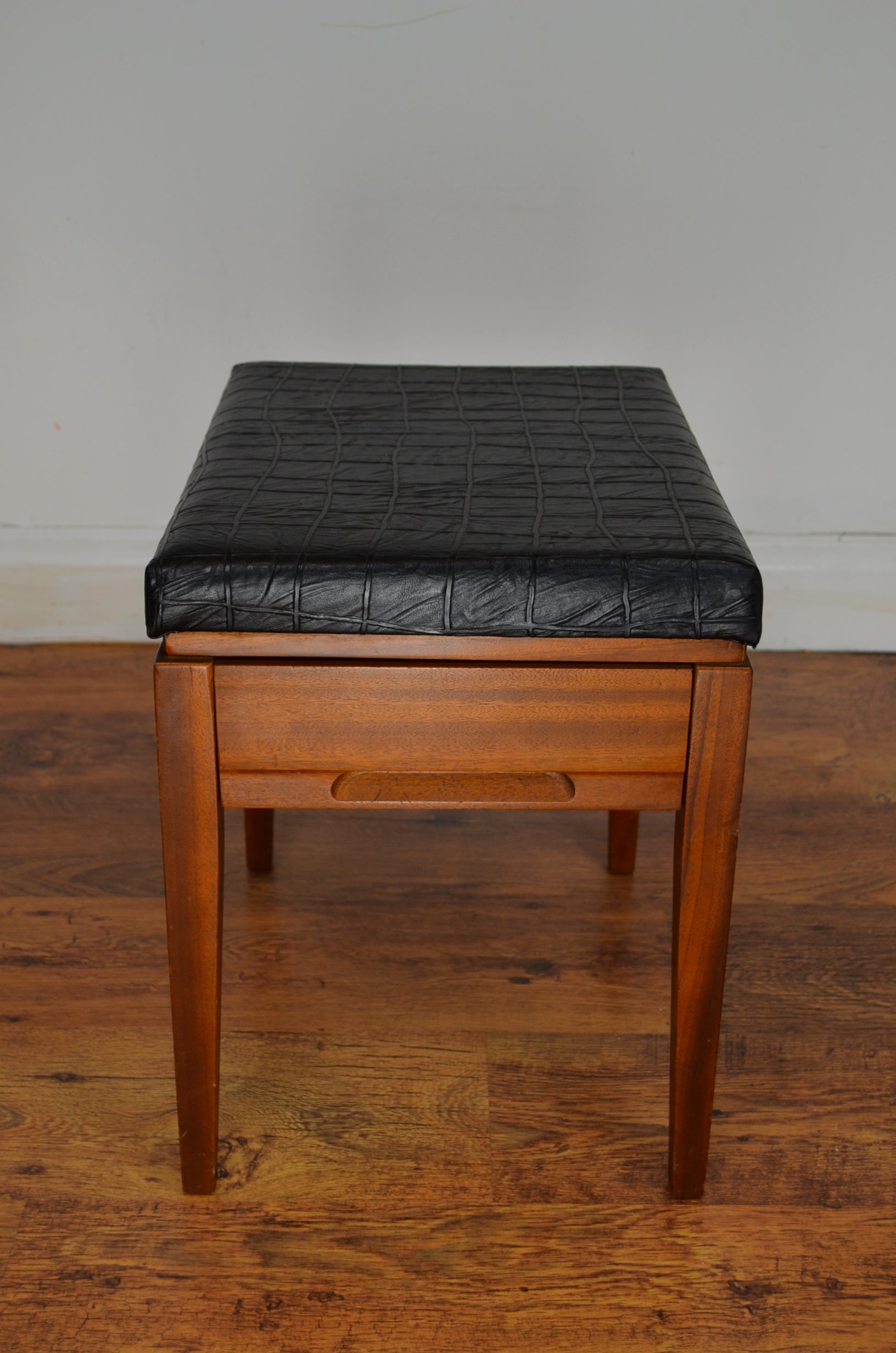Mid century danish style piano/hobby stool with draw and faux leather. Great look and finish with dove tail joints and in clean vintage condition.