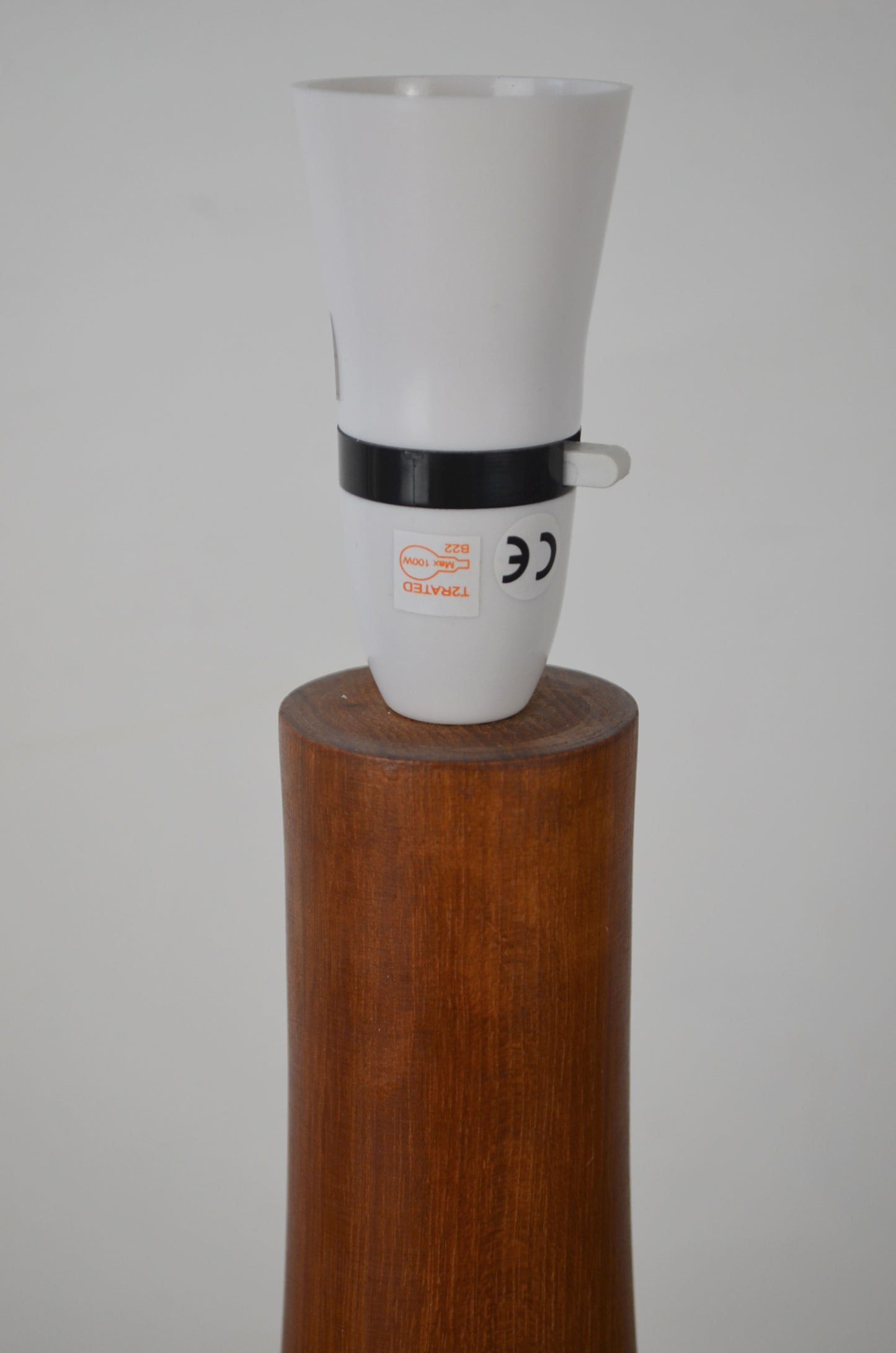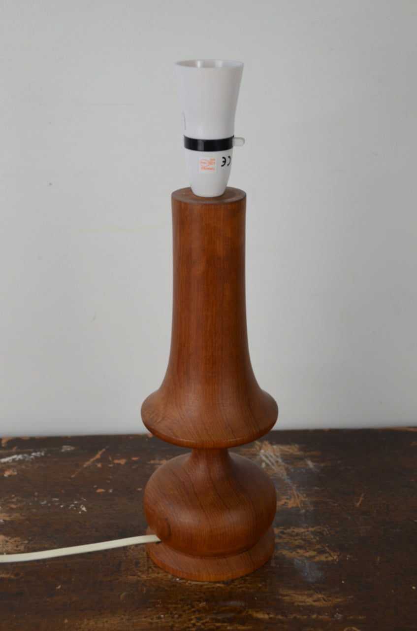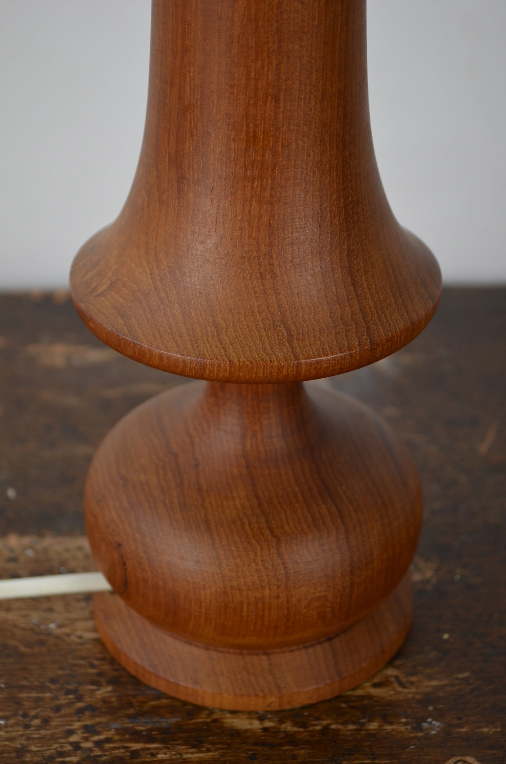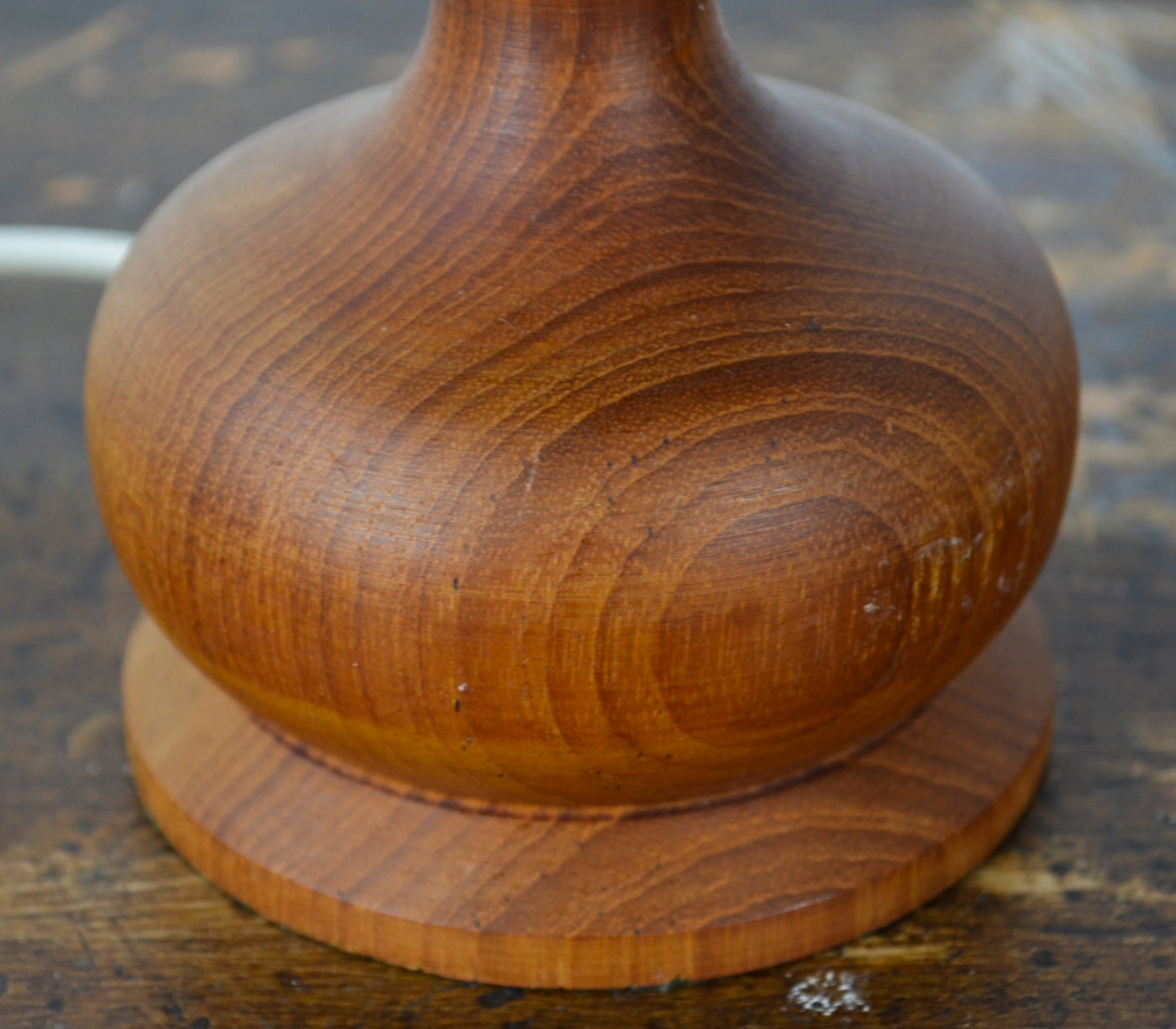 A vintage mid 20th Century hand turned teak table lamp light with fantastic colour and grain. One of a near identical pair available. (Shade included)