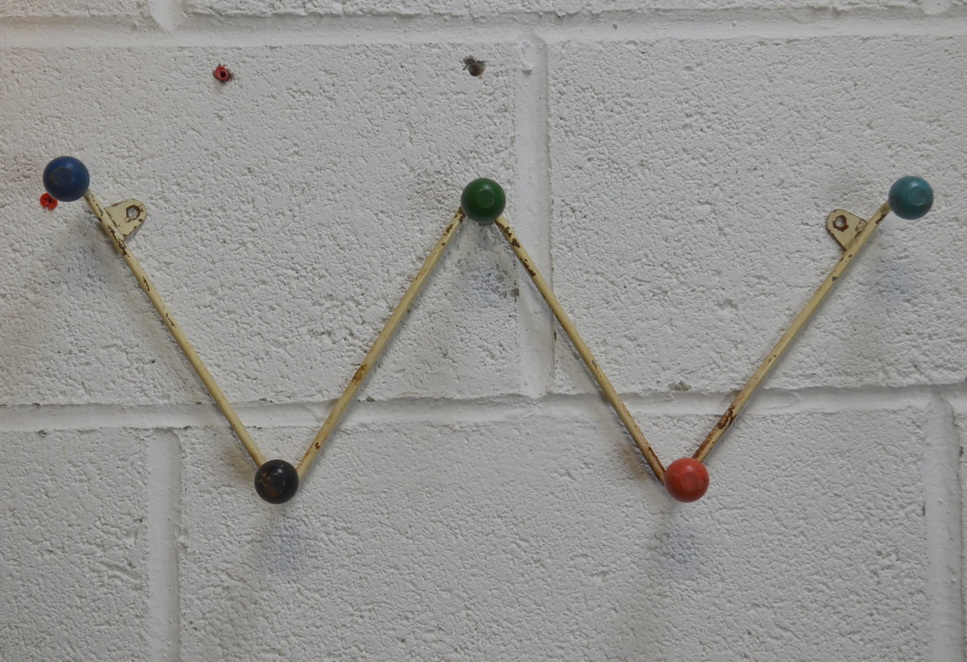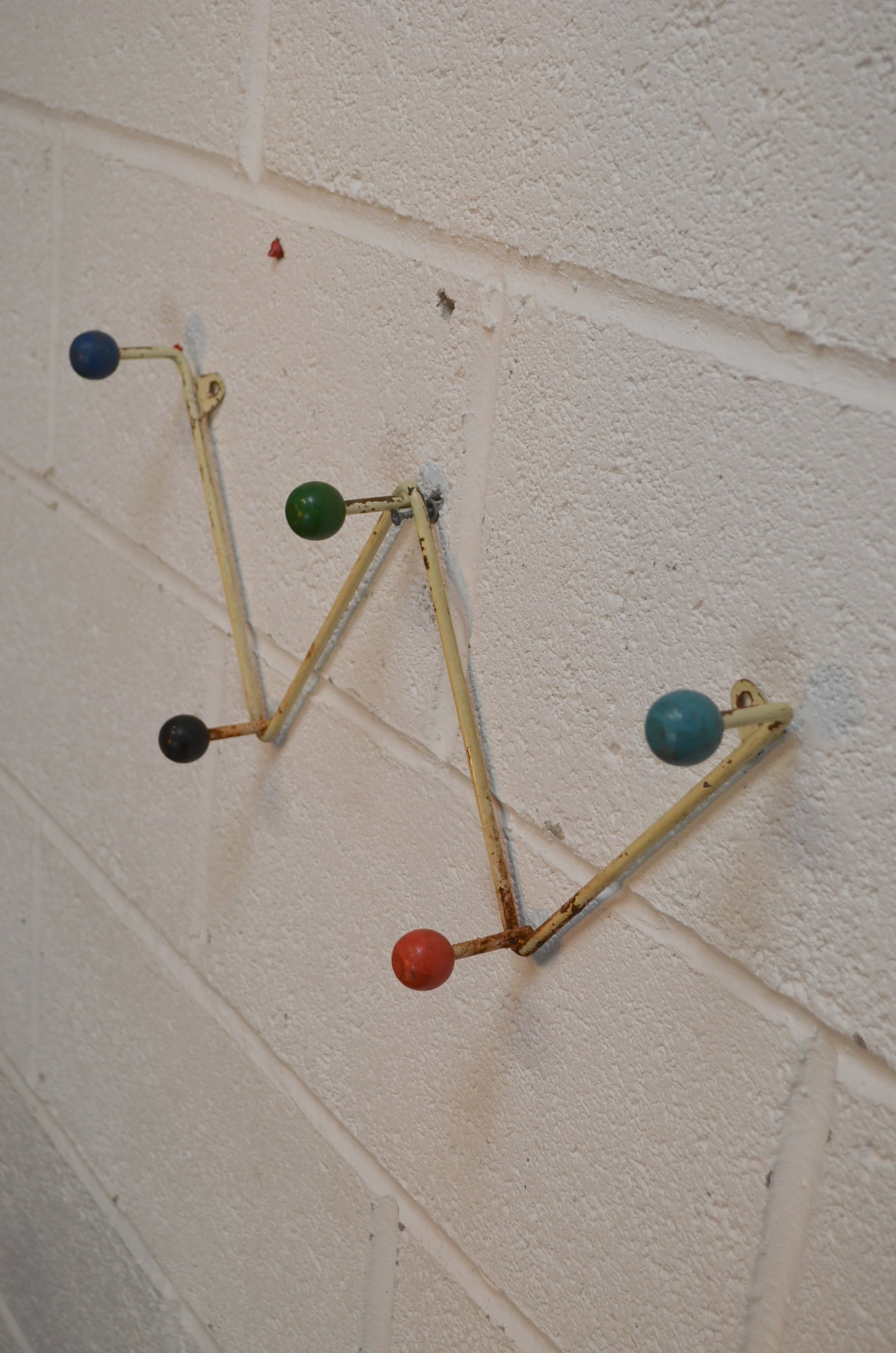 Atomic mid century coat/hat wall mounted rack with fixing points. Original multi coloured ball hangers on a white wire fame.
