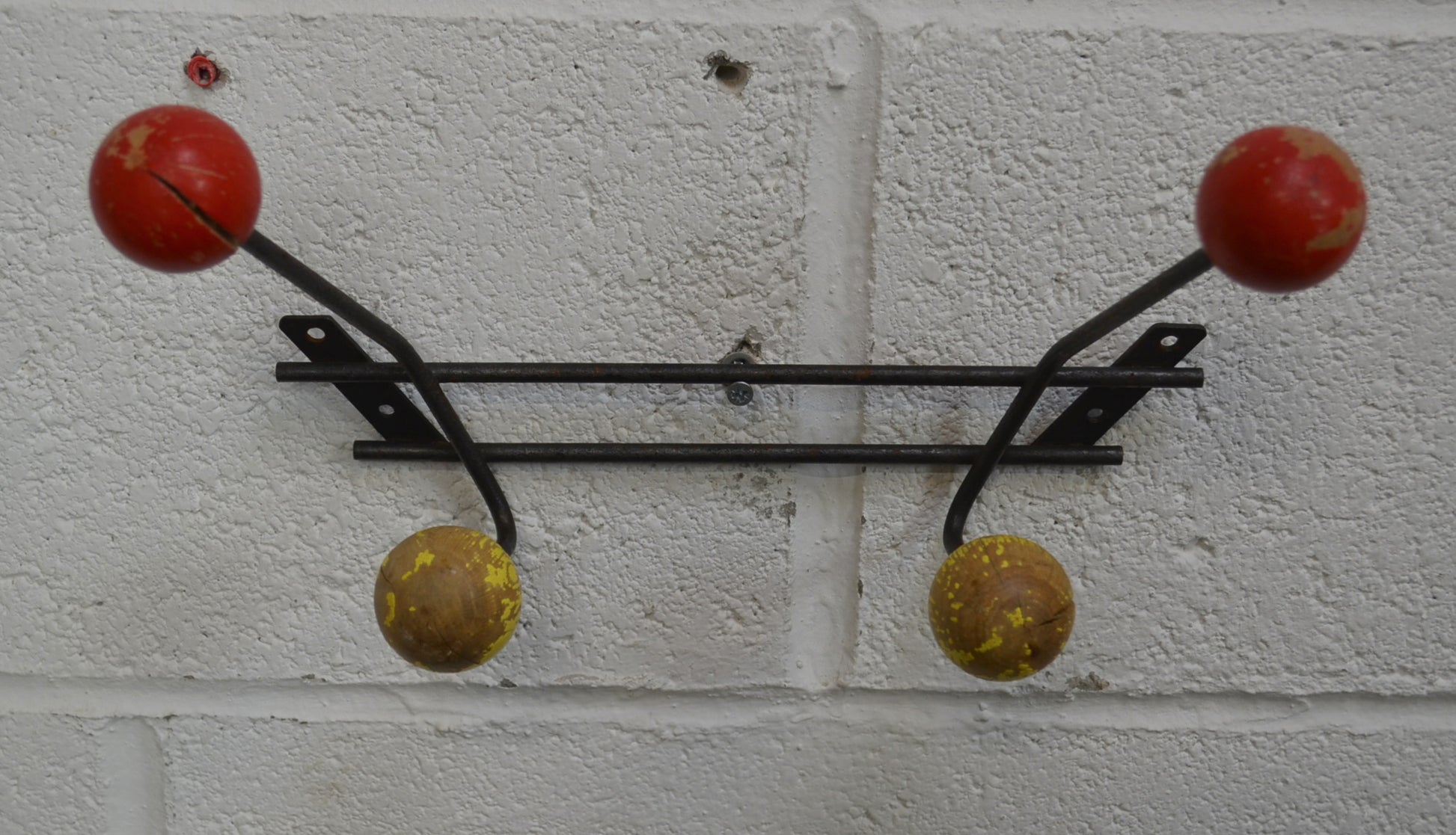 Atomic mid century coat/hat wall mounted rack with fixing points. Original multi coloured ball hangers on a black wire fame.