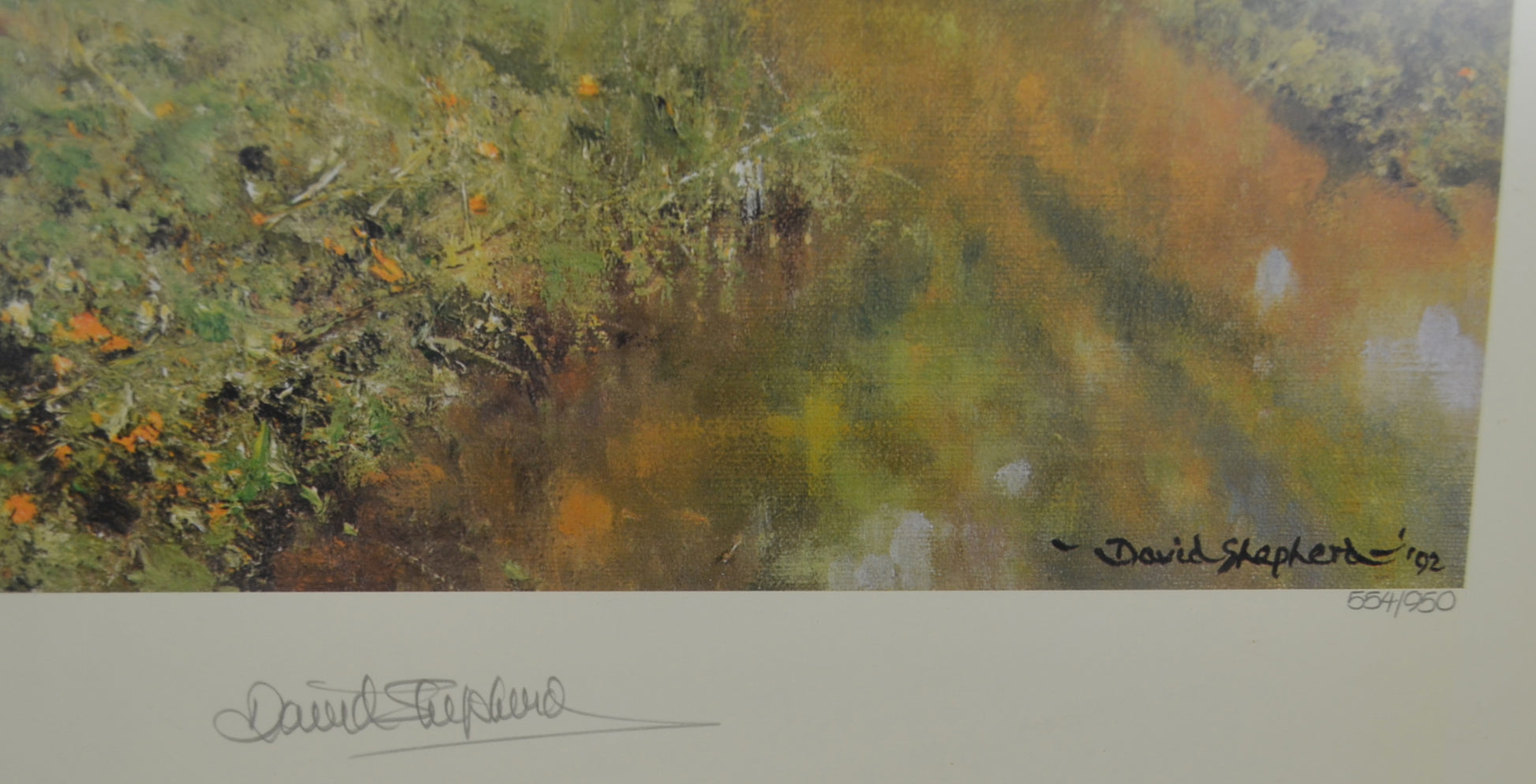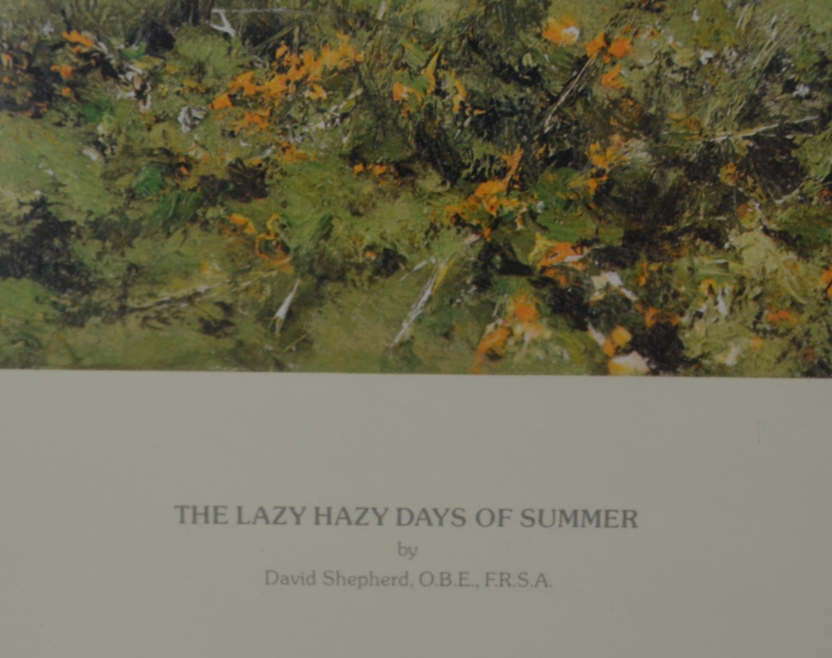 An original limited edition print titled Lazy Hazy Days of Summer and personally signed by the artist David Shepherd (1931-2017) in 92. Showing two horses, mother and foal, relaxing by a stream during a hot sunny afternoon.
