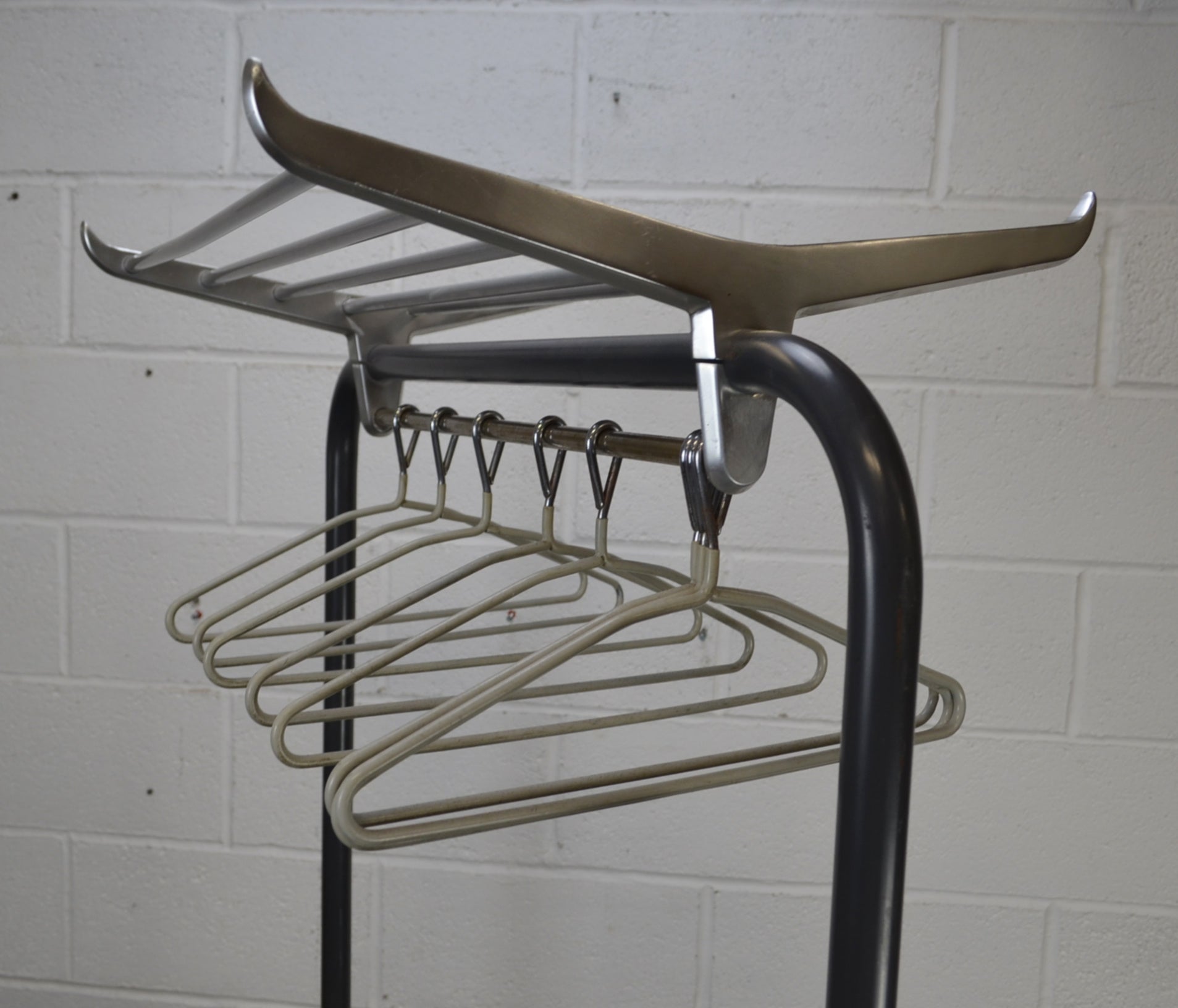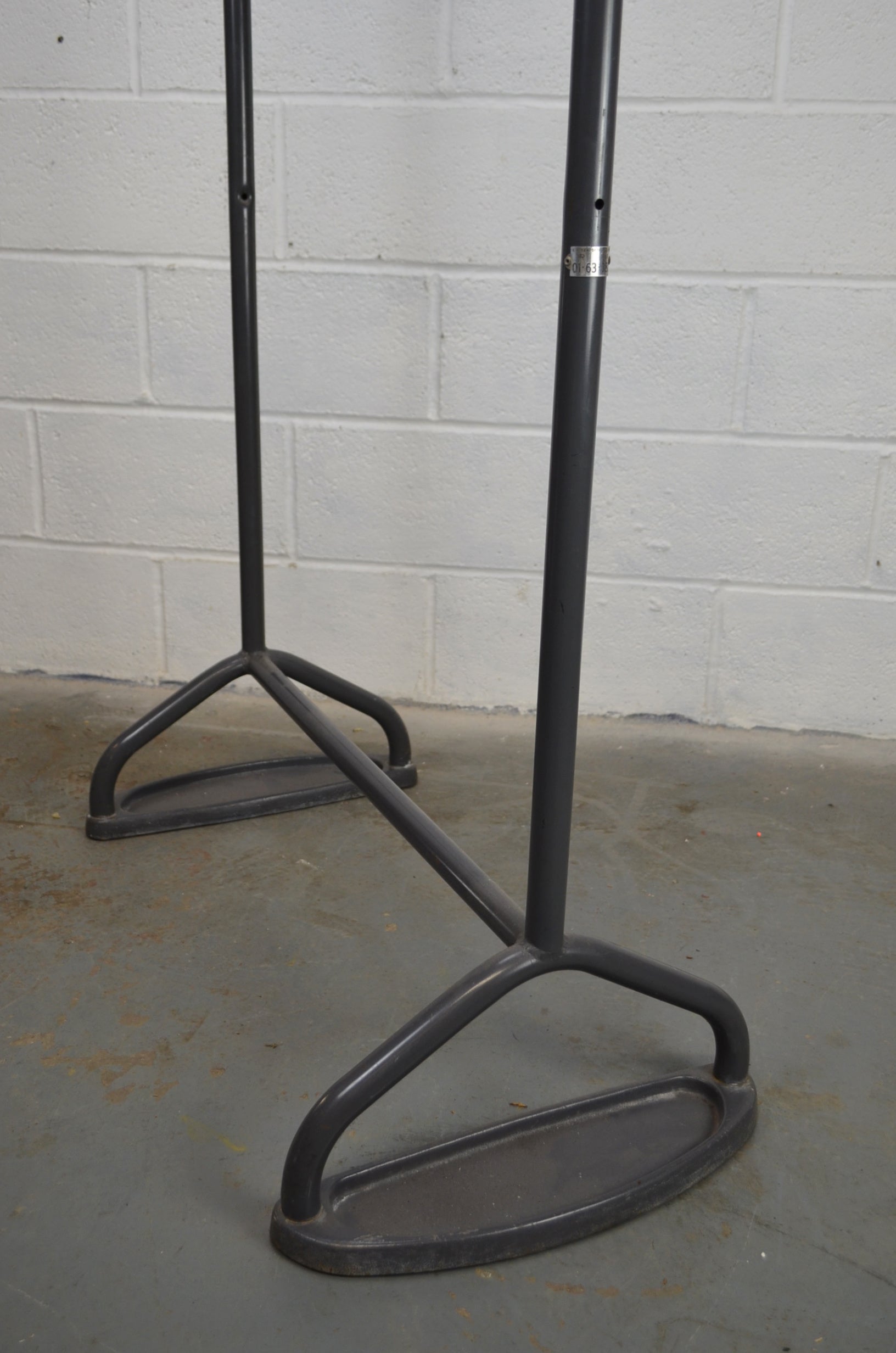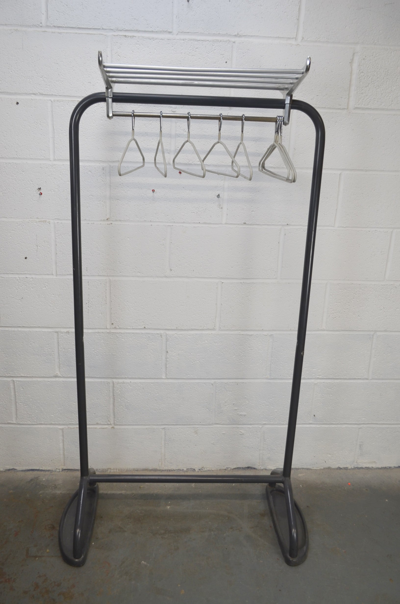 R. W. Bamforth & Co. Ltd - a vintage mid 20th century 1960s chrome and painted metal hallway freestanding double clothes rail / rack stand. The stand having a steel tubular frame with angled rack to top and raised rail with eight hangers. All raised on triangular supports and stretchers. Applied manufacturer's plaque to side.