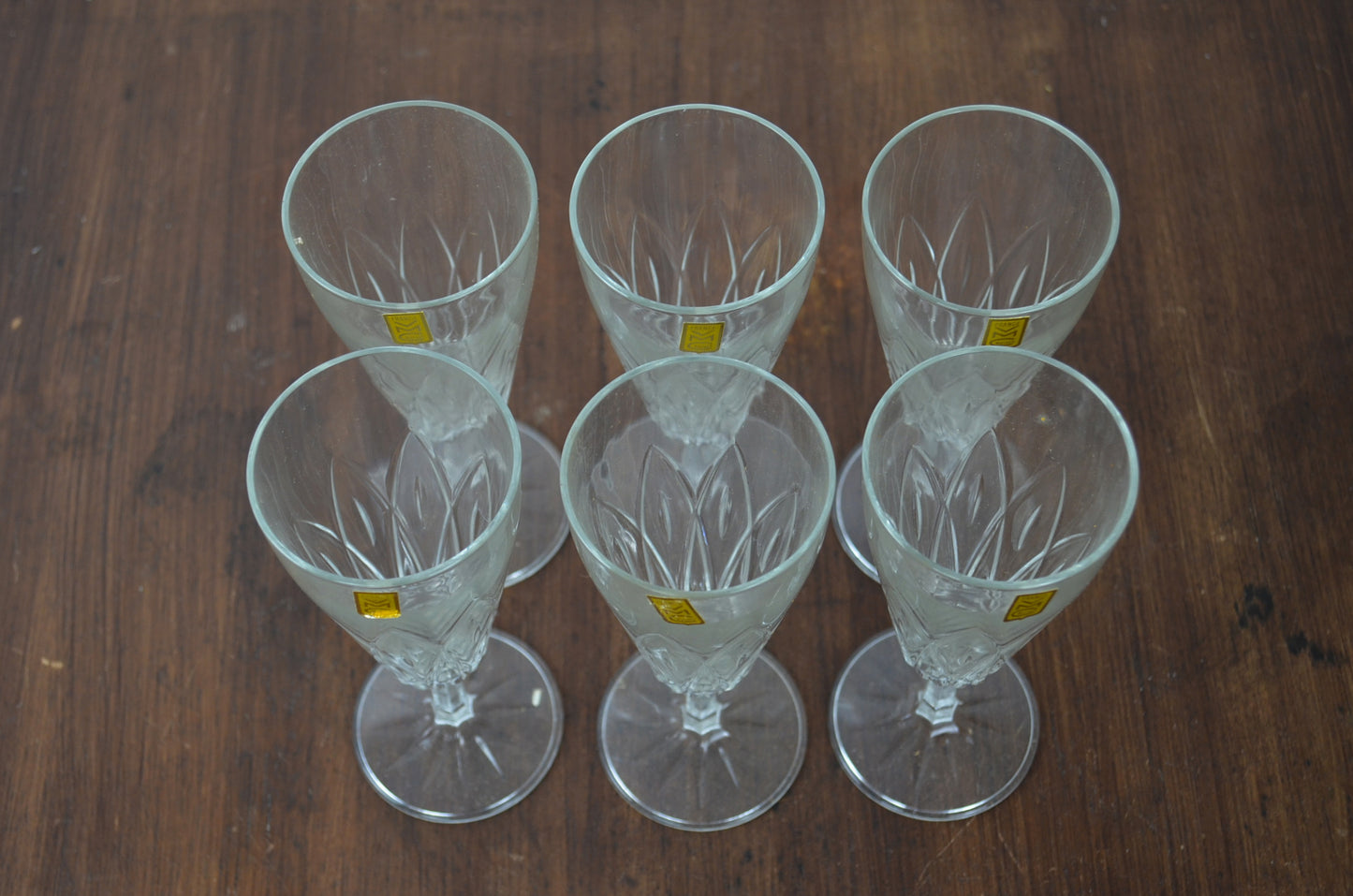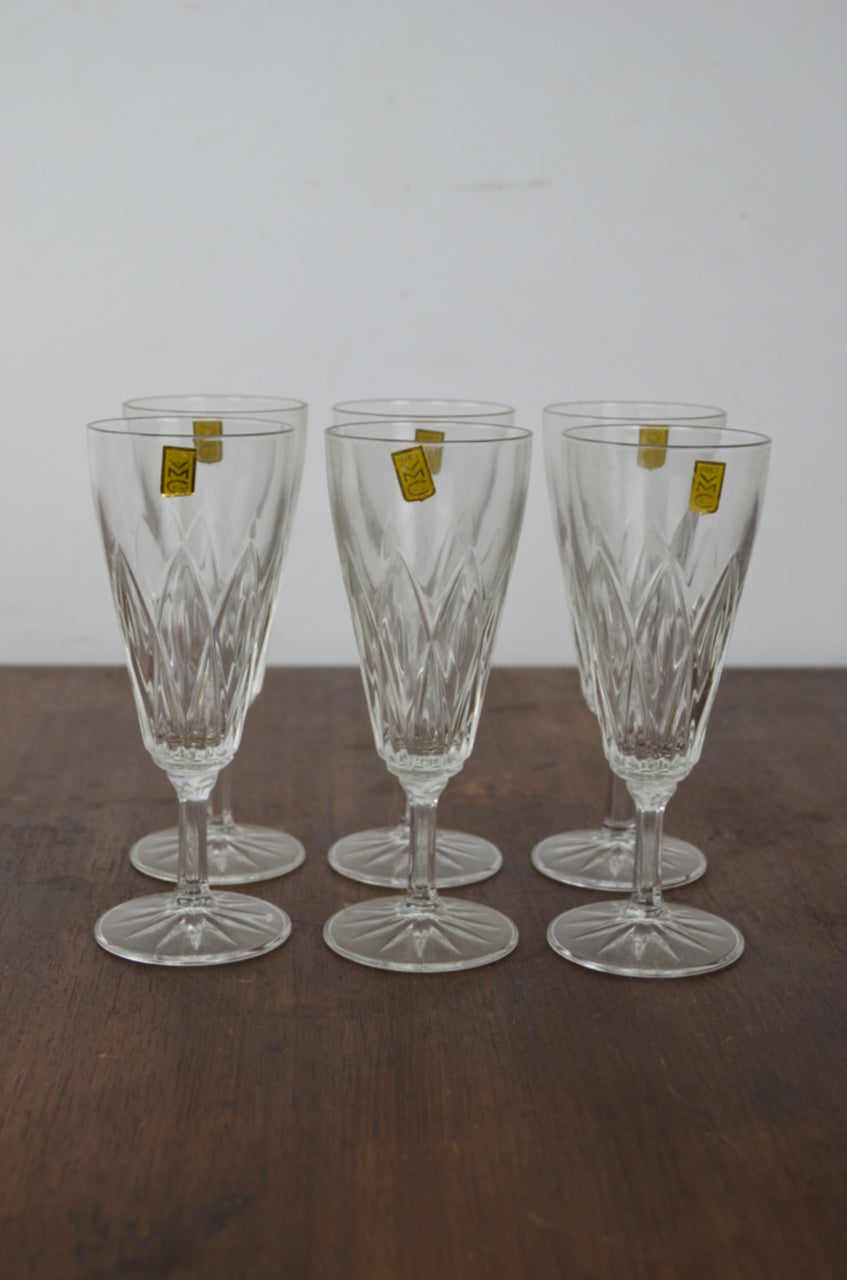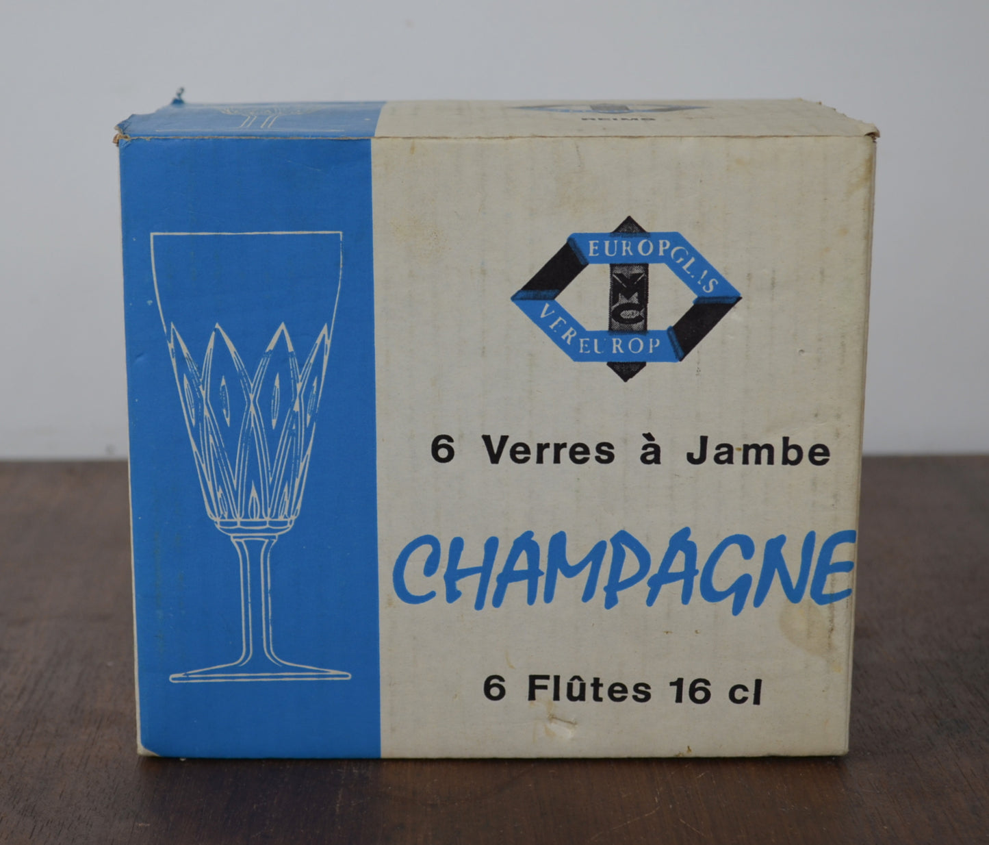 A set of six vintage French VMC Reims stem champagne/wine glasses in original box and with stickers.