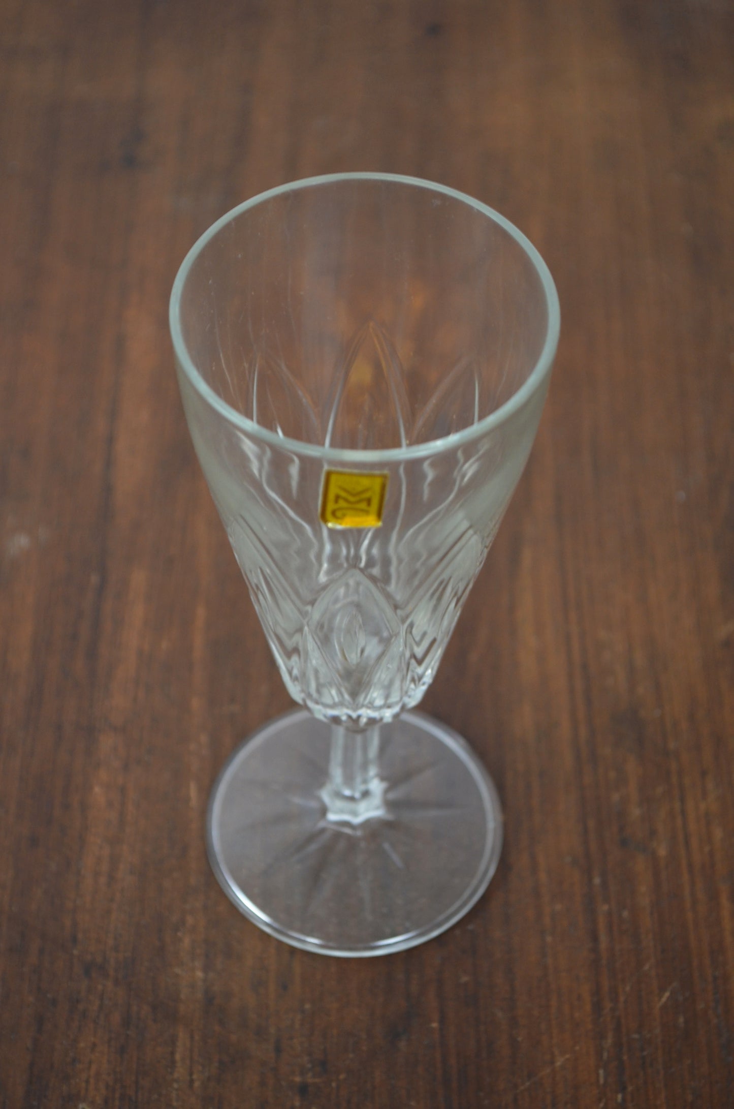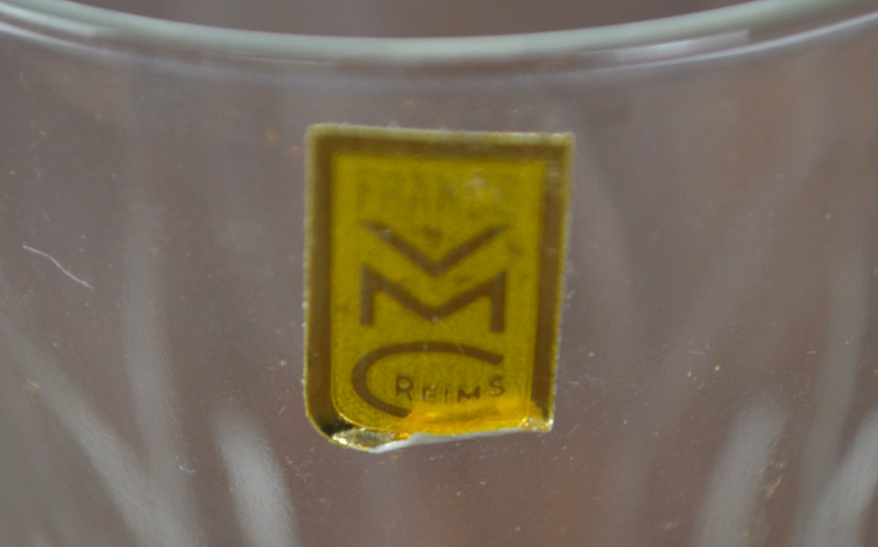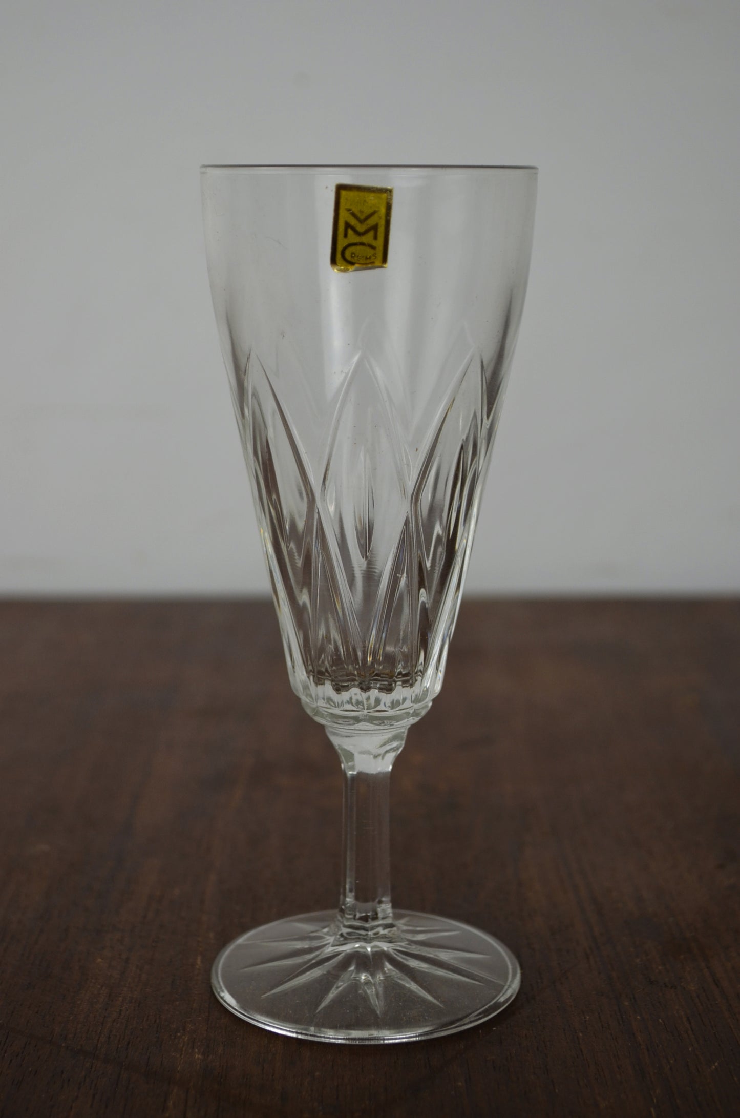 A set of six vintage French VMC Reims stem champagne/wine glasses in original box and with stickers.