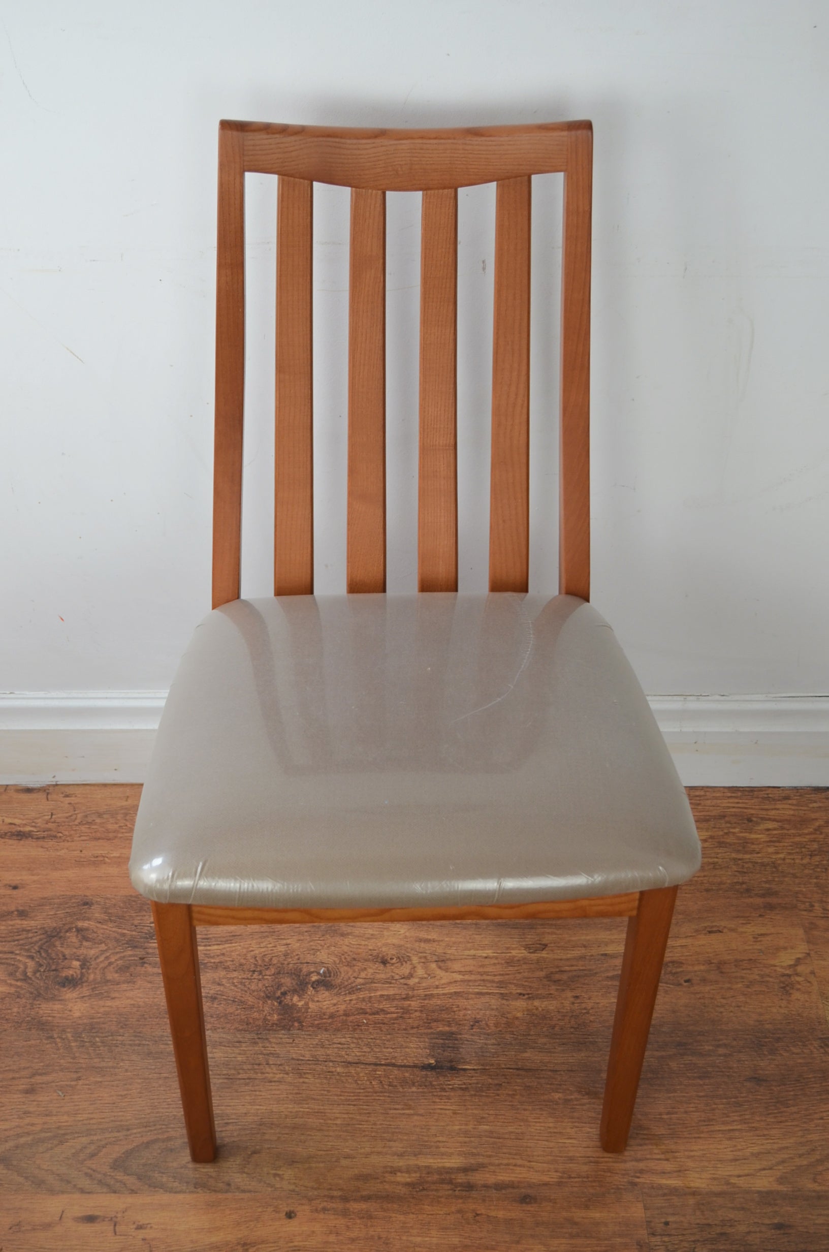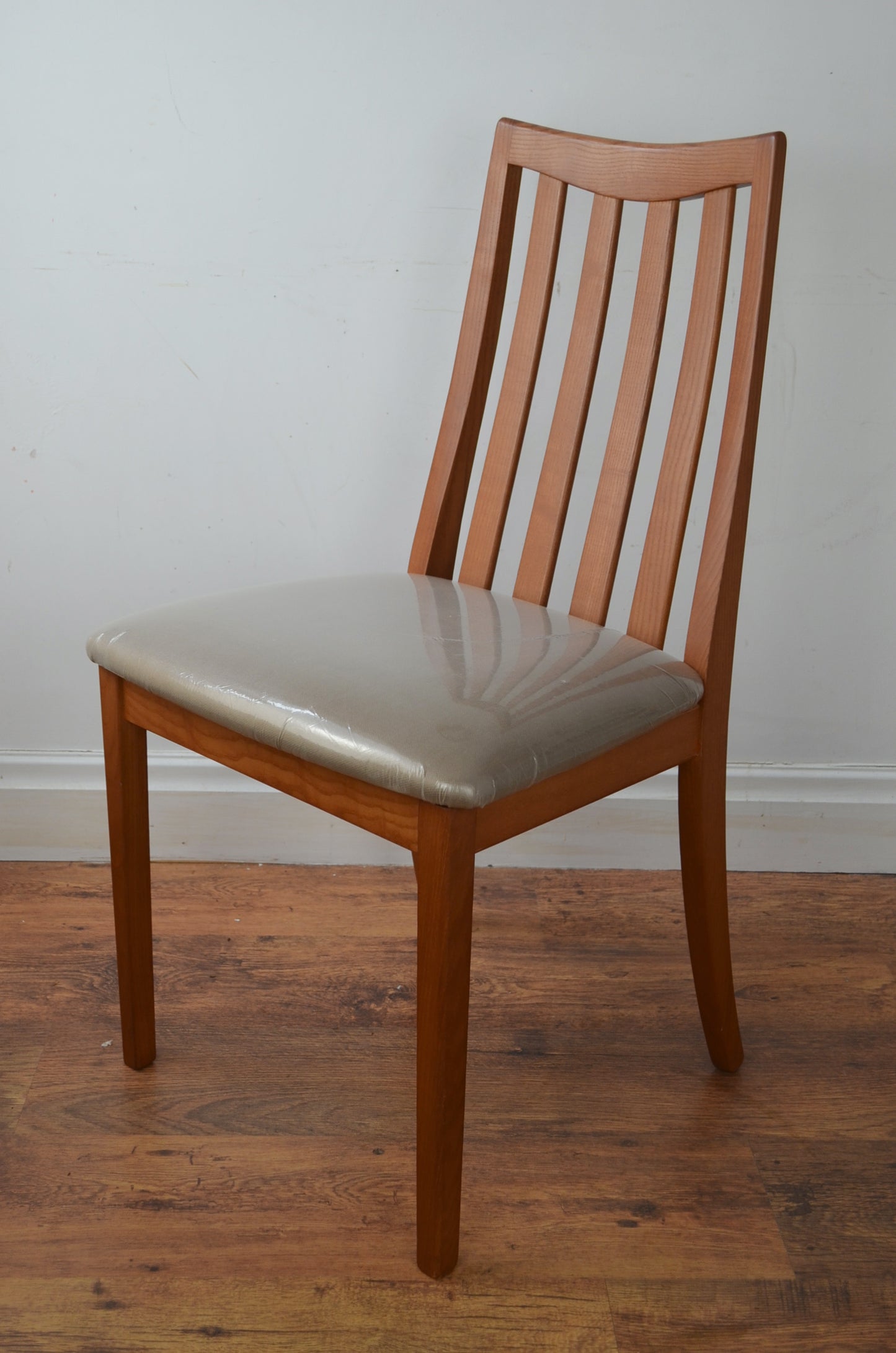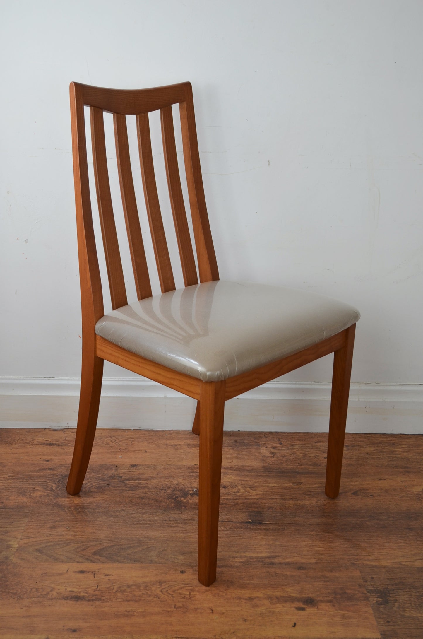 Lesley Dandy - G Plan - Fresco Range - An original set of 4 retro vintage 20th Century teak wood dining chairs being raised on tapering legs with overstuffed pad seats and railed back rests with shop top rails.
