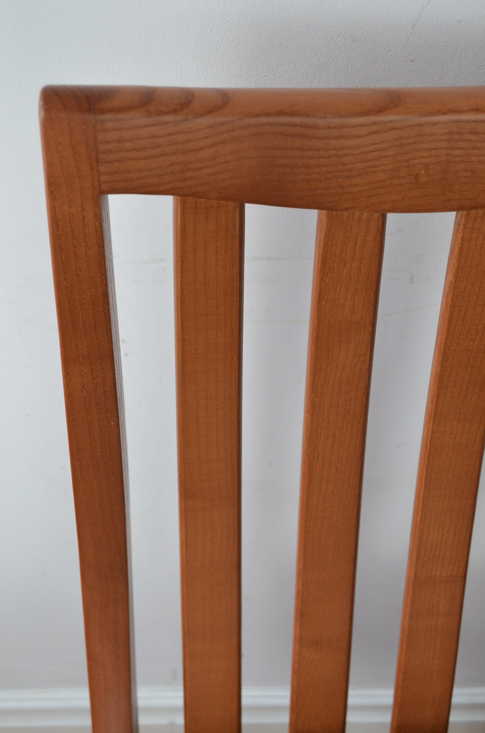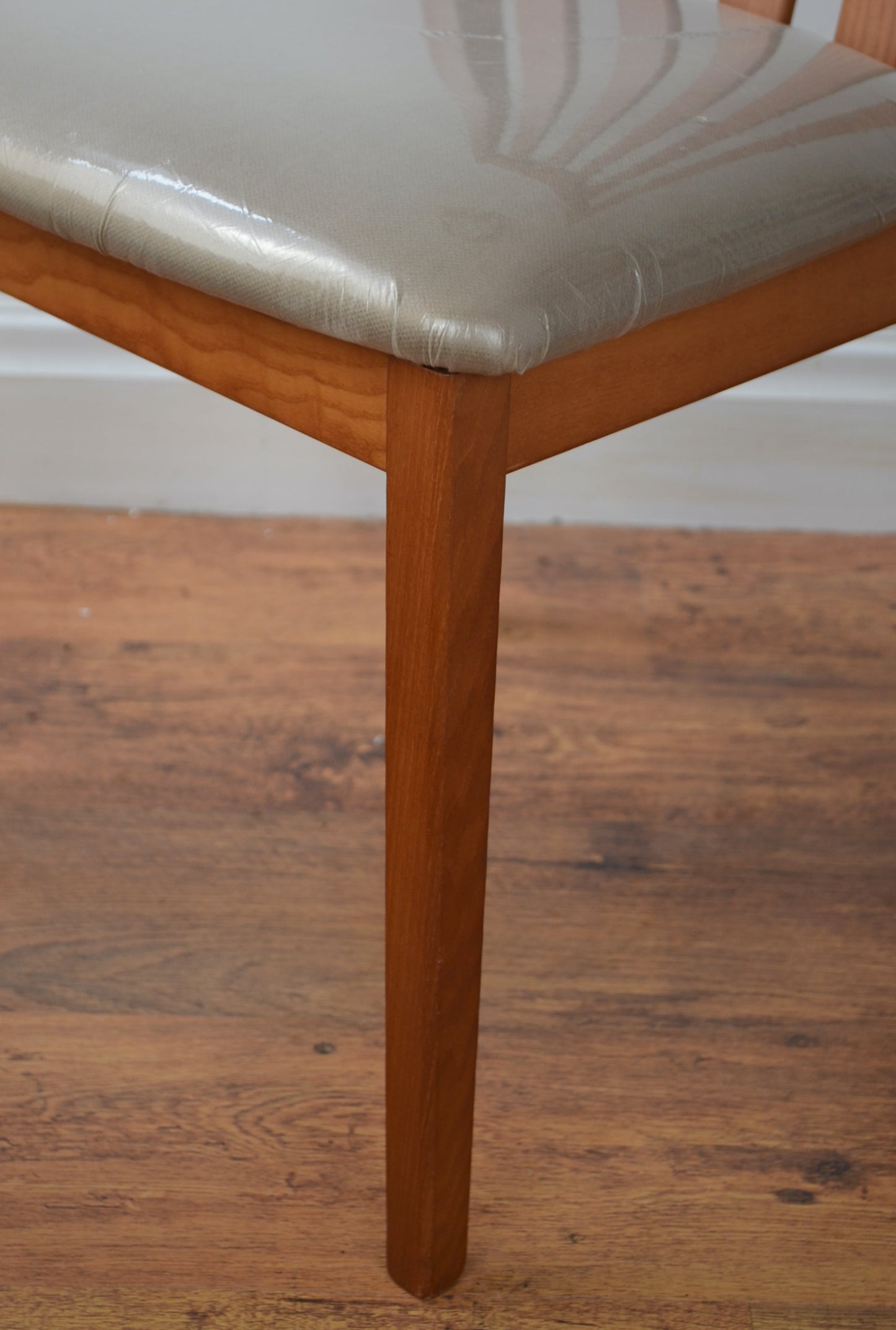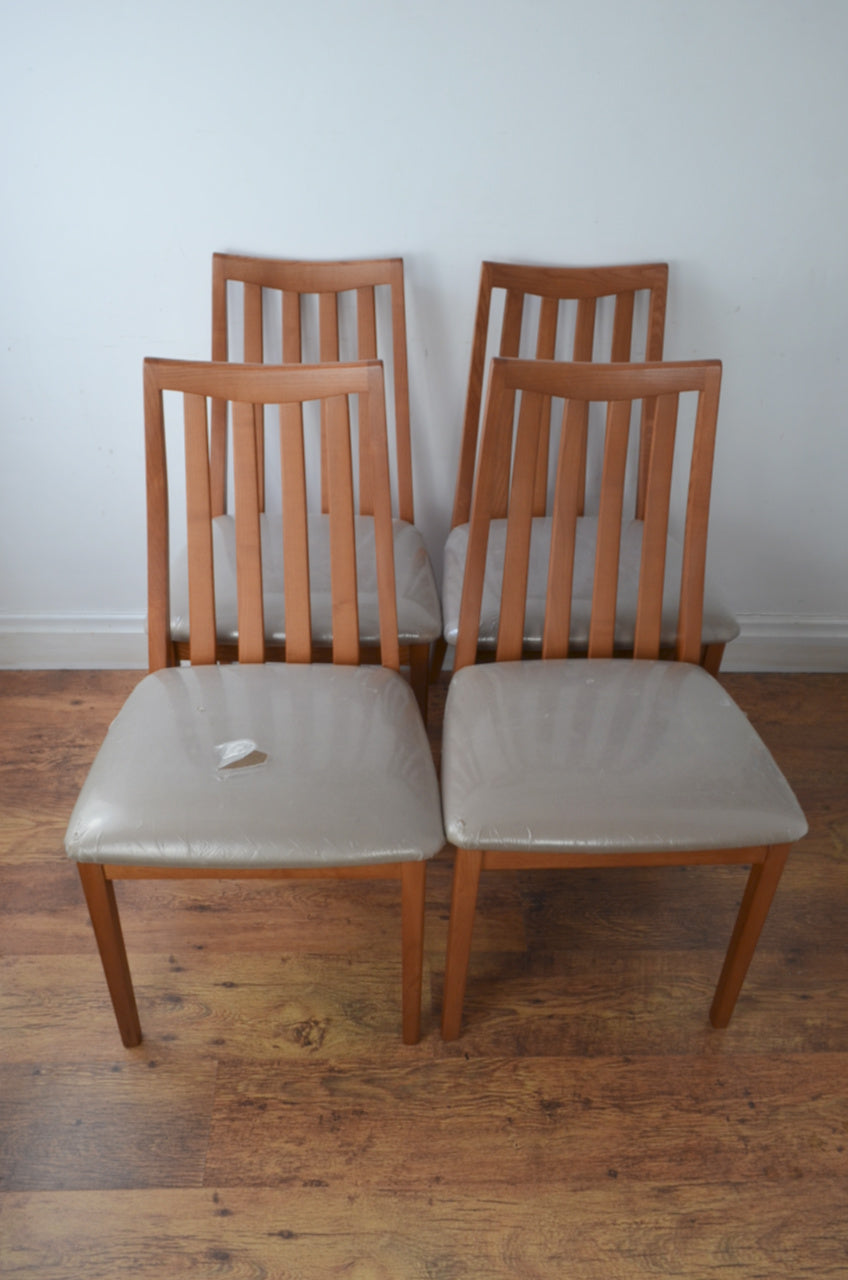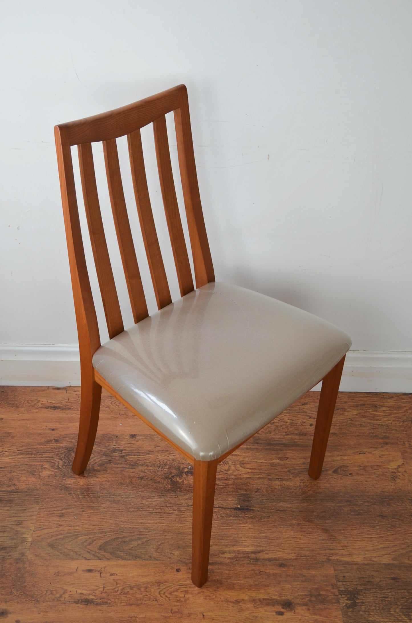 Lesley Dandy - G Plan - Fresco Range - An original set of 4 retro vintage 20th Century teak wood dining chairs being raised on tapering legs with overstuffed pad seats and railed back rests with shop top rails.