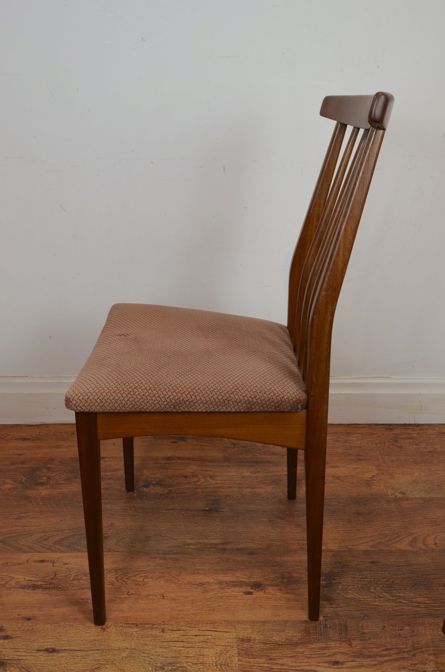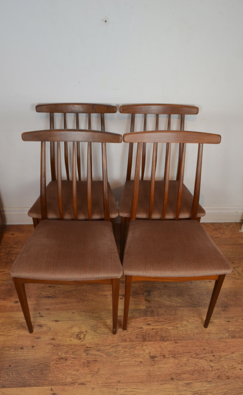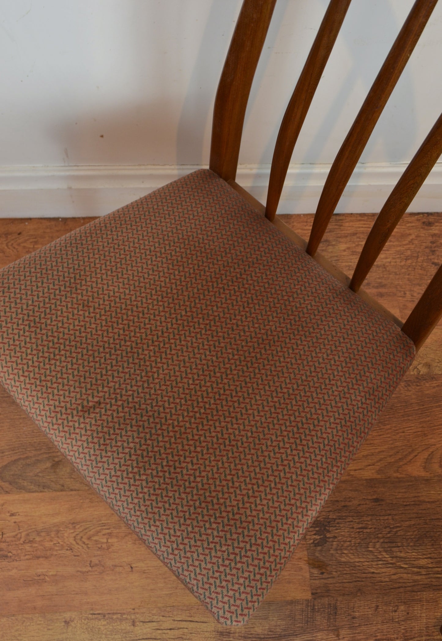 A set of four 1970's teak wood framed slated back dining chairs being raised on tapering squared legs with upholstered seats pads. In the manner of Wilkins for G Plan.