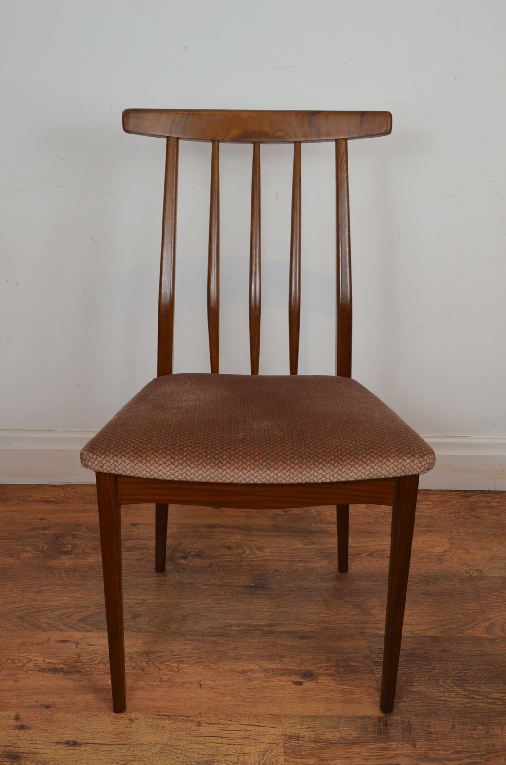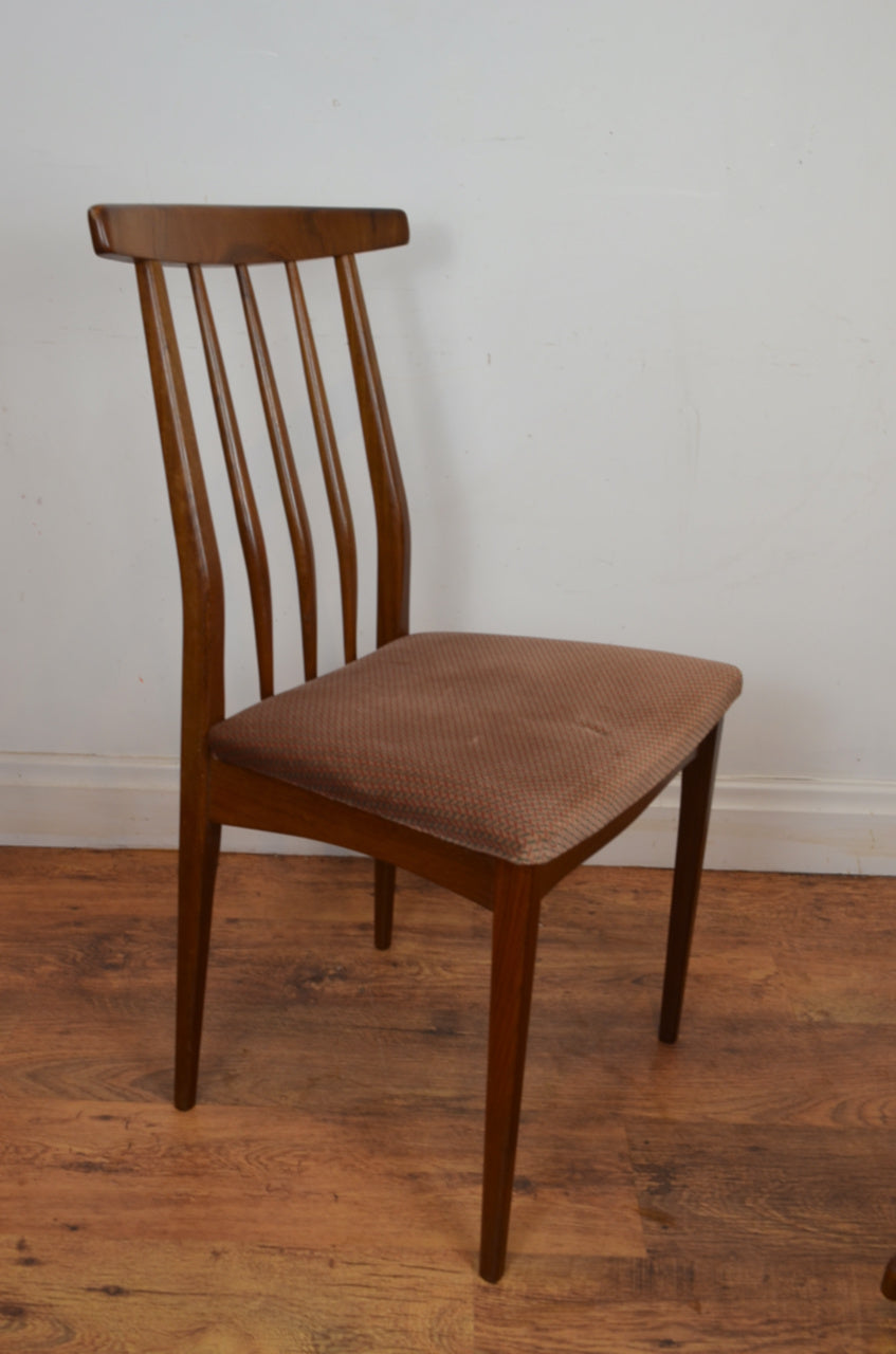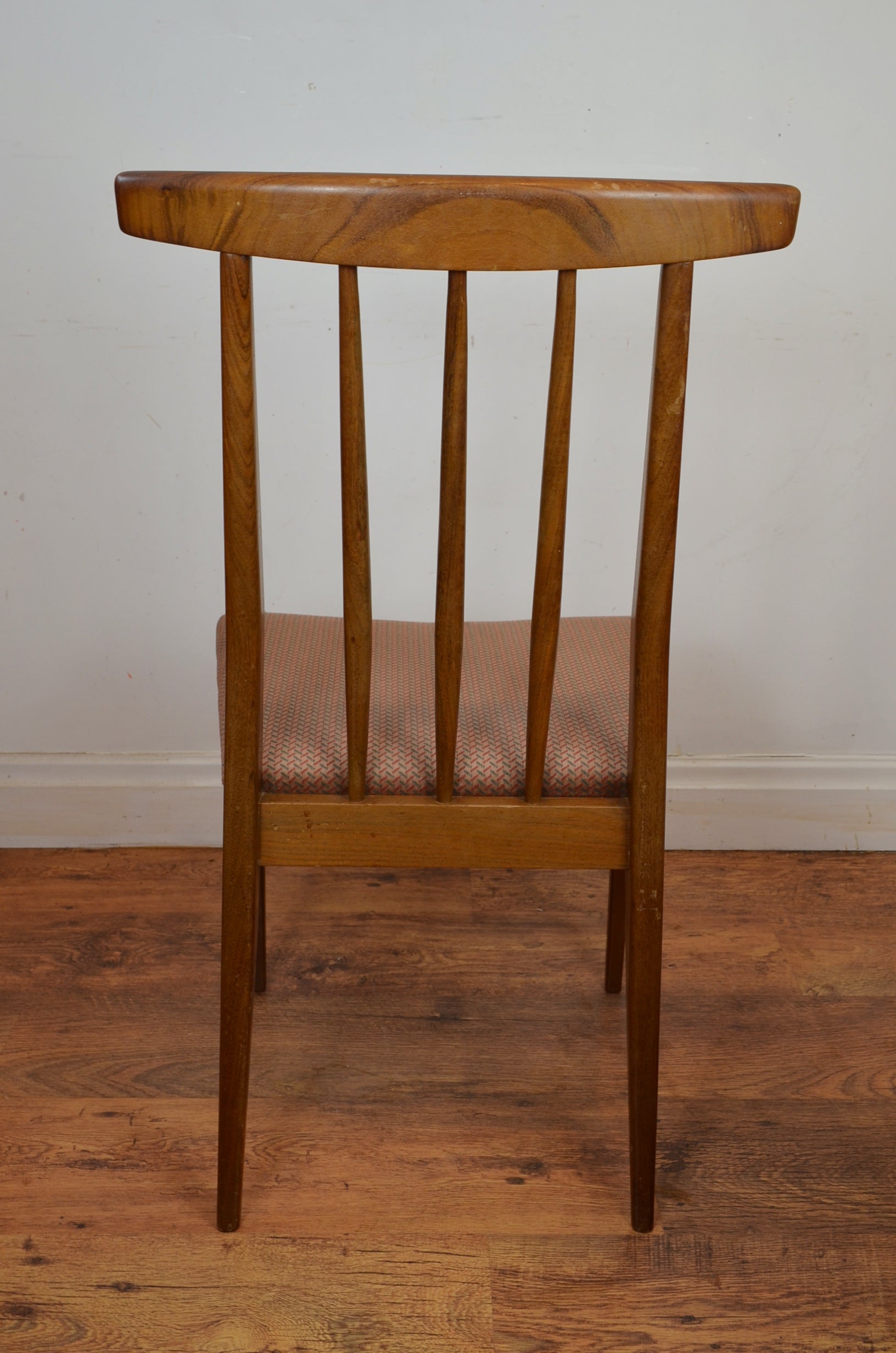 A set of four 1970's teak wood framed slated back dining chairs being raised on tapering squared legs with upholstered seats pads. In the manner of Wilkins for G Plan.