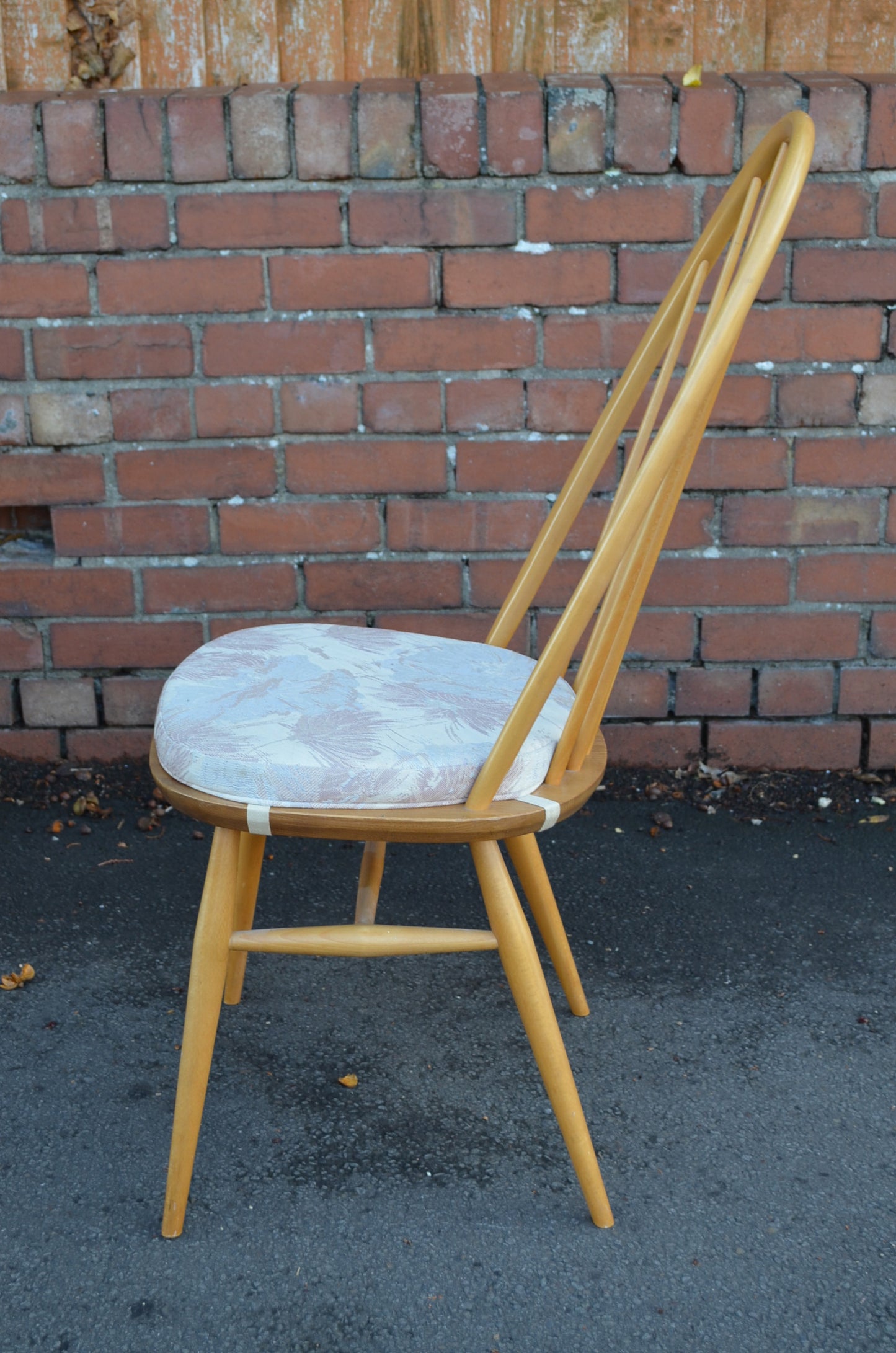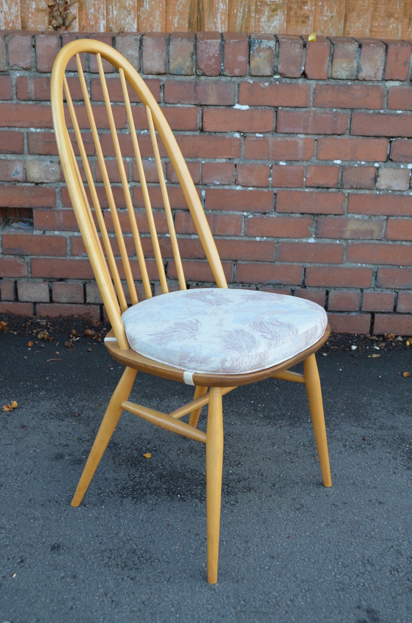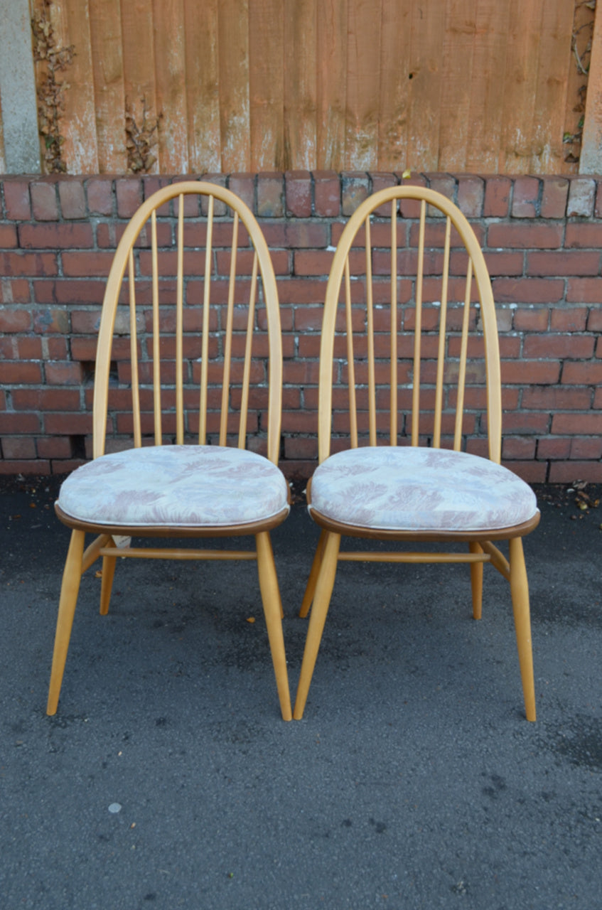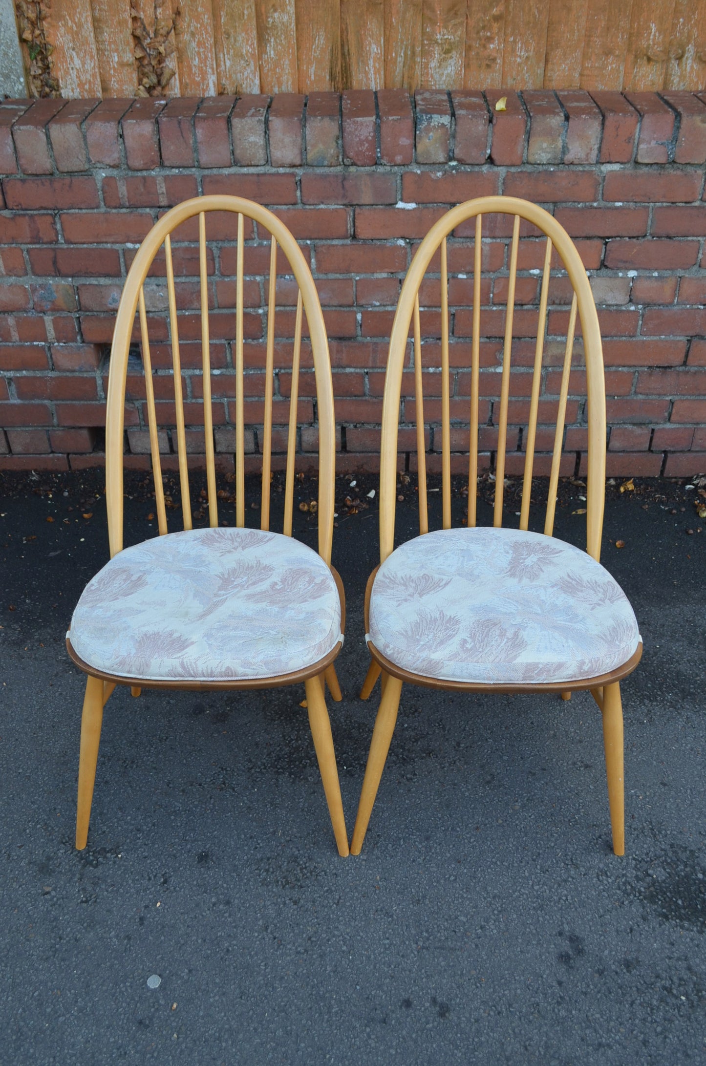 A pair of Ercol beech and elm Quaker dining chairs. Each having hoop backs with spindles raised over tapering splayed supports.