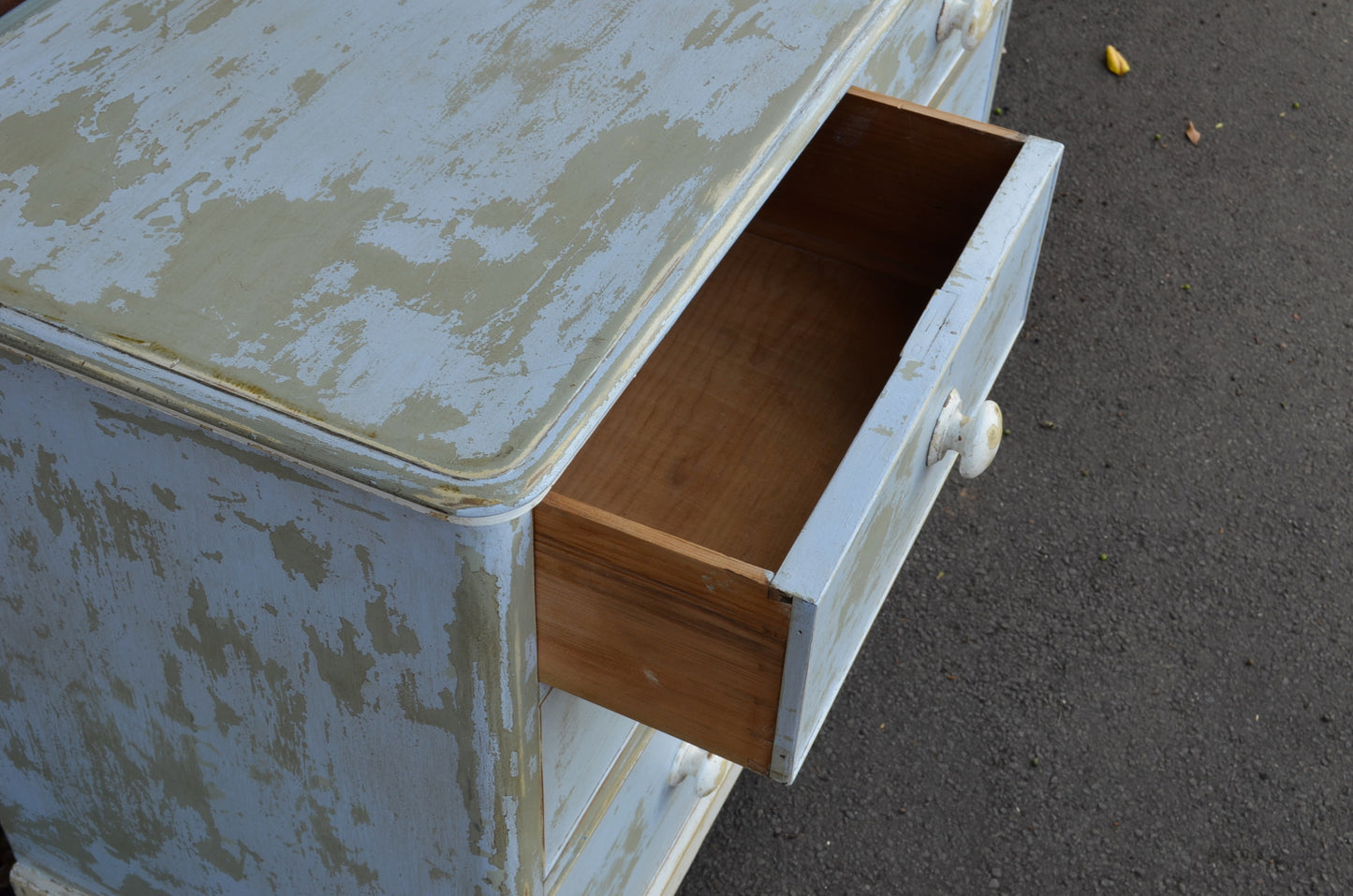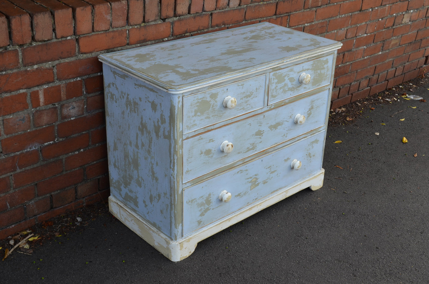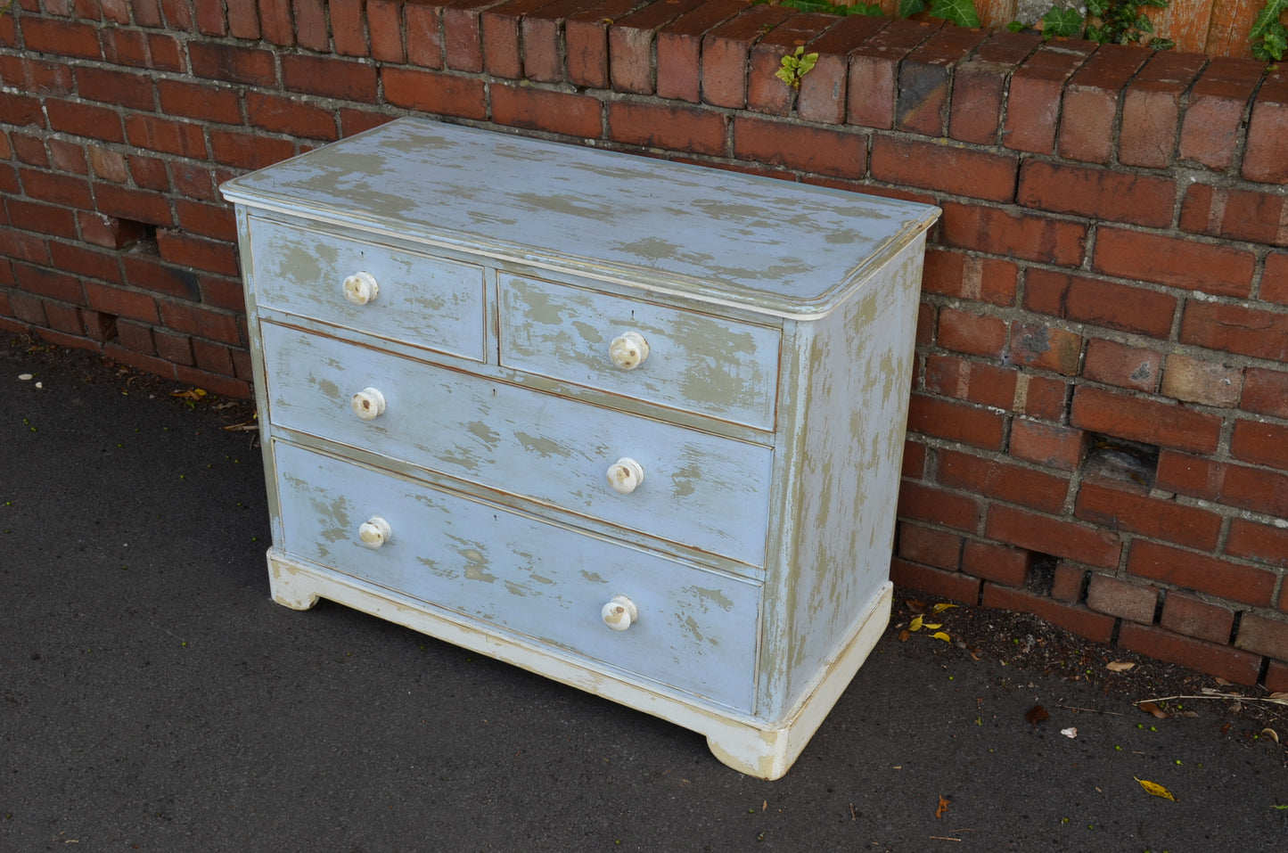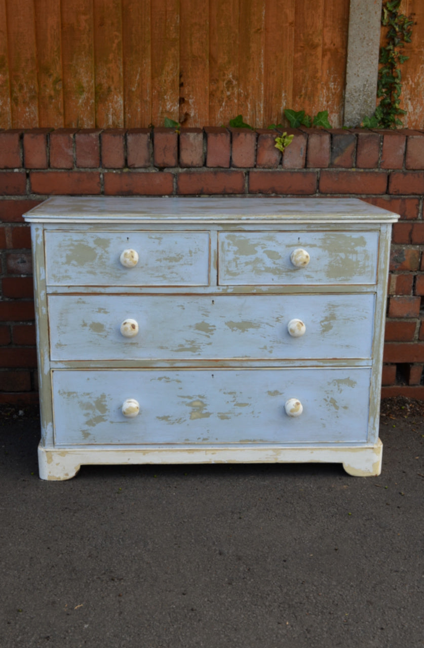 Victorian chest of drawers painted in a later egg shell blue and white which has been distressed to reveal other colours. An attractive piece which is of course very individual.