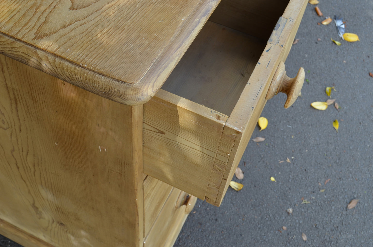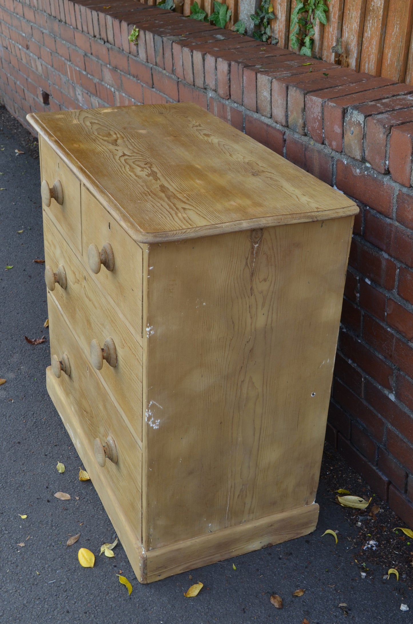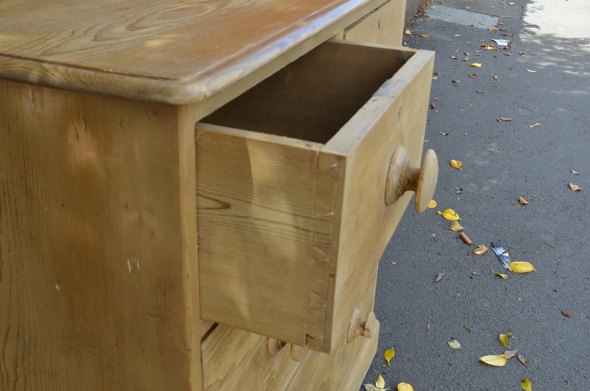 Victorian pine chest of drawers with its original turned knobs. An attractive piece which is of course very individual with loads of character. Benefits from been stripped and clear waxed.