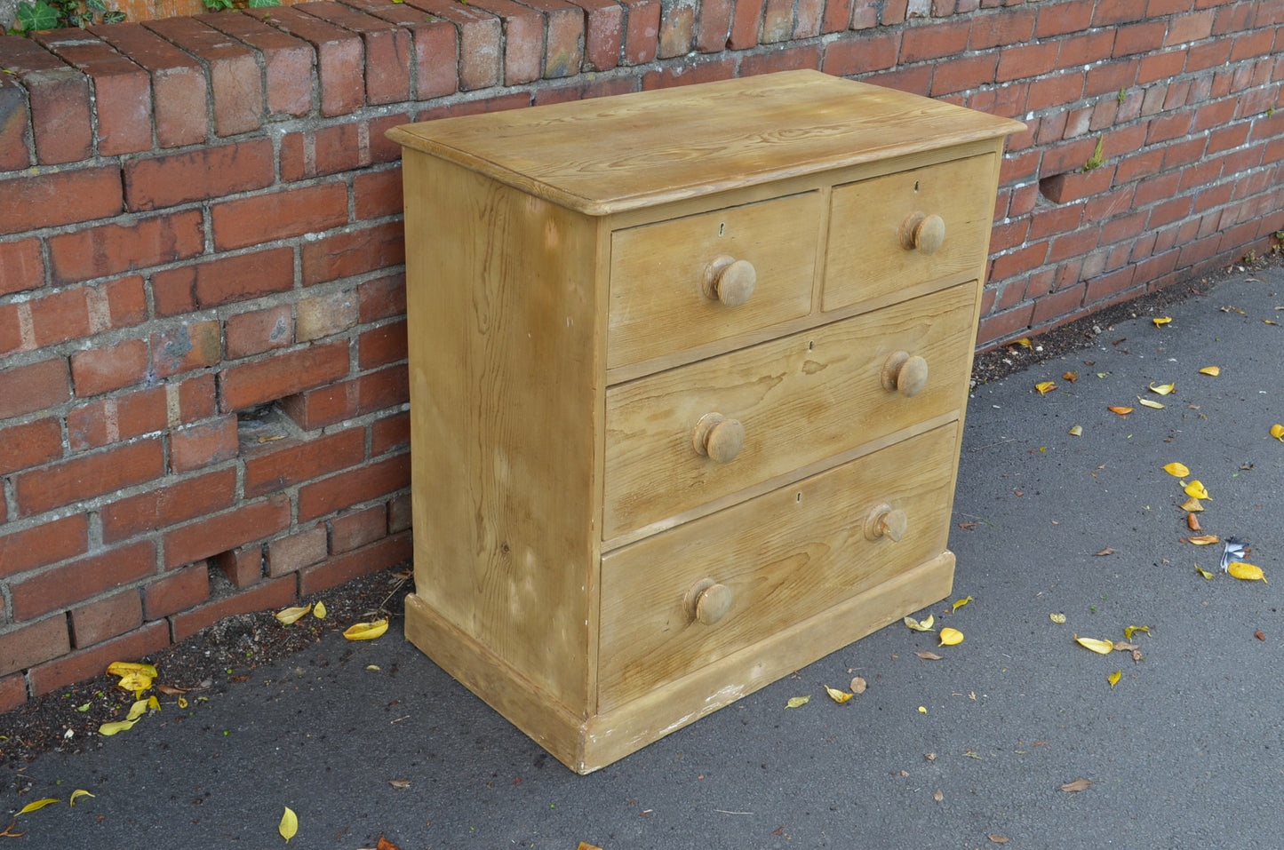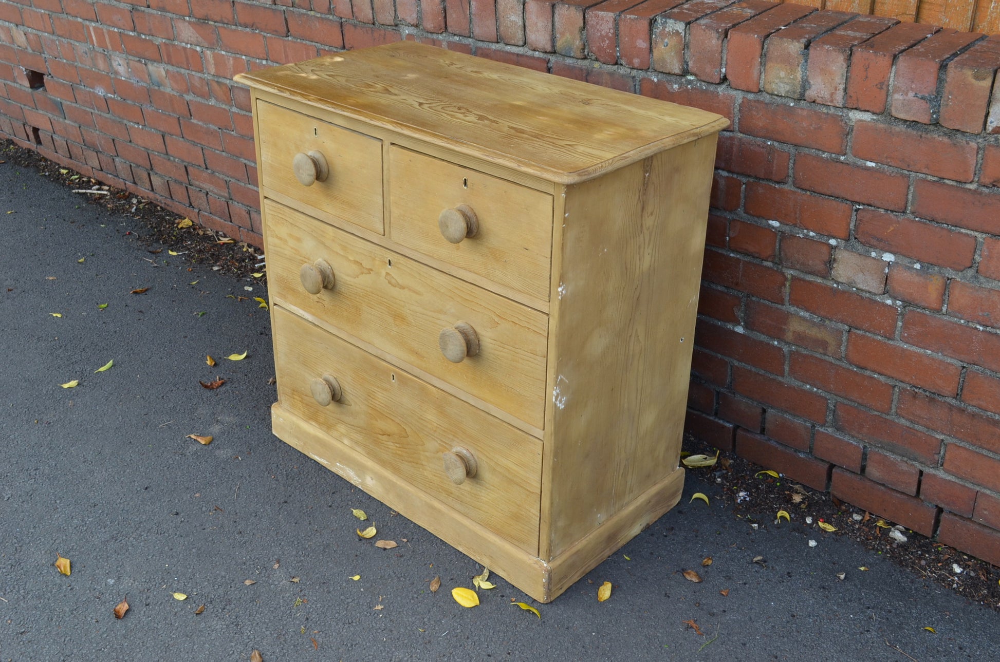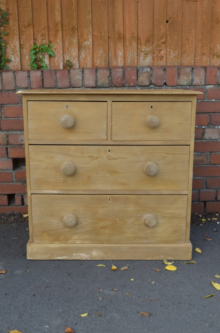Victorian pine chest of drawers with its original turned knobs. An attractive piece which is of course very individual with loads of character. Benefits from been stripped and clear waxed.