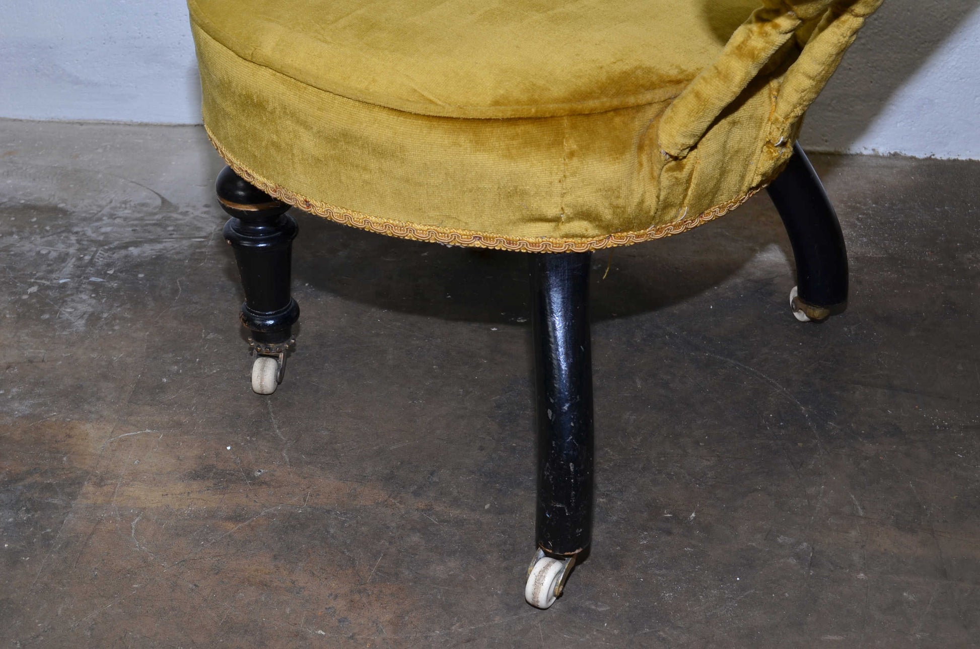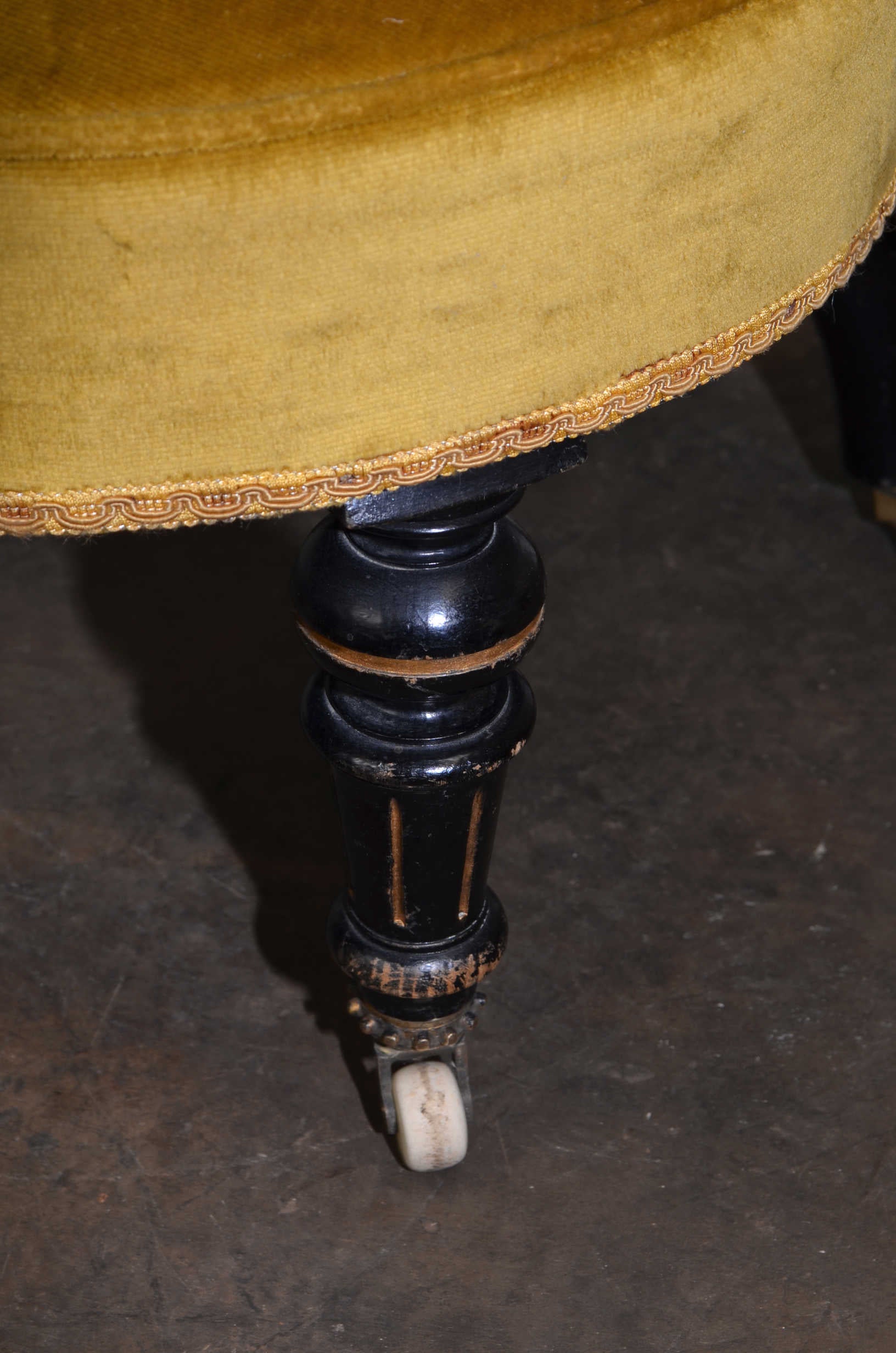 An unusual late Victorian iron frame ladies chair. Wonderful detail to the ebonised legs.