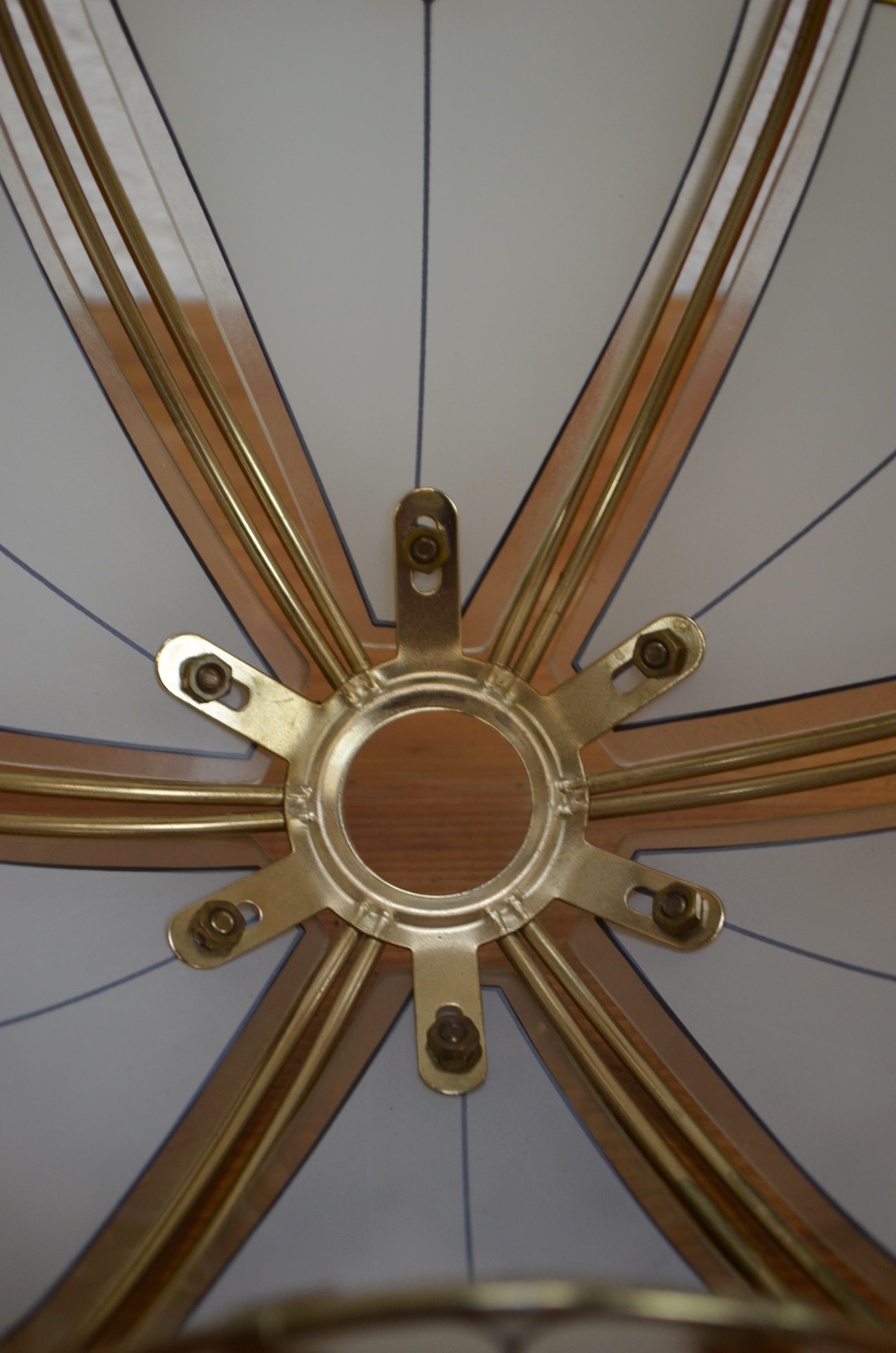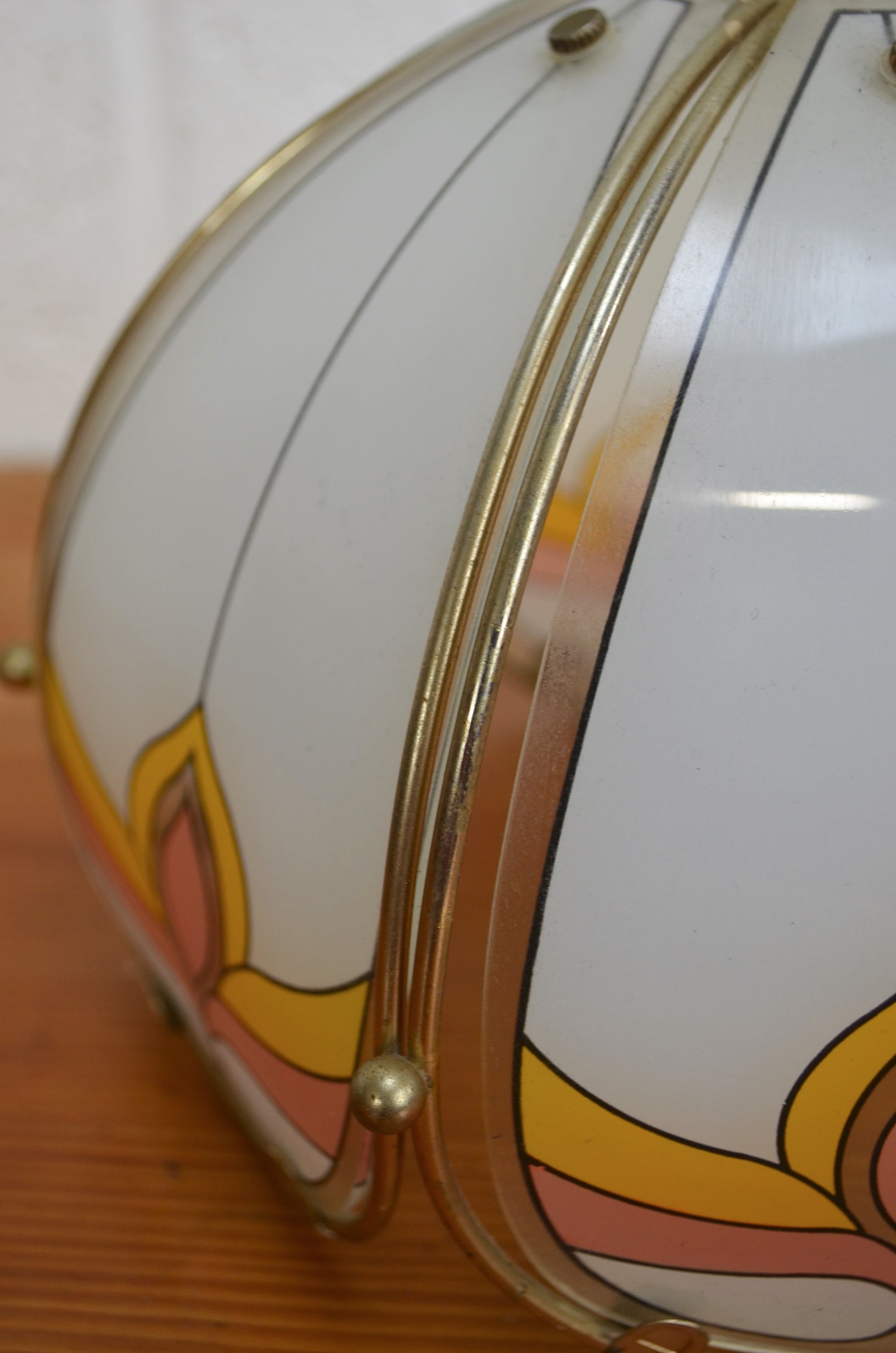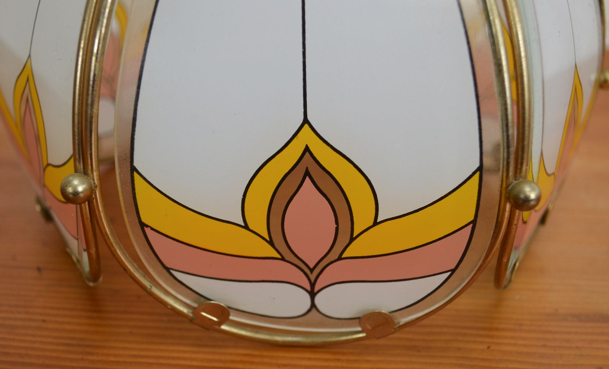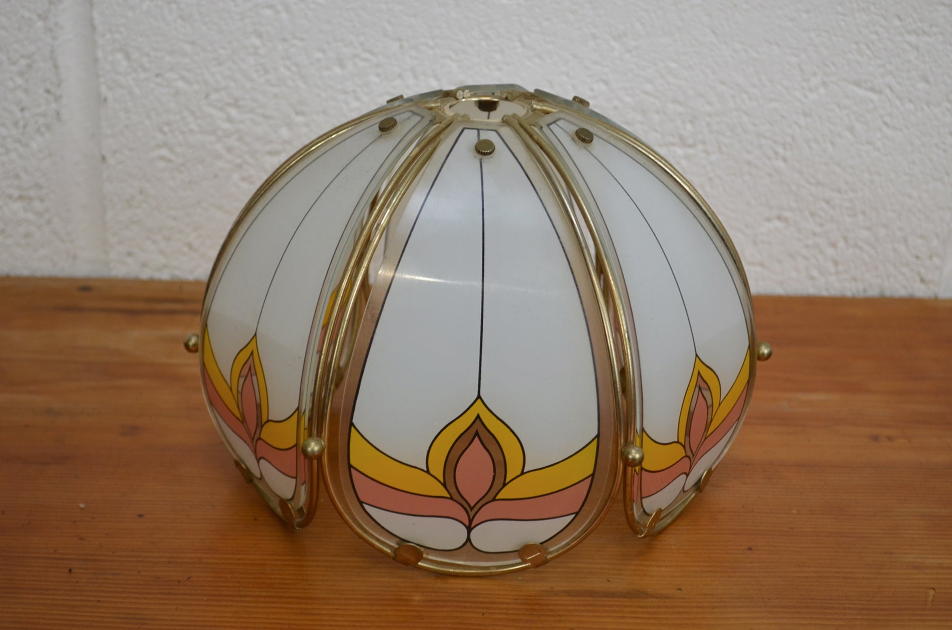 A vintage petal design glass and brass pendant light. Milk glass with a orange flower design to each section around the outside.