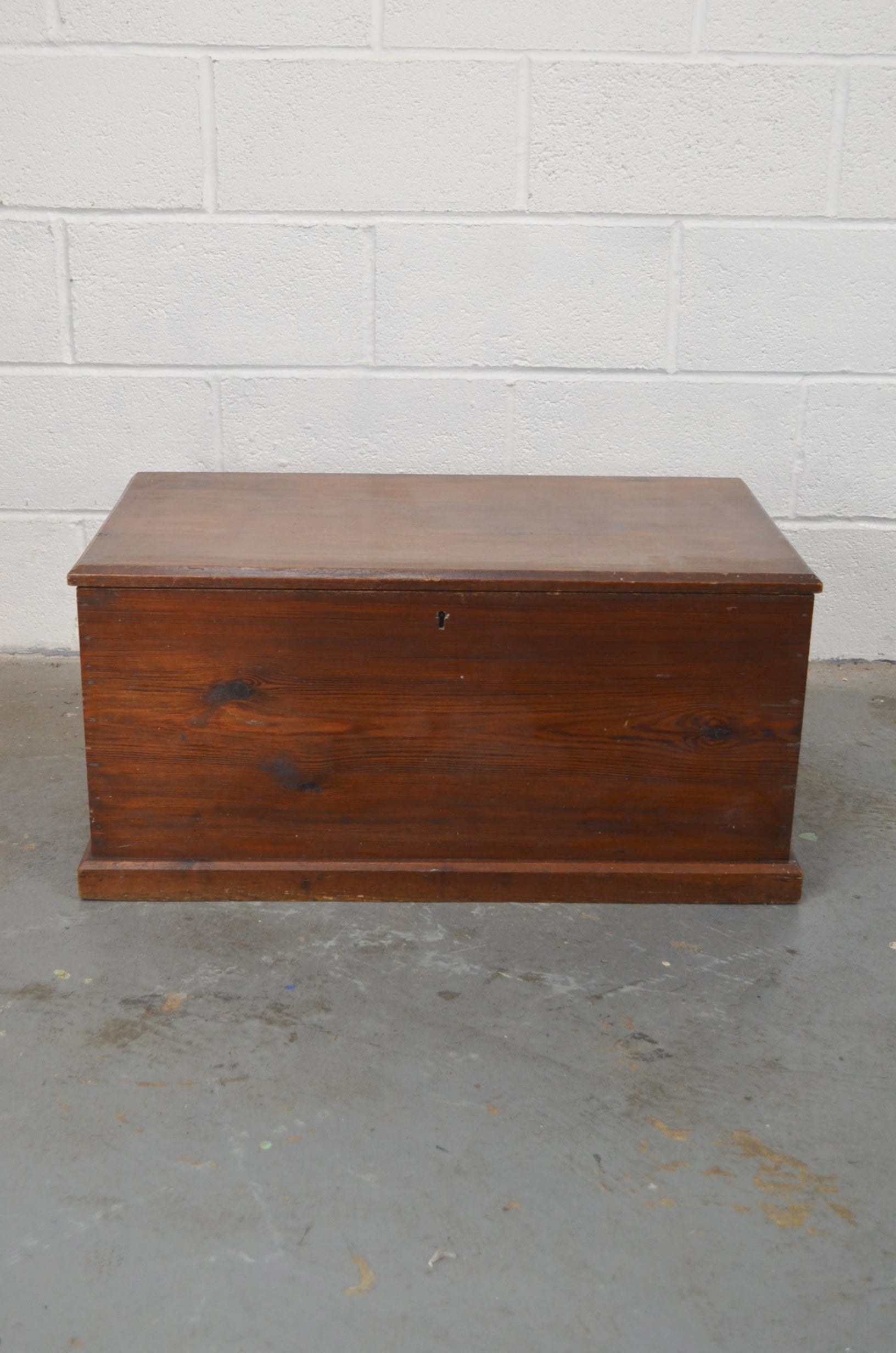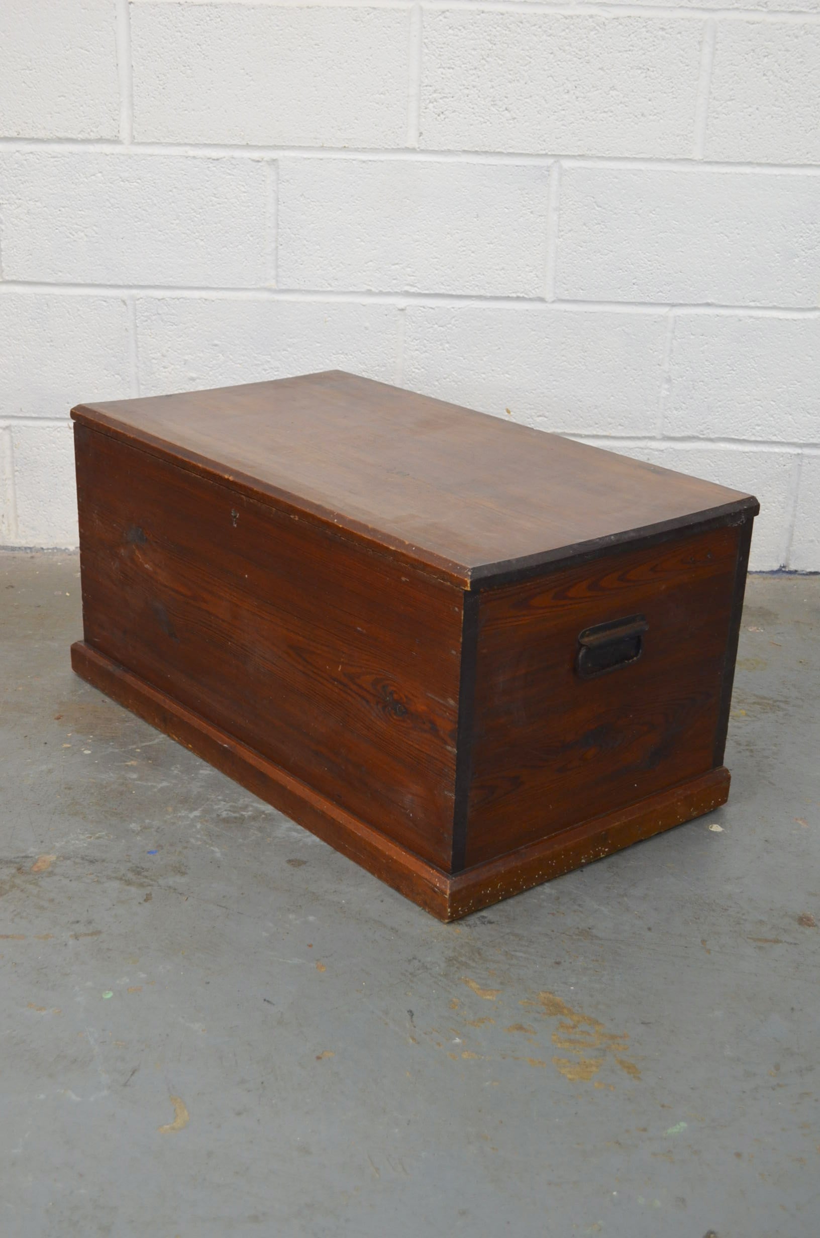 A vintage end of bed stained pine blanket box. Rectangular hinged top opening to a spacious interior with original carry handles.