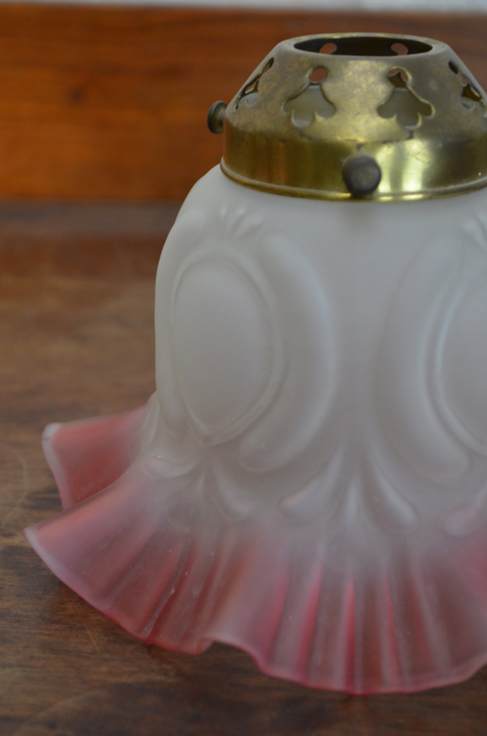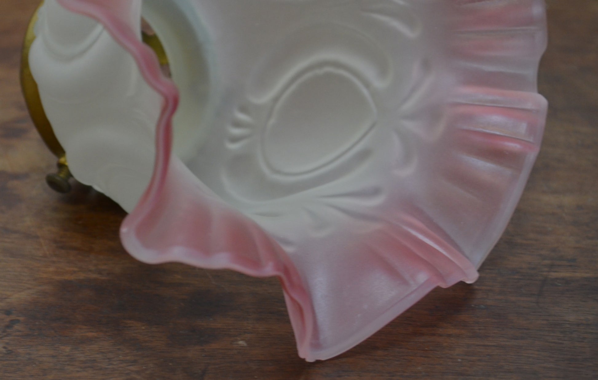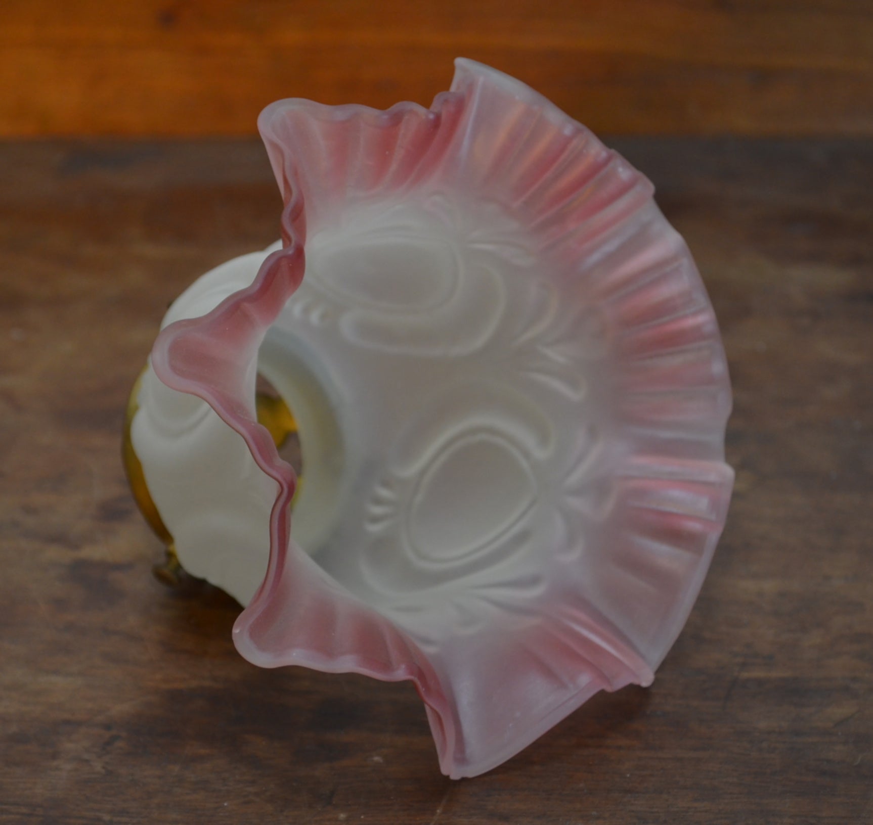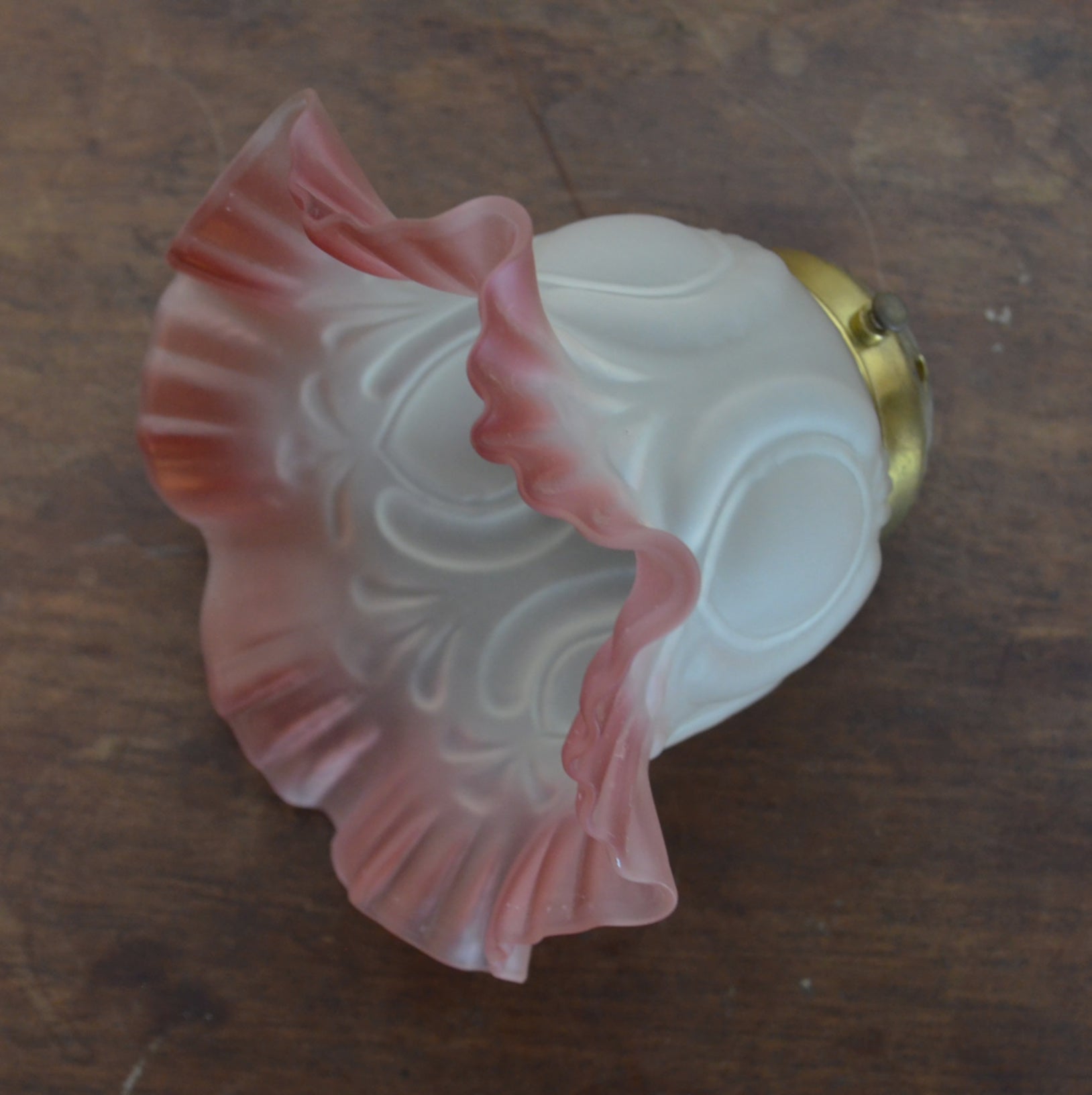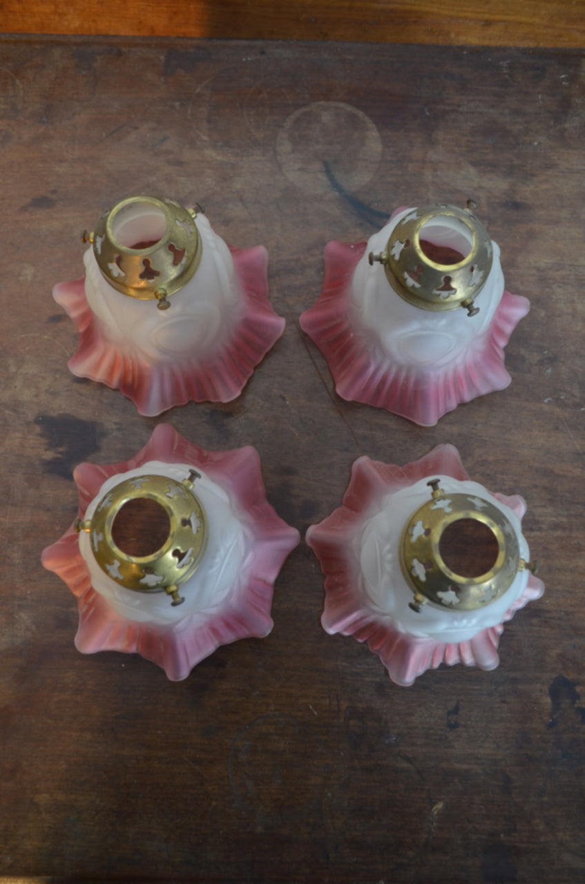 A Victorian Art Nouveau style flower petal, shaped form, ruffled rim with magenta glass decoration. Priced each and for the glass pendant and gallery included.