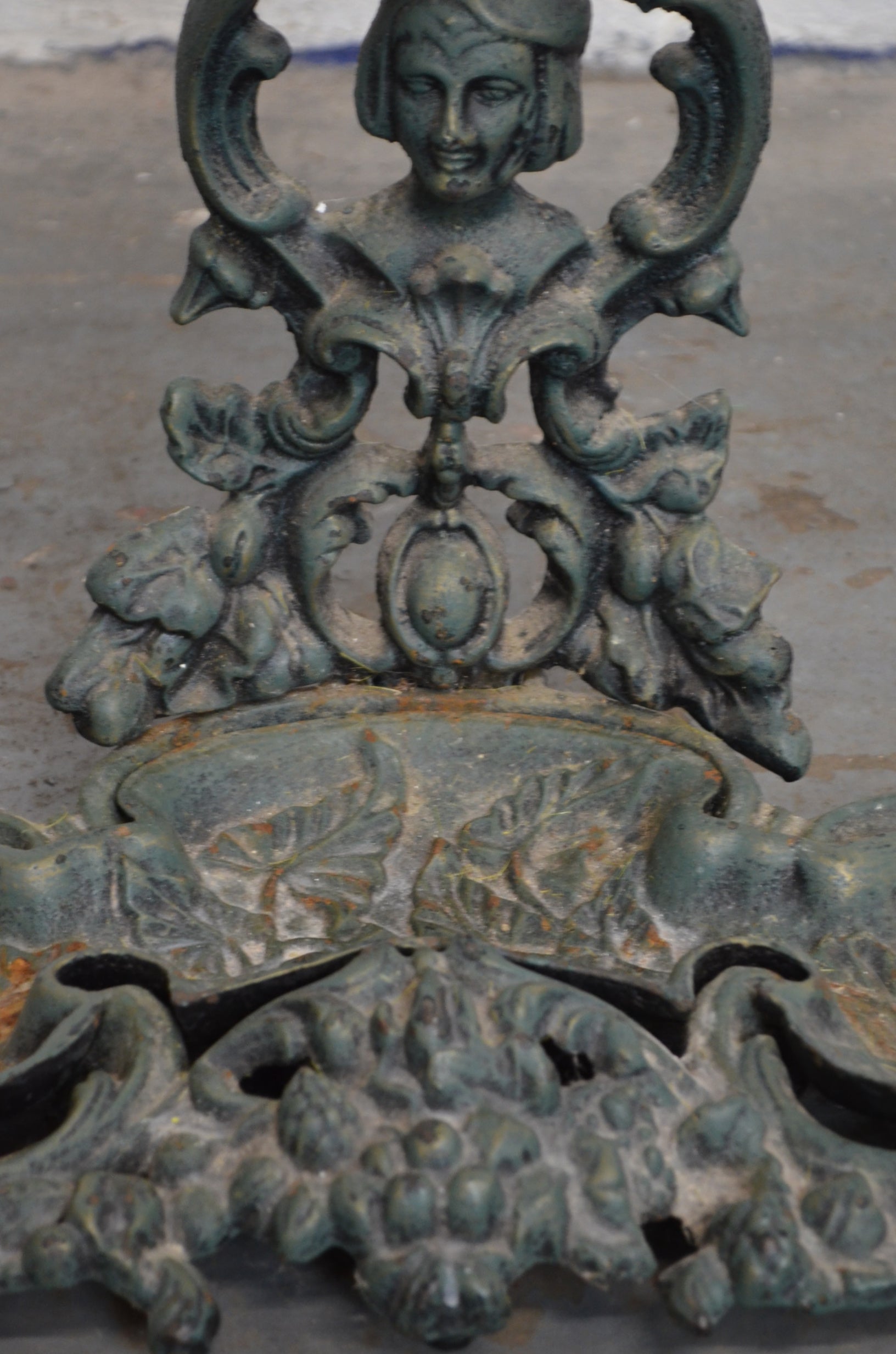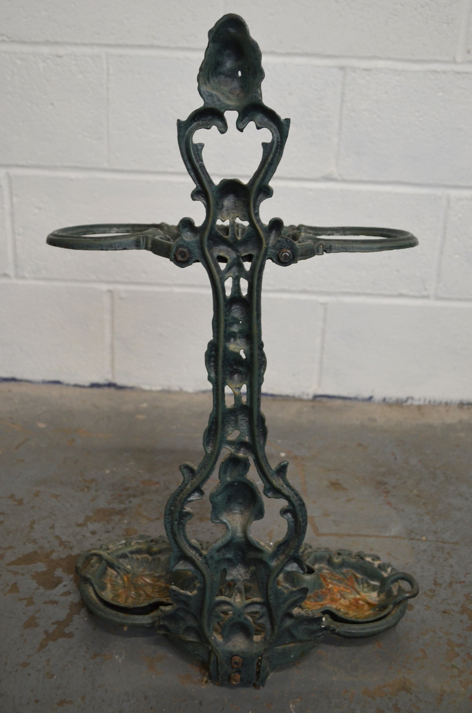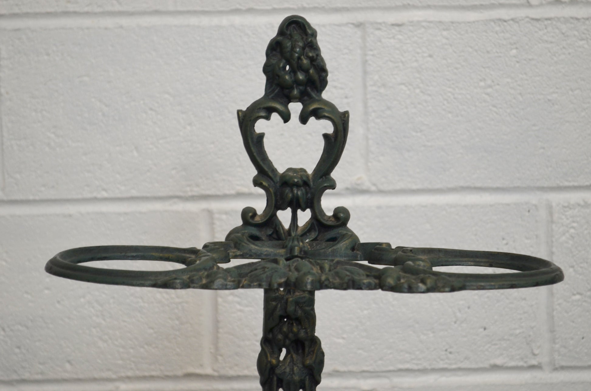 A 19th century Victorian Coalbrookdale painted green cast iron umbrella stick stand having hand to top with trefoil tray to base, with grape and vine decoration.