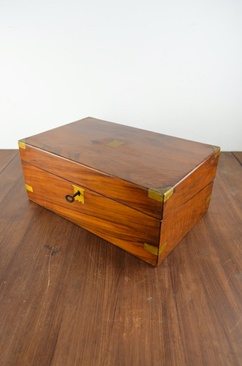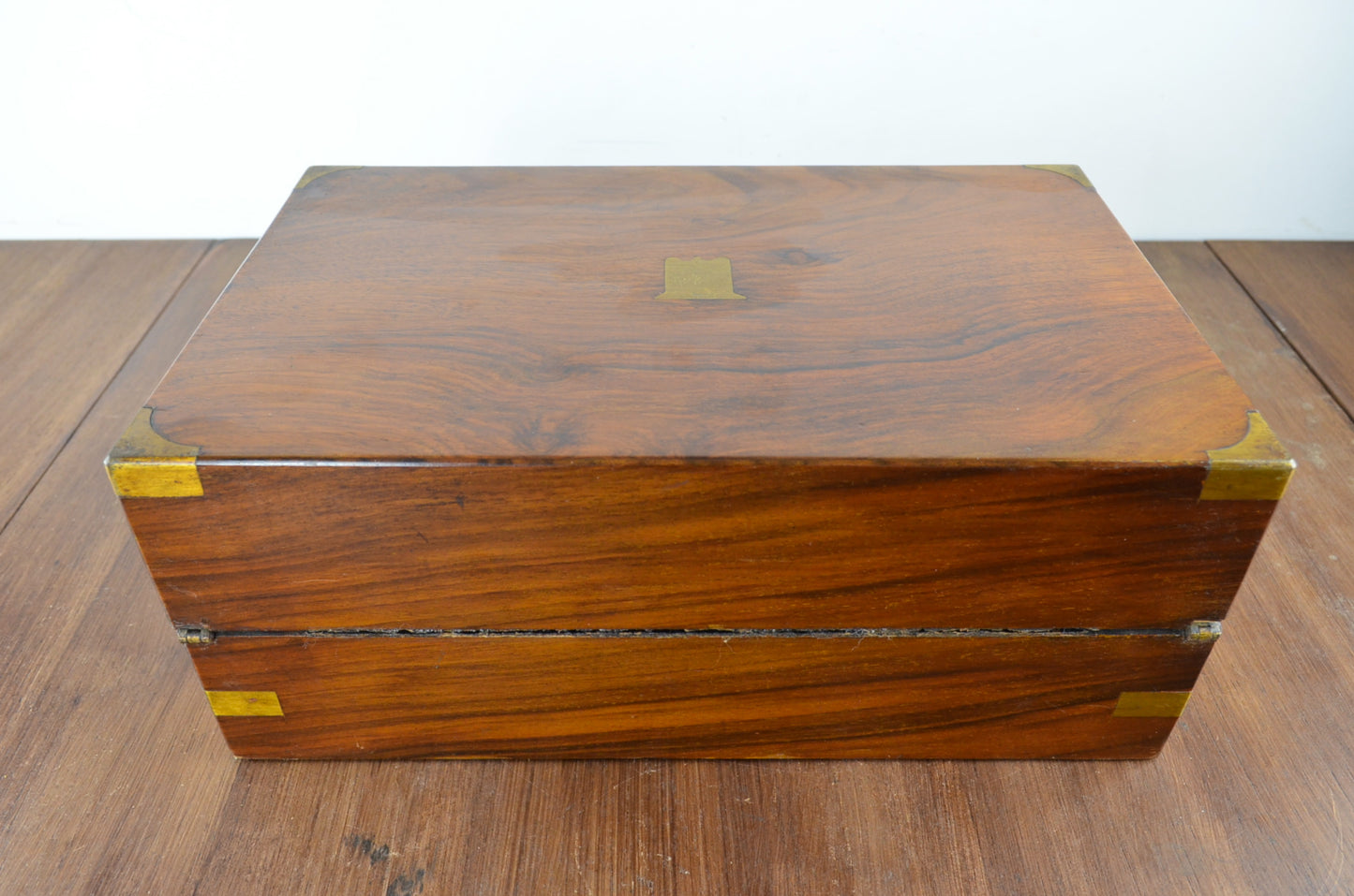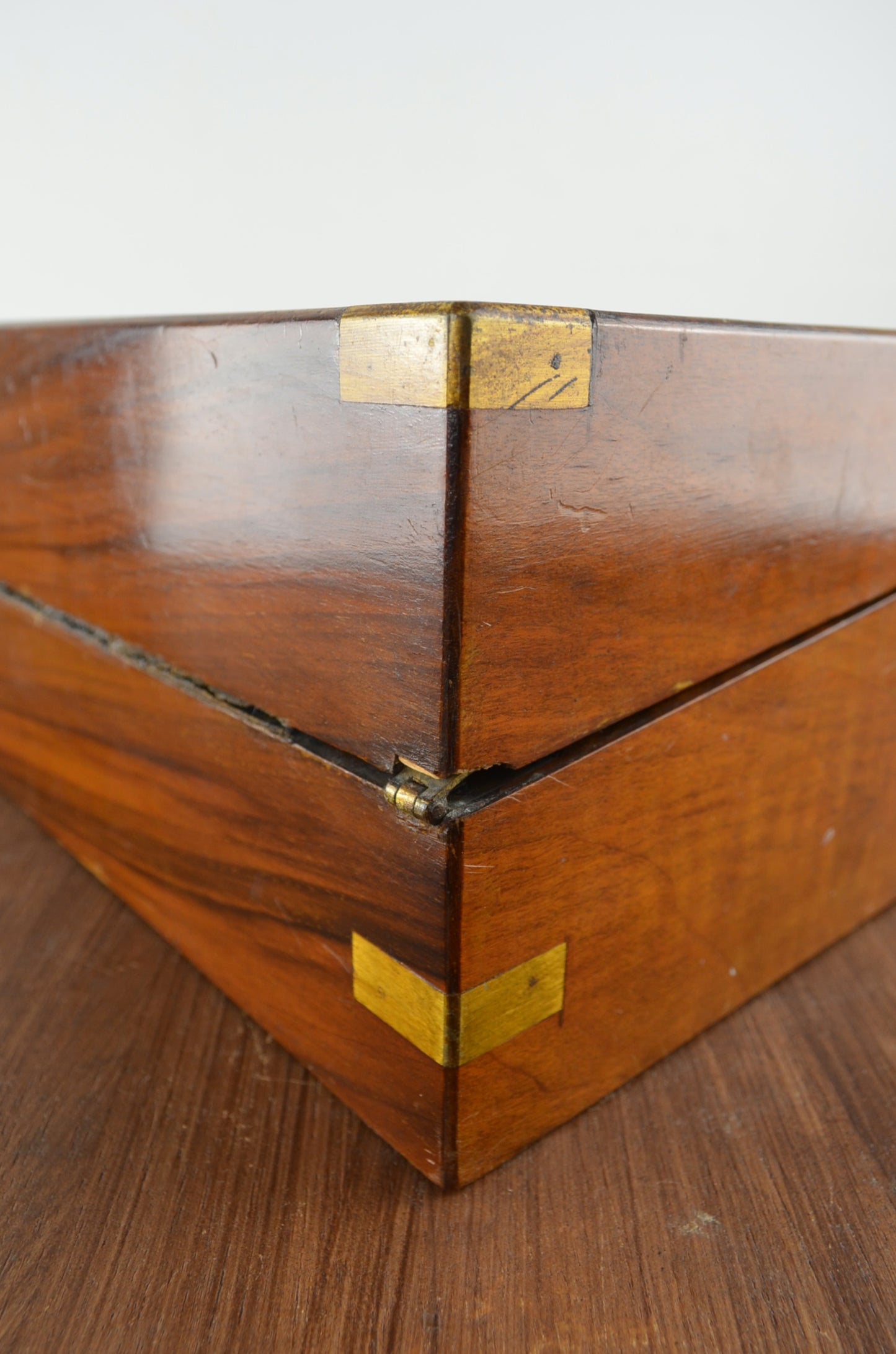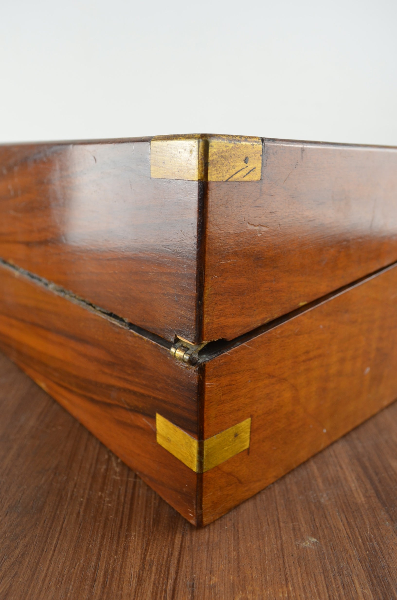 A 19th century Victorian antique walnut writing slope of rectangular form. The walnut and brass box opens to reveal a fully appointed interior with a navy blue writing skiver and gold tooled edges set next to a writing tray and ink slot.
