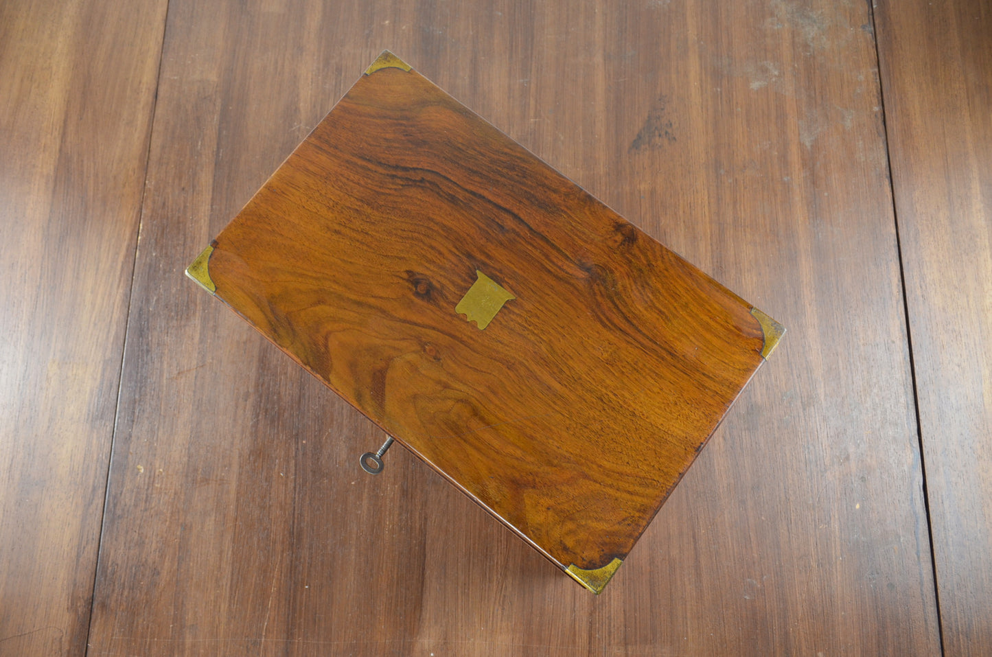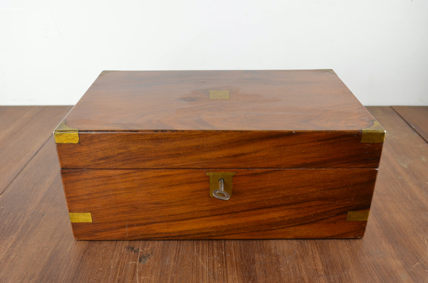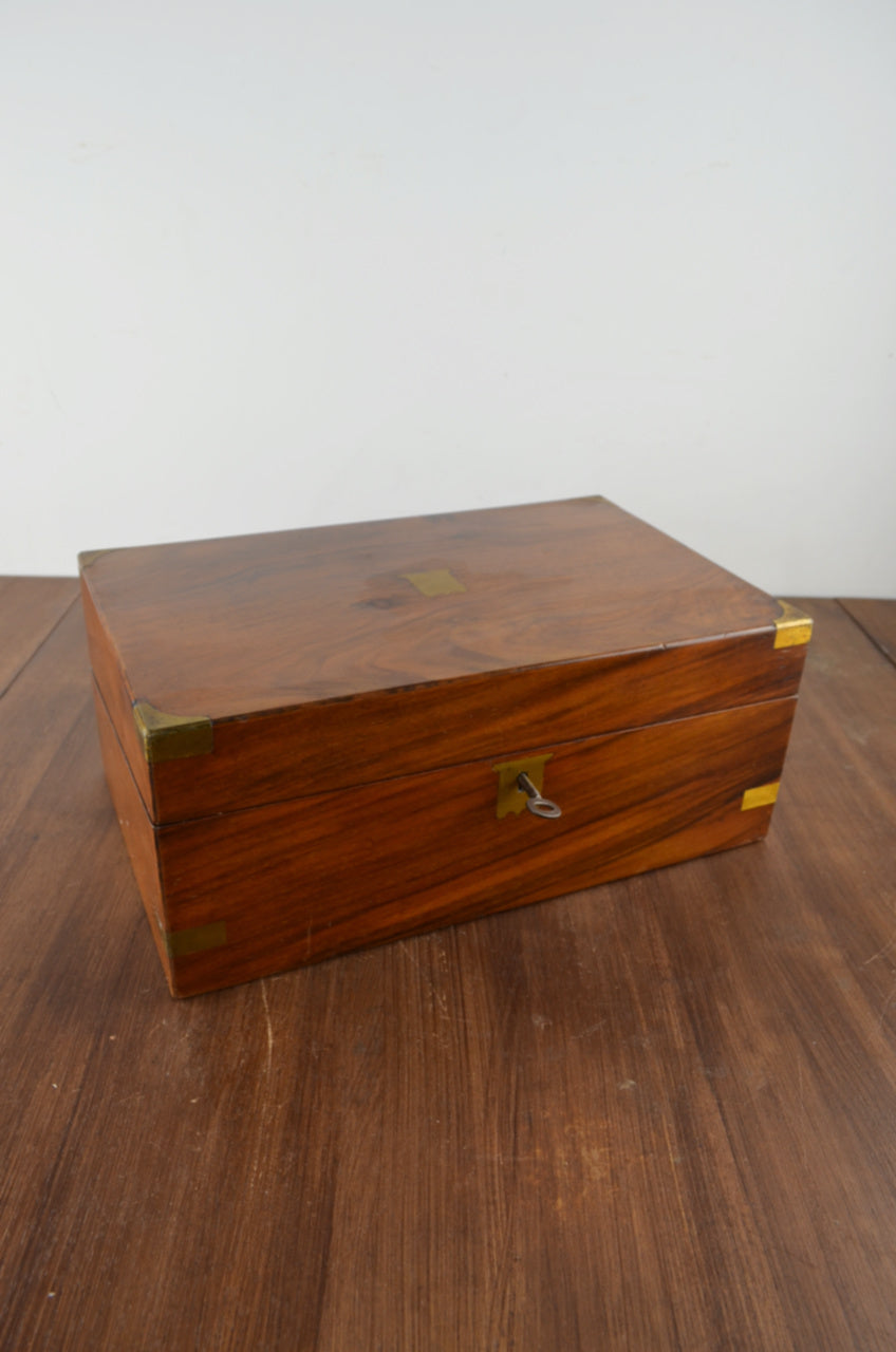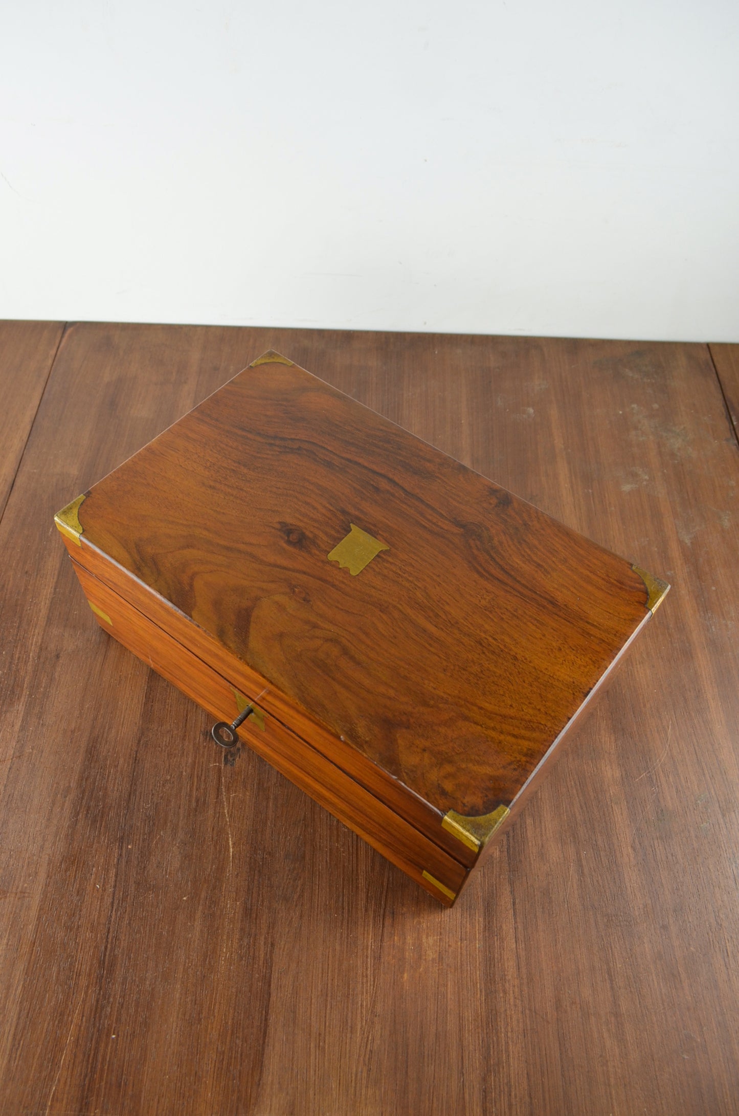 A 19th century Victorian antique walnut writing slope of rectangular form. The walnut and brass box opens to reveal a fully appointed interior with a navy blue writing skiver and gold tooled edges set next to a writing tray and ink slot.
