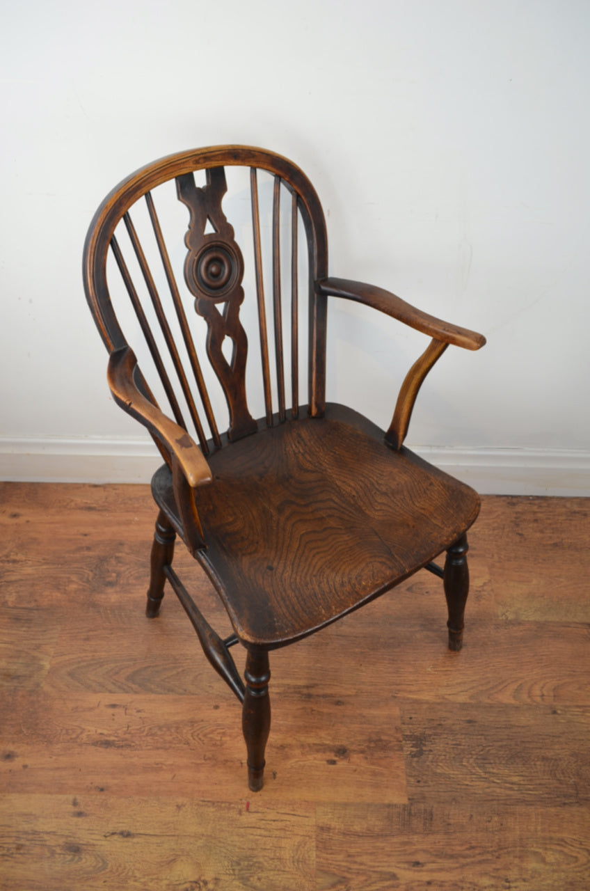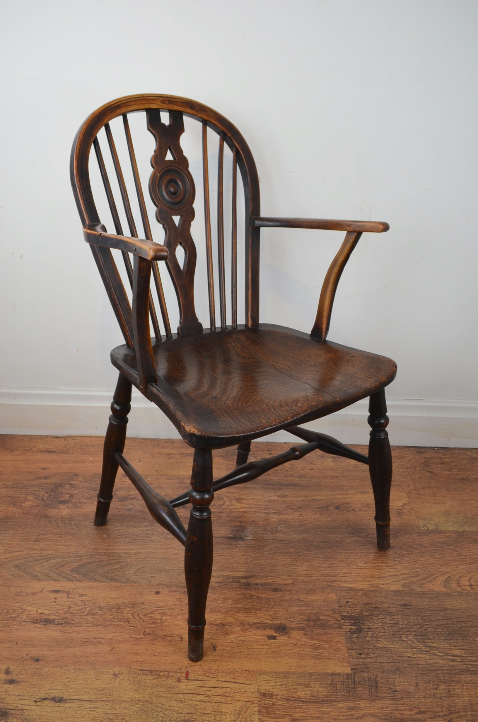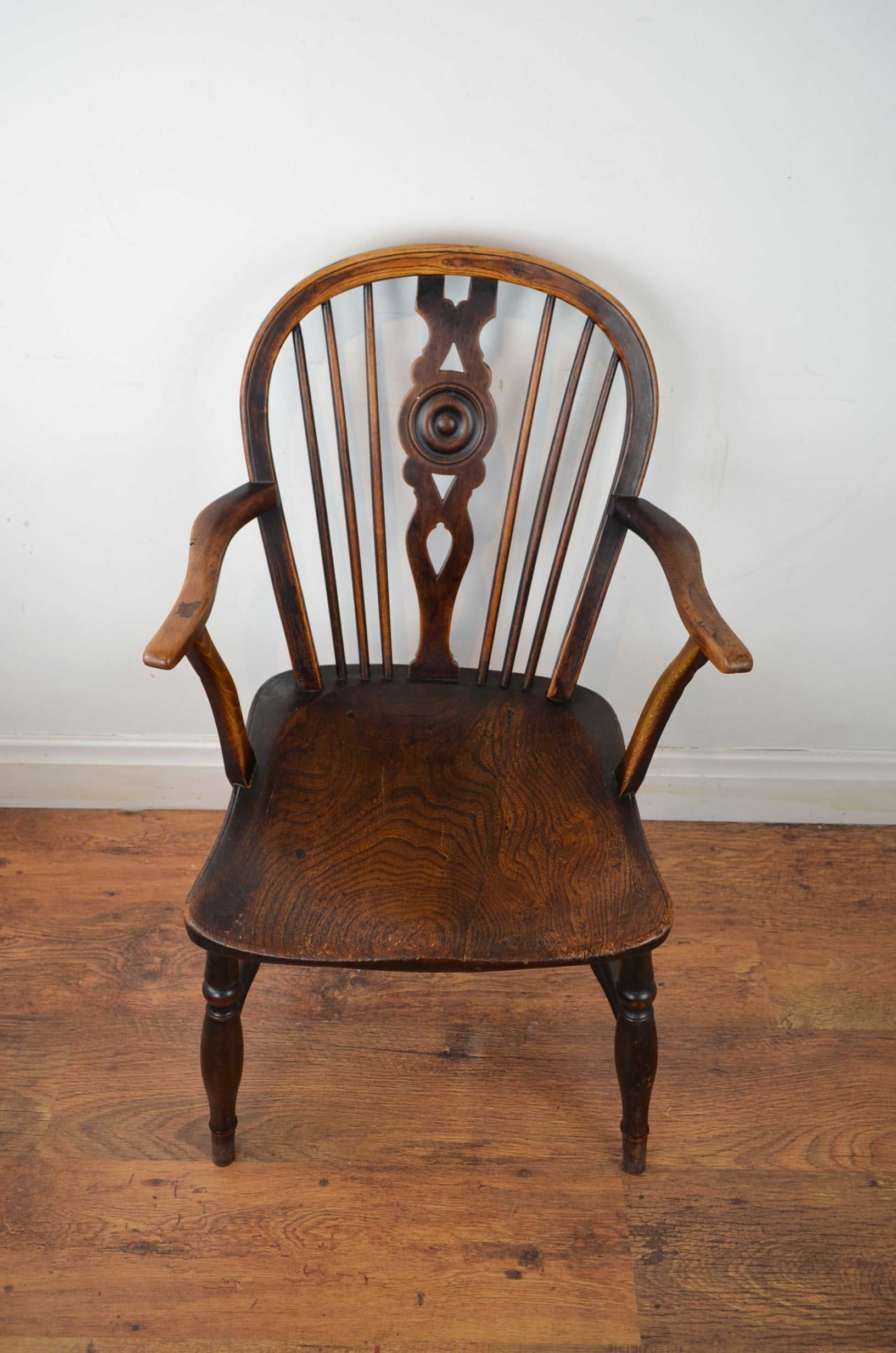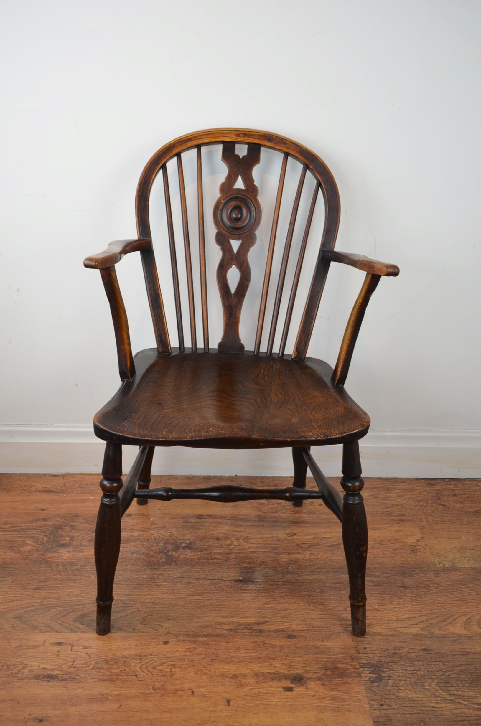 A Victorian beech and elm wheel back carver chair made in a traditional Winsor style. Great patina, with lots of the signs of use and character you would expect with age.