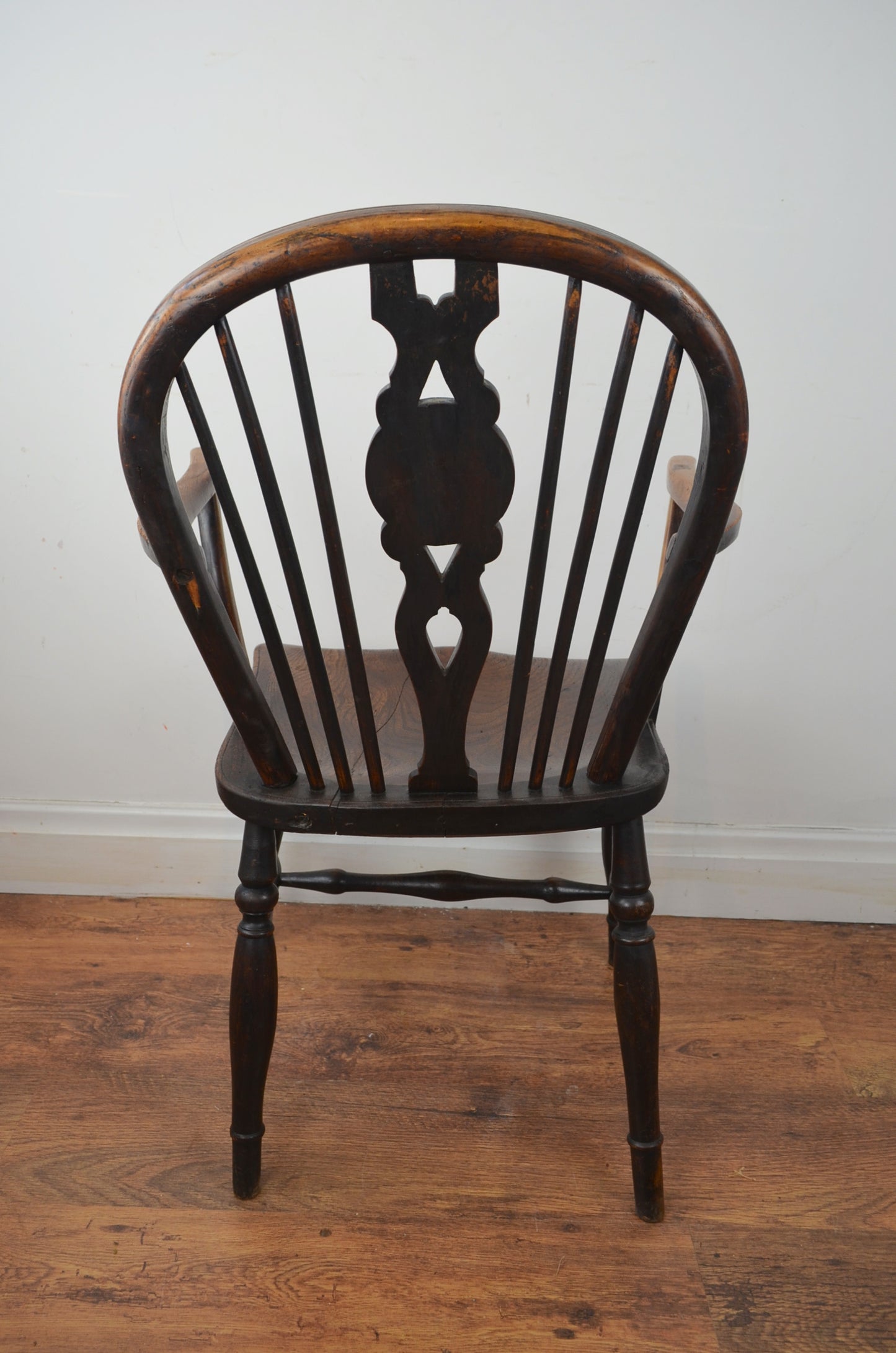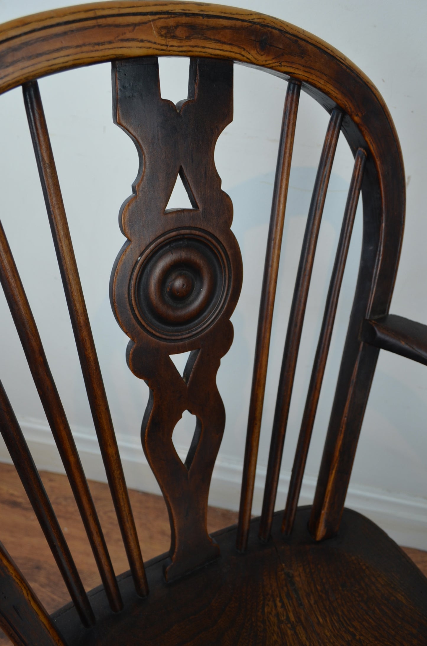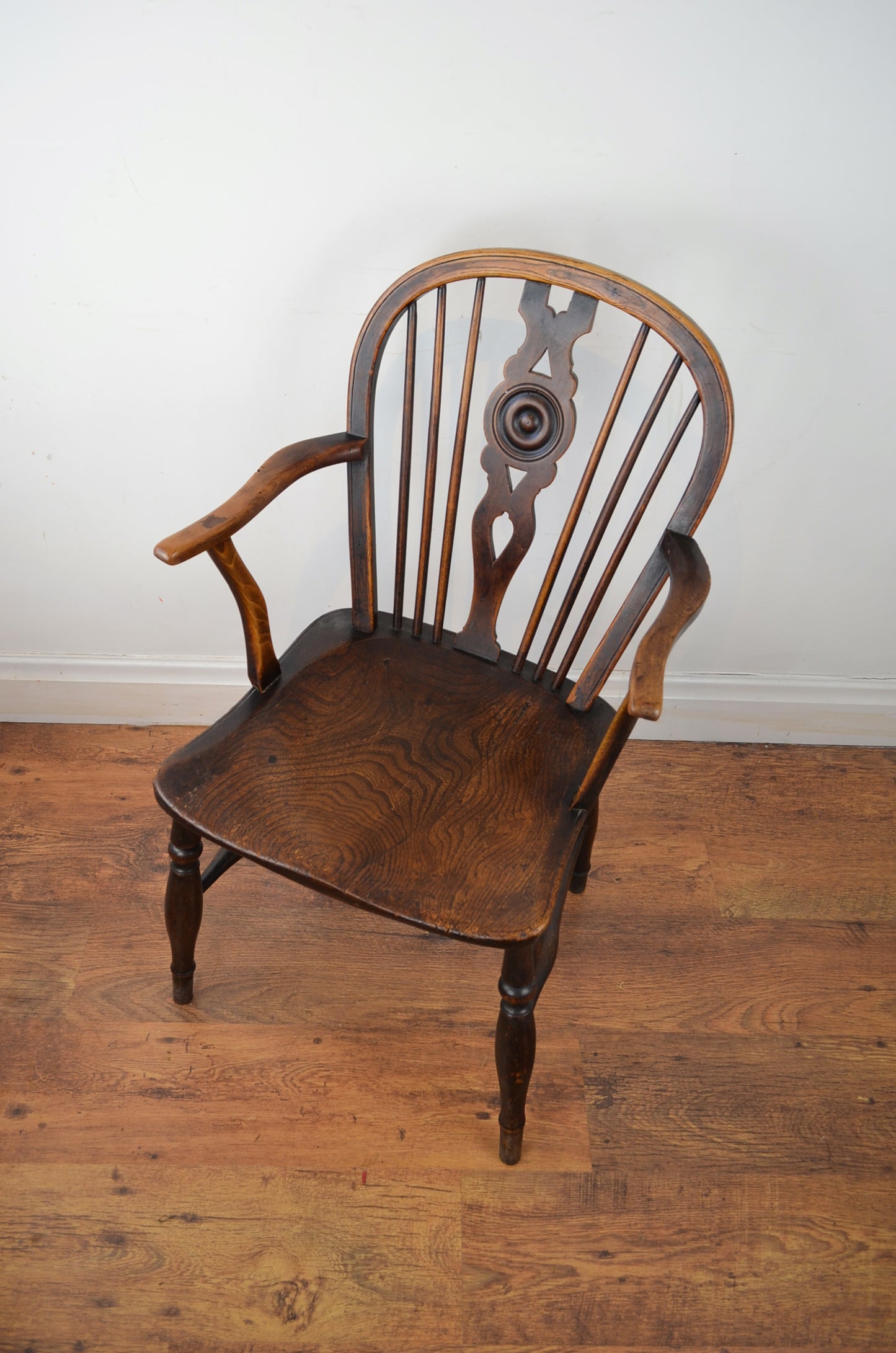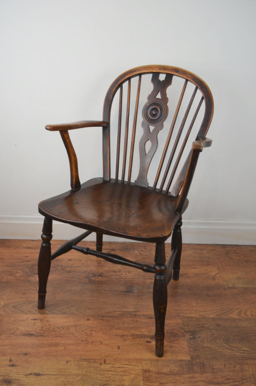 A Victorian beech and elm wheel back carver chair made in a traditional Winsor style. Great patina, with lots of the signs of use and character you would expect with age.