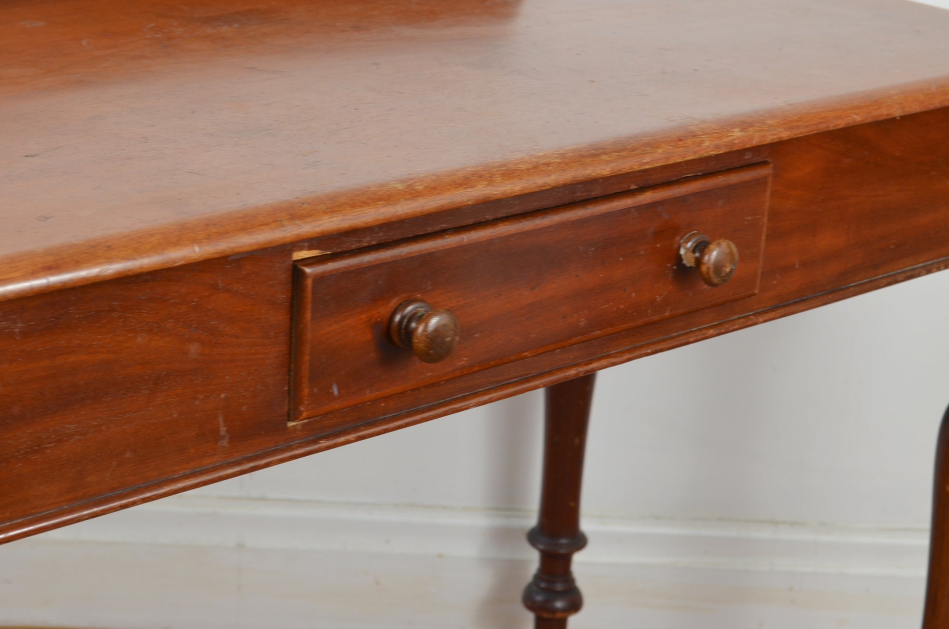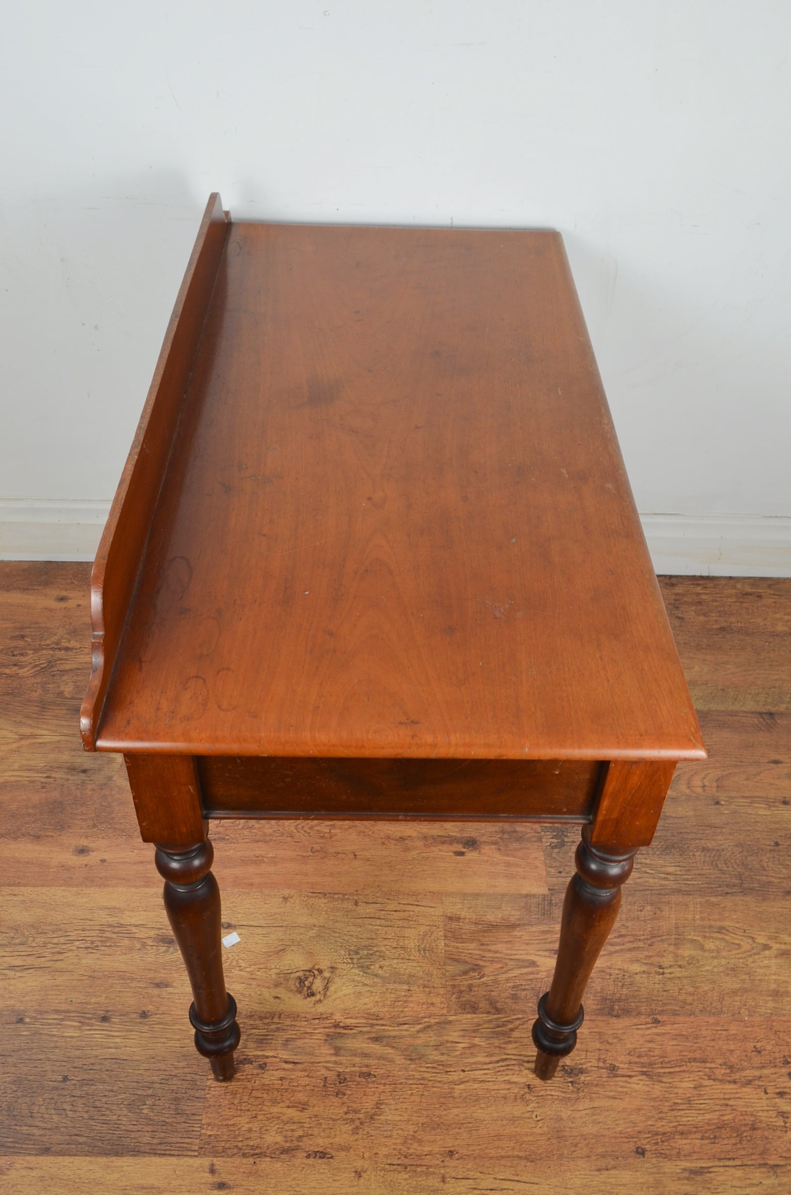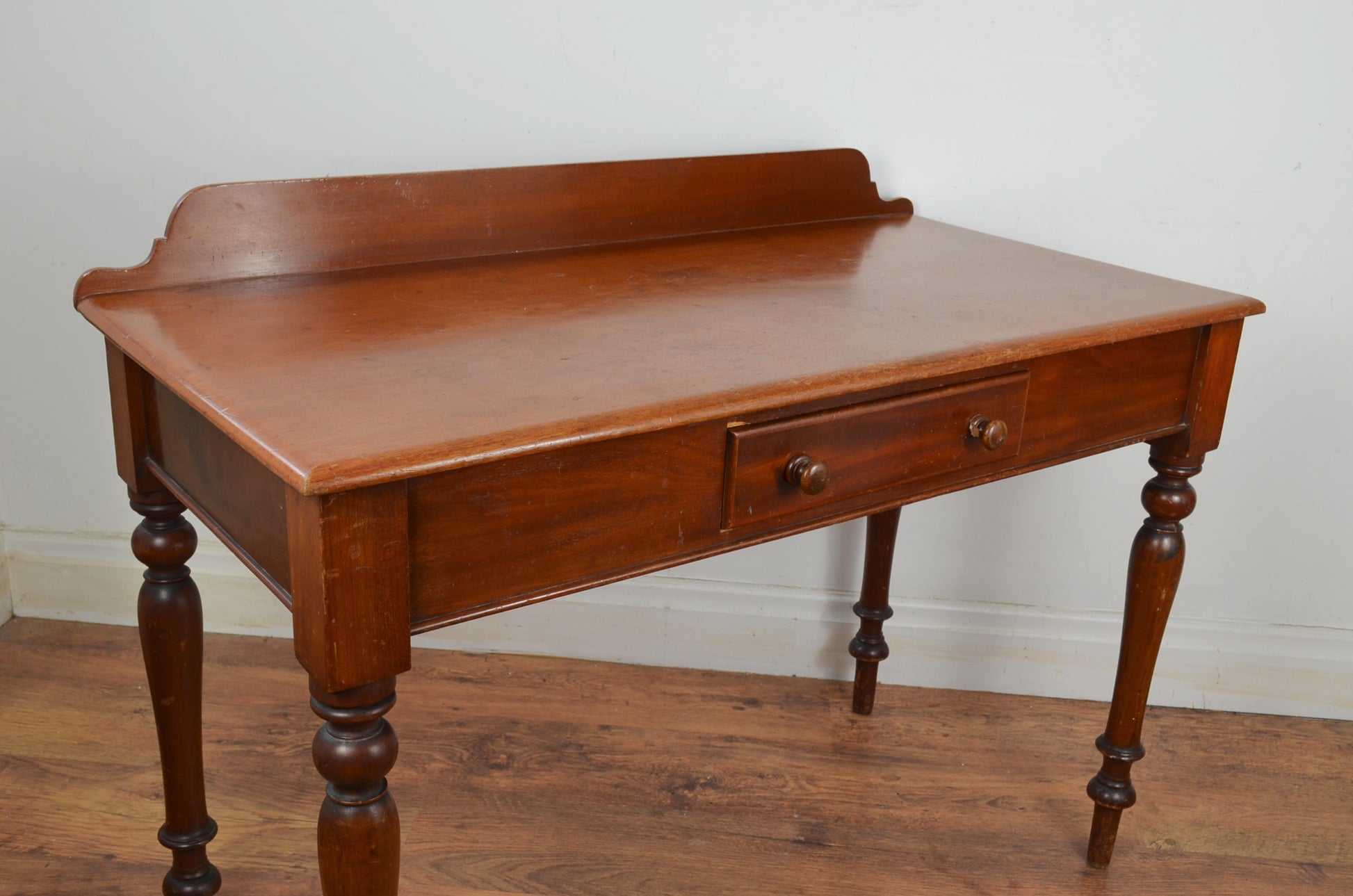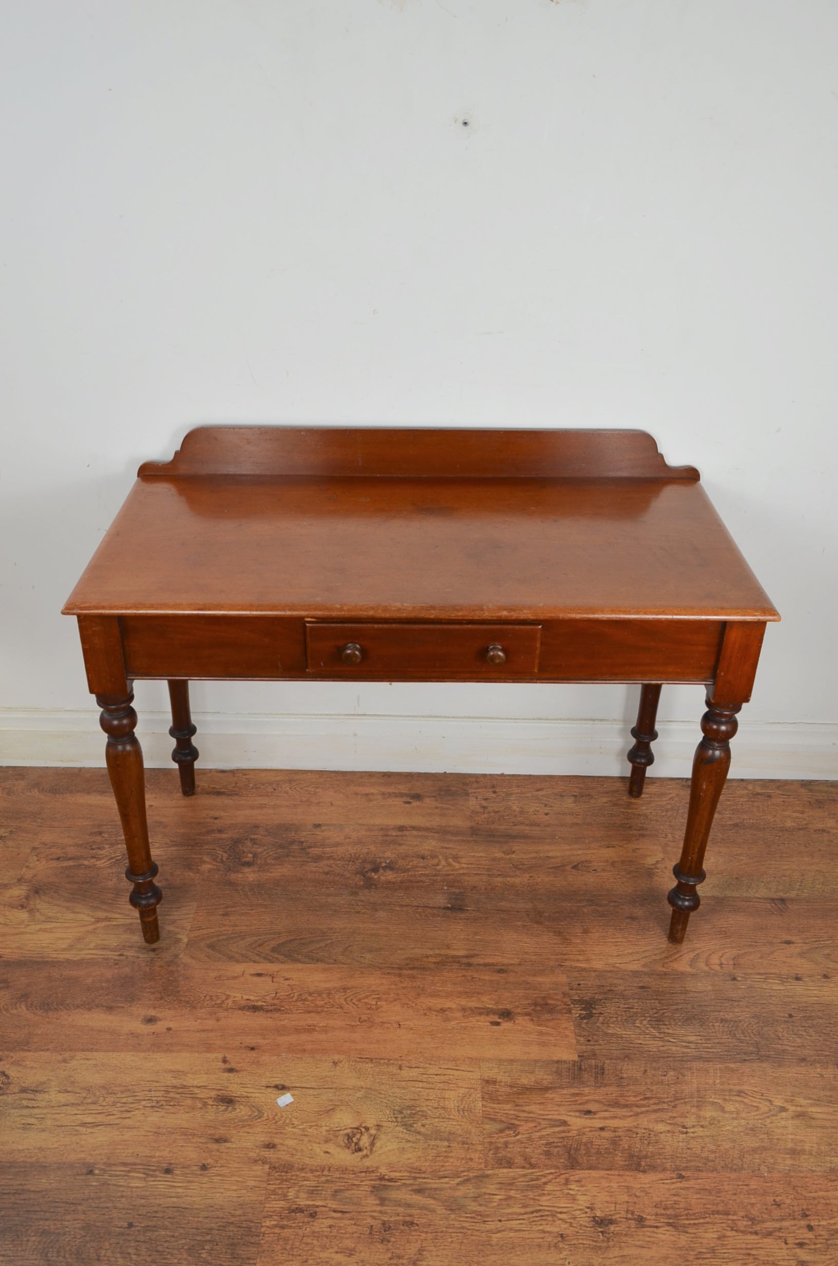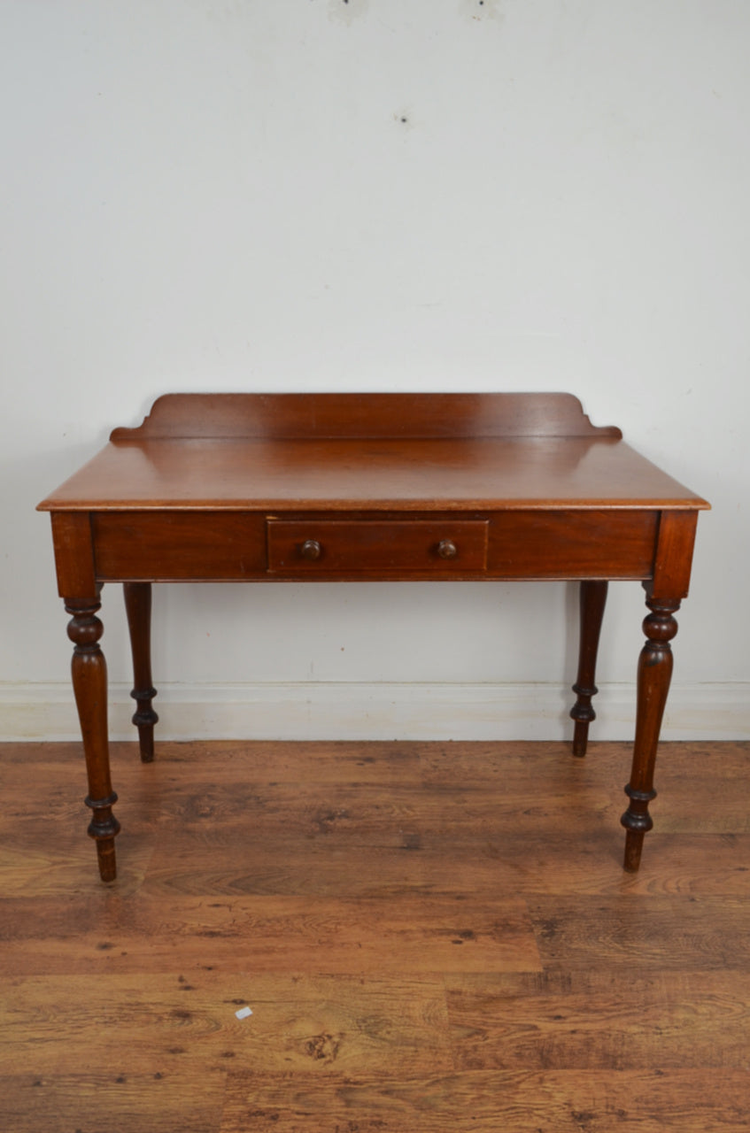Victorian mahogany writing table/washstand, the top with a gallery back over a single frieze drawer upon turned legs.